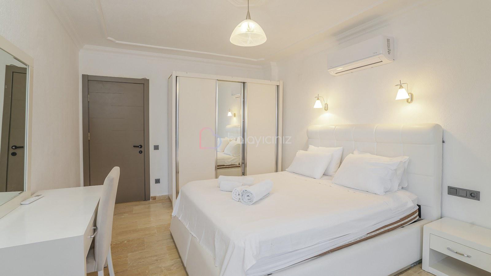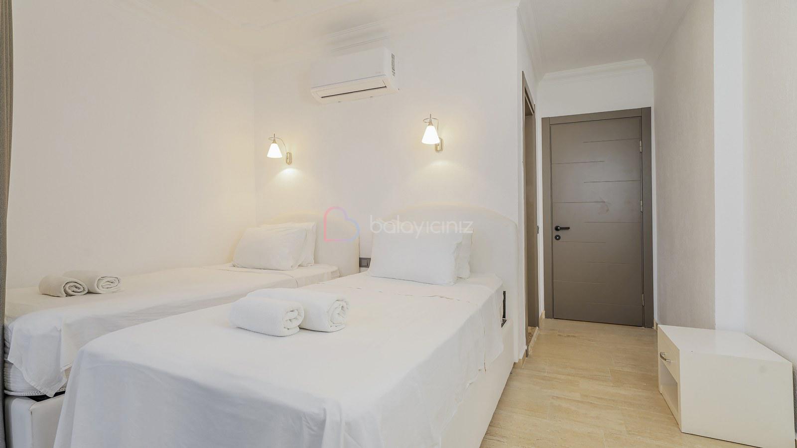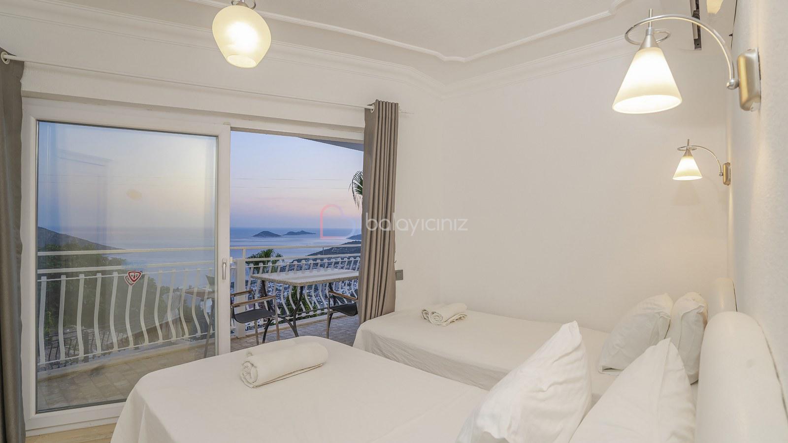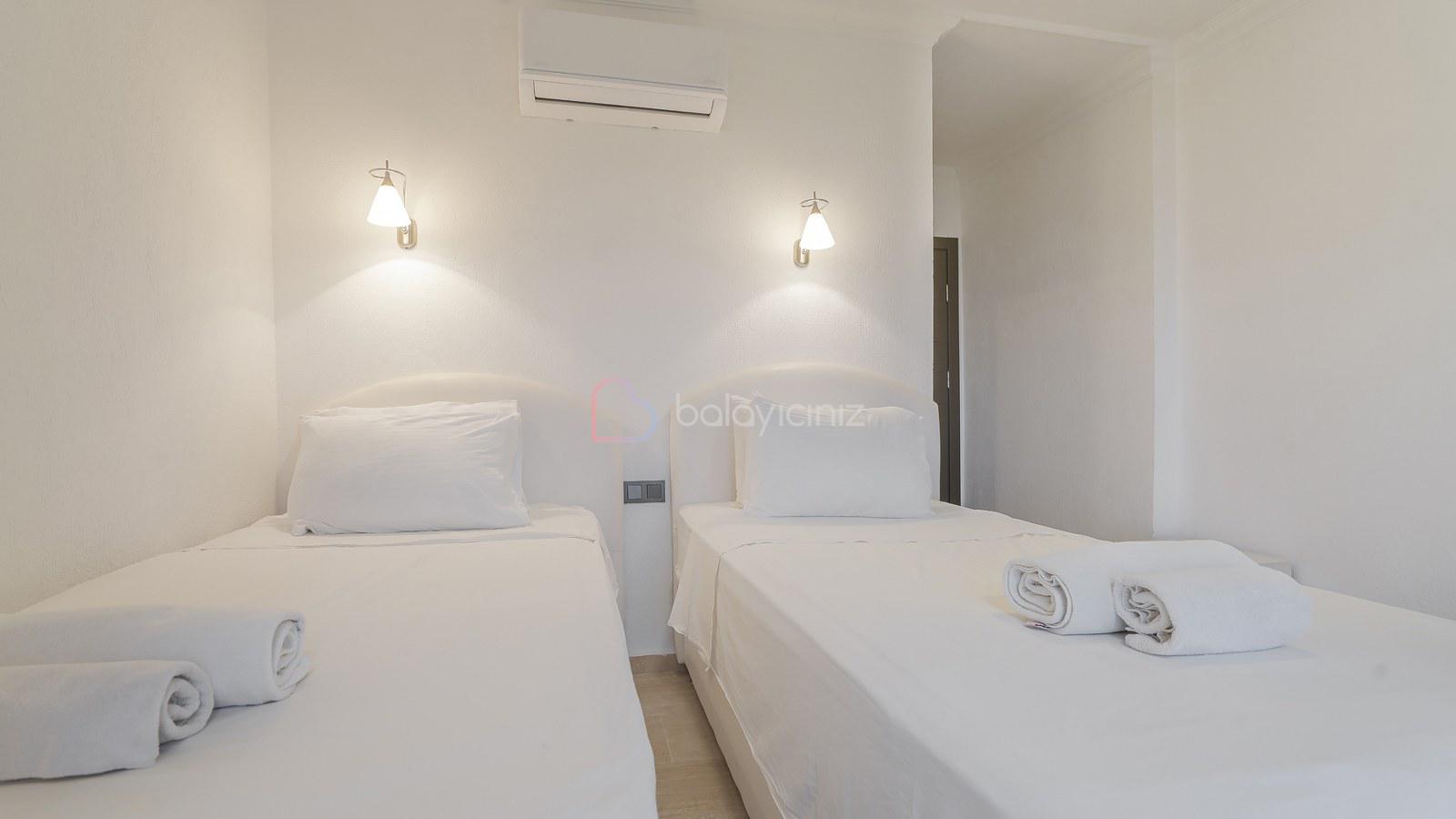 3. Yatak Odası (1.Kat) : Süit oda, 2 adet tek kişilik yatak, elbise dolabı, komodin, makyaj masası, klima, banyo, saç kurutma makinesi ve deniz manzarasına sahip balkon bulunmaktadır.