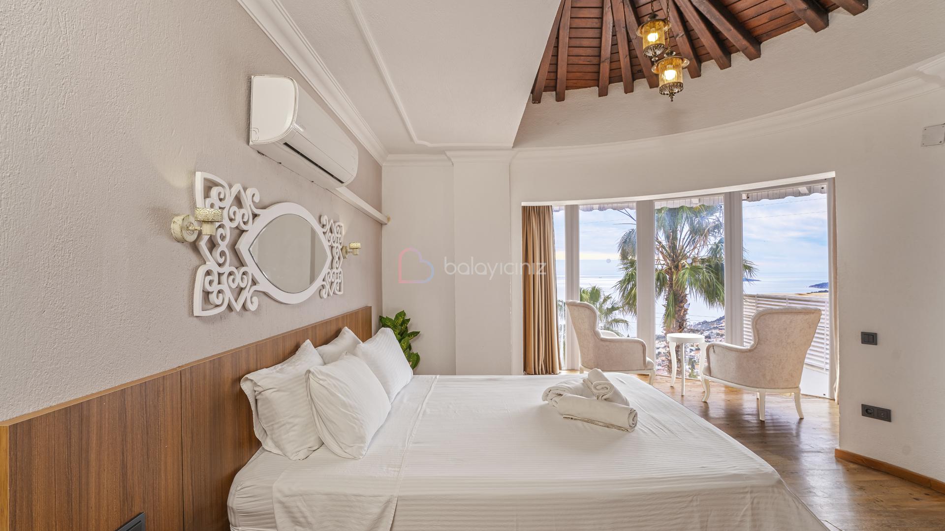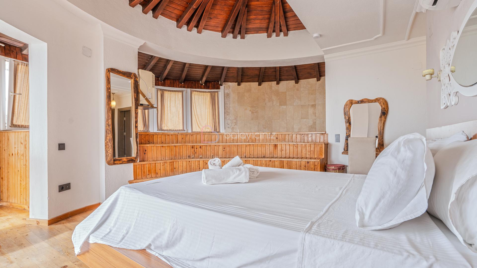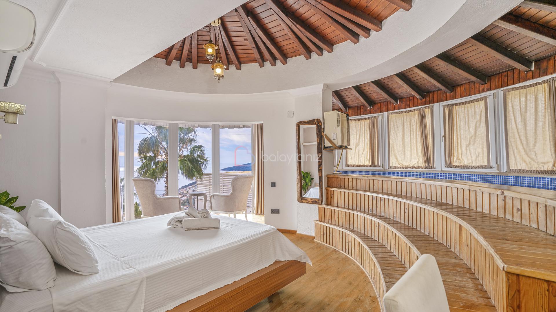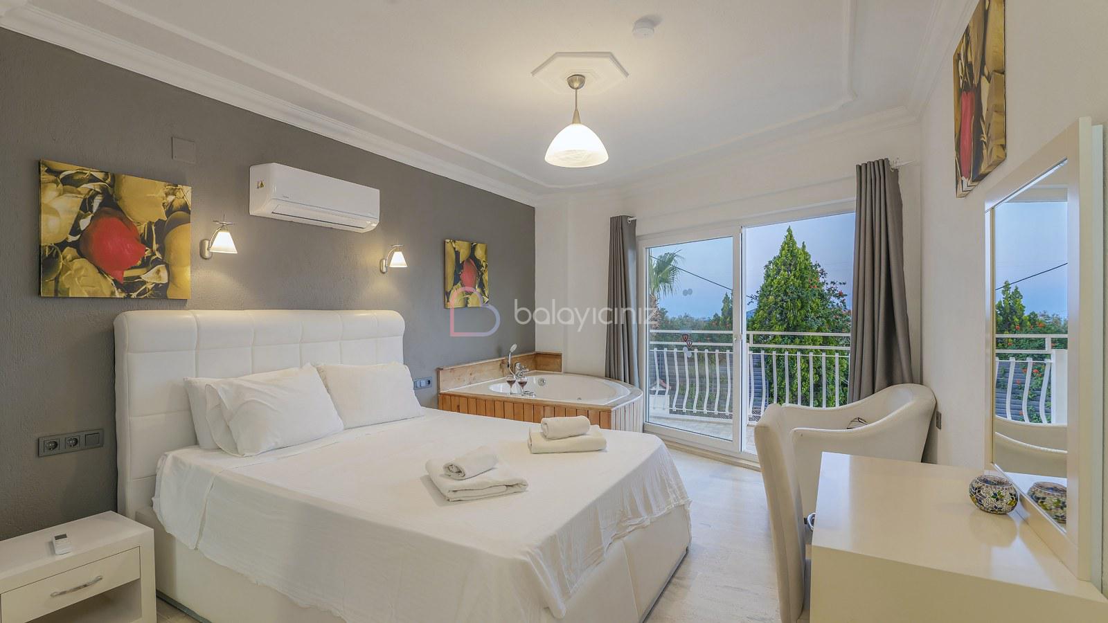 2. Yatak Odası (1.Kat) : Master Süit oda, 1 adet çift kişilik yuvarlak yatak, elbise dolabı, komodin, makyaj masası, klima, banyo, jakuzi, ısıtmalı kapalı havuz, saç kurutma makinesi ve deniz manzarasına sahip balkon bulunmaktadır.
