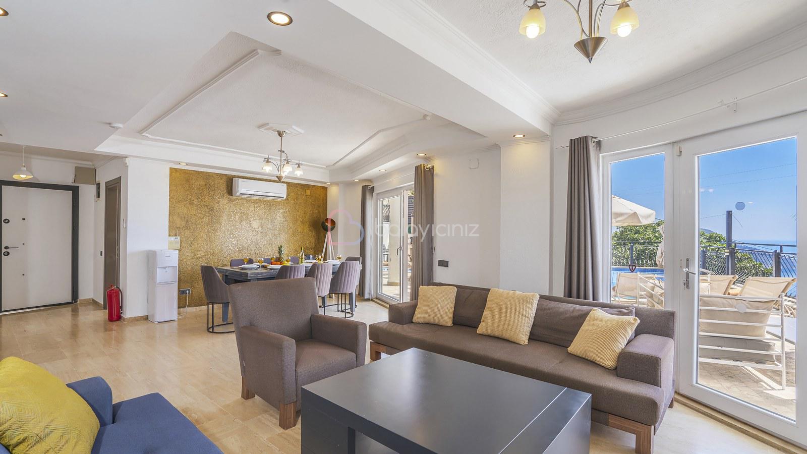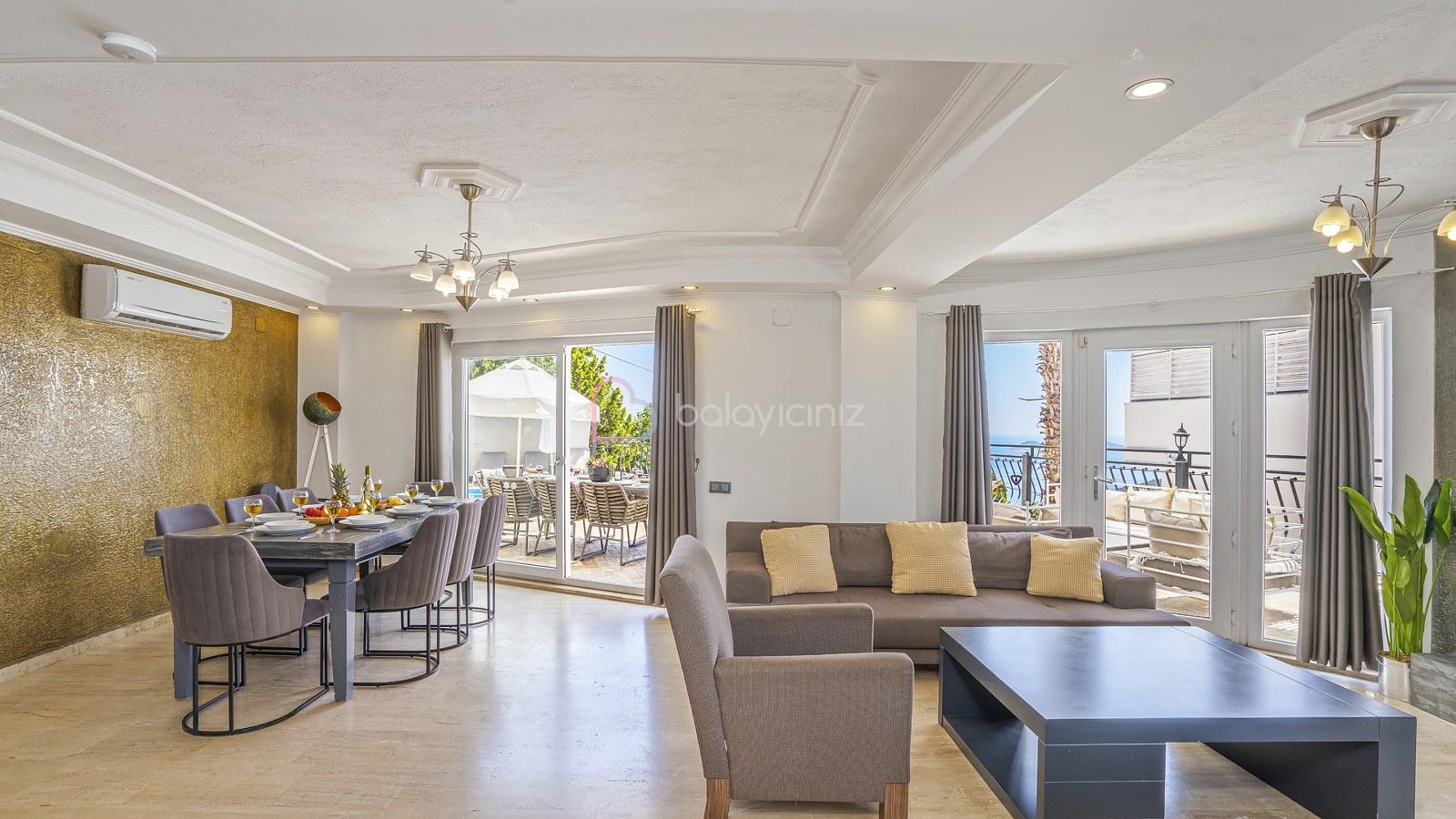 Villa salonu klimalı ve deniz manzaralıdır. Şık dekore edilmiş salonda elektrik süpürgesi, modern oturma grubu, uydu alıcı, LCD TV, DVD Player, ütü ve ütü masası ve lavabo yer almaktadır. Salondan havuz kenarına çıkış bulunmaktadır. Salon havuz katındadır.
