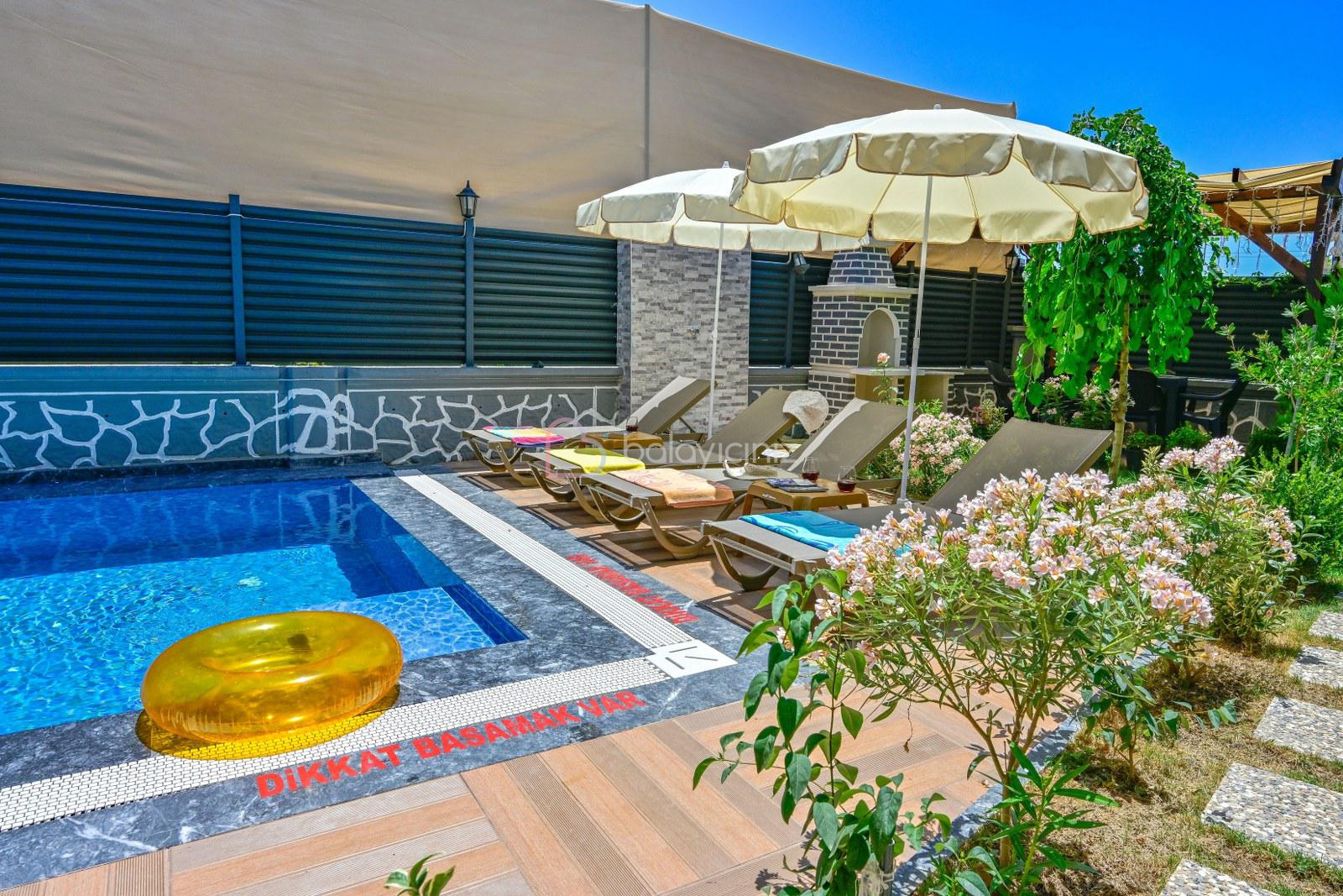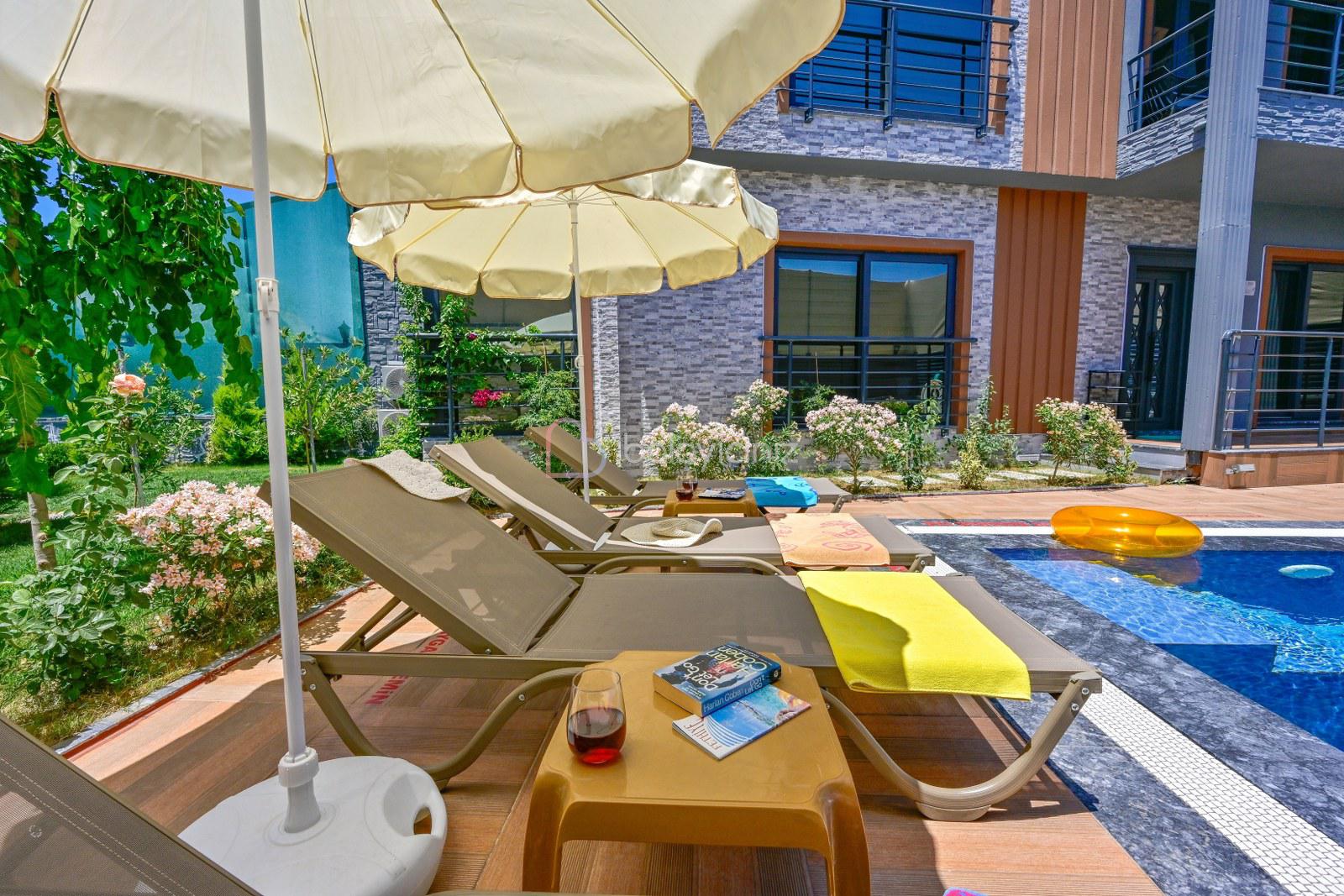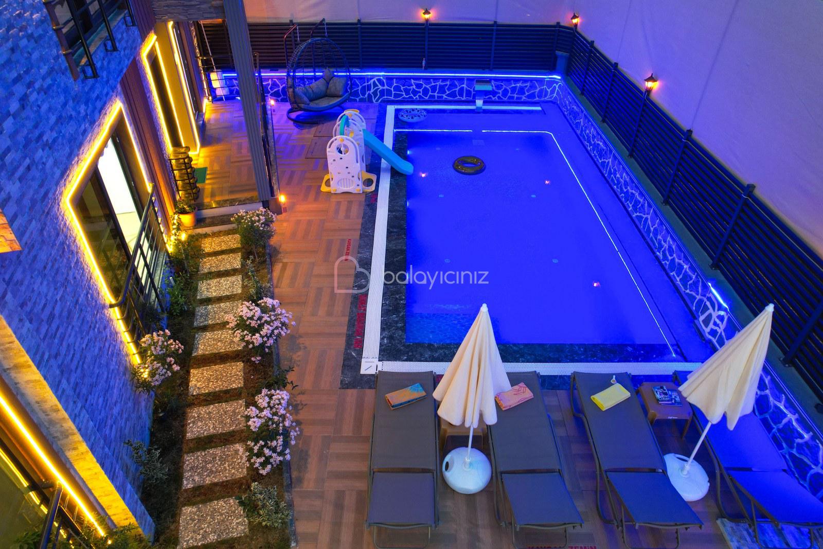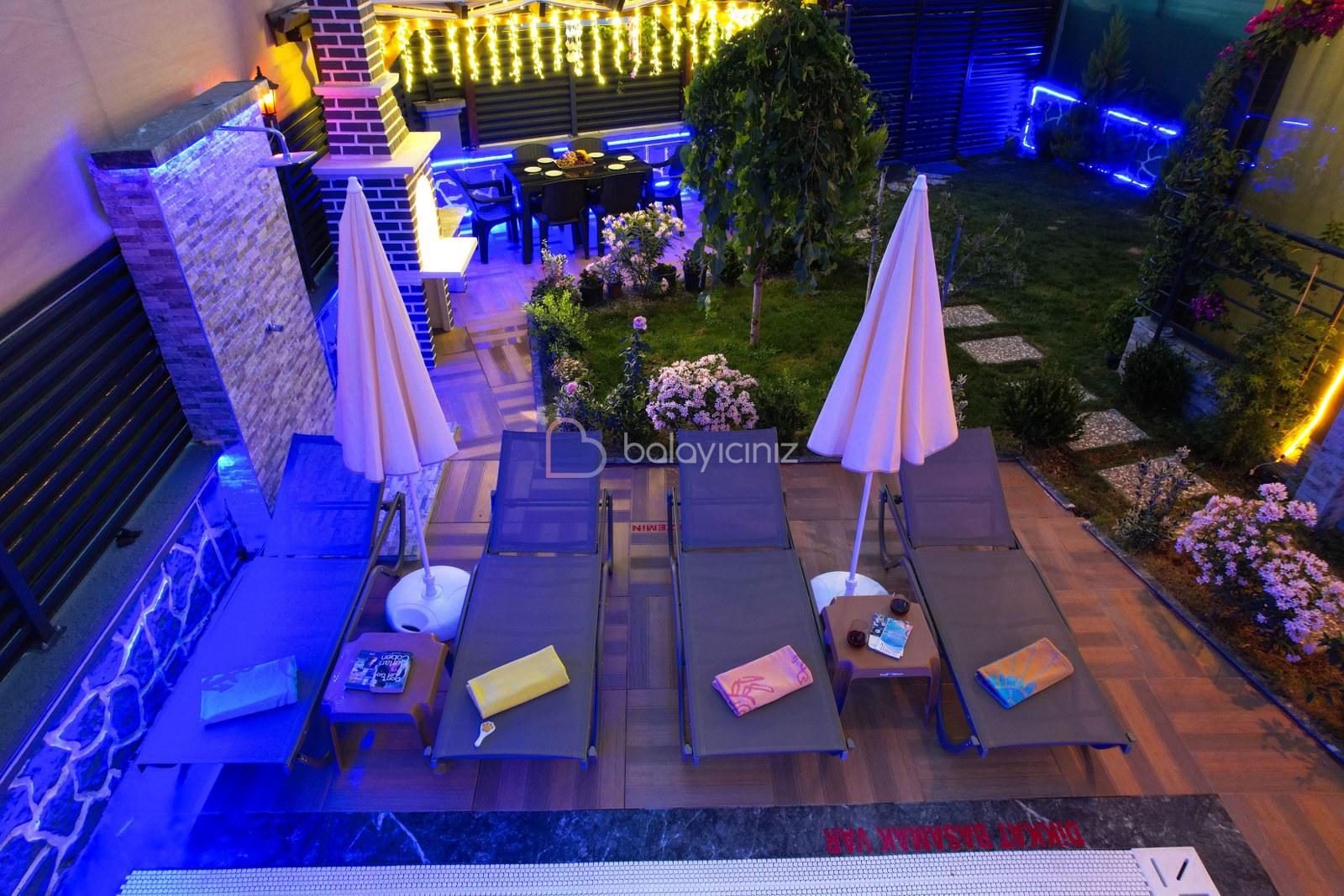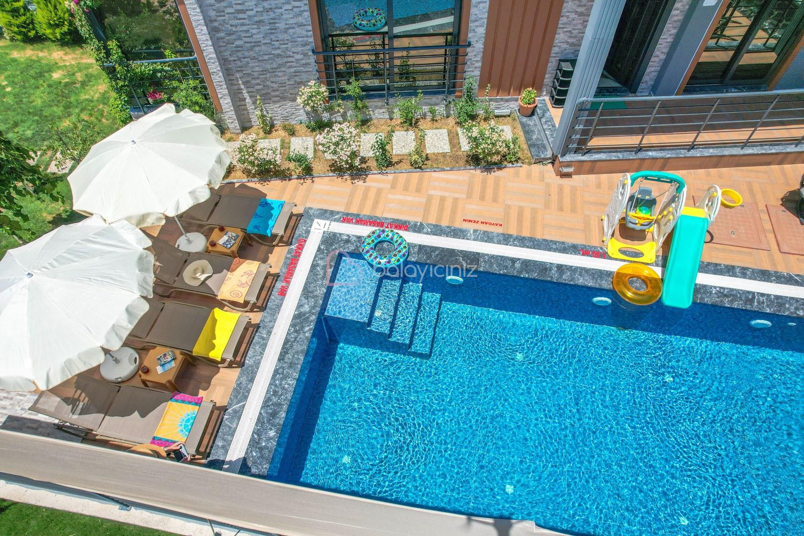 Havuz terasında özel yüzme havuzu, şezlonglar, güneş şemsiyesi, bahçe oturma grubu, salıncak bulunmaktadır.