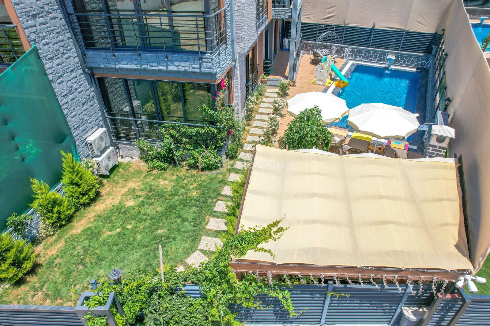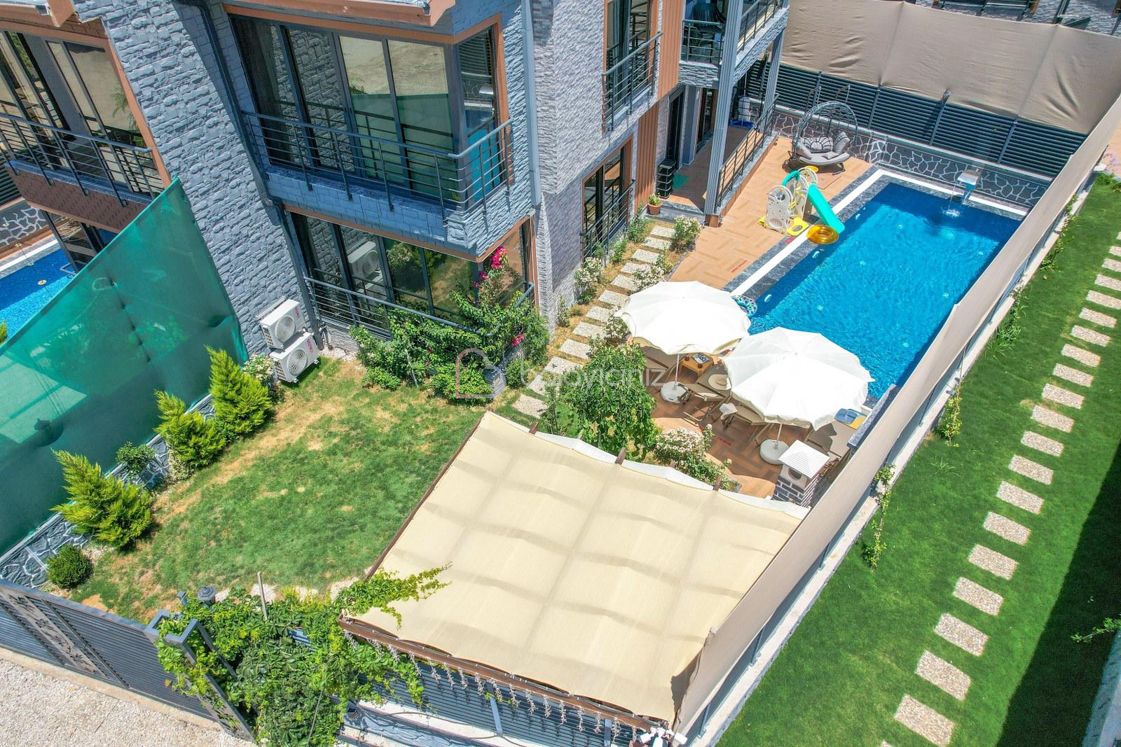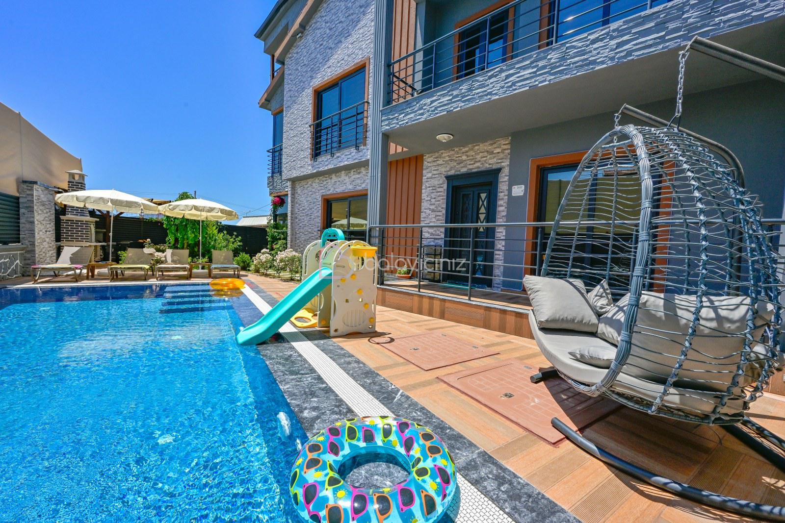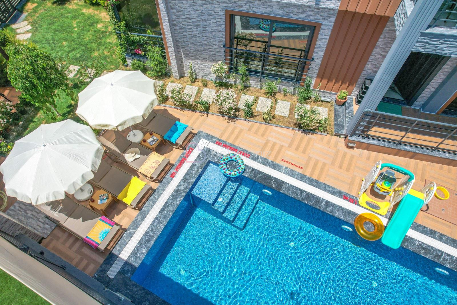 Havuz terasında özel yüzme havuzu, şezlonglar, güneş şemsiyesi, bahçe oturma grubu, salıncak bulunmaktadır.