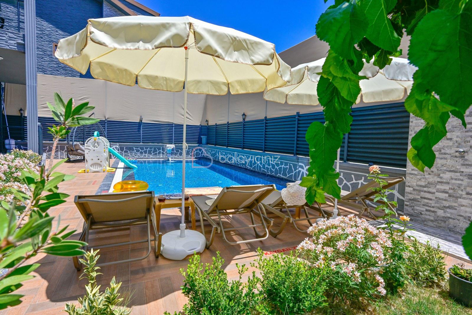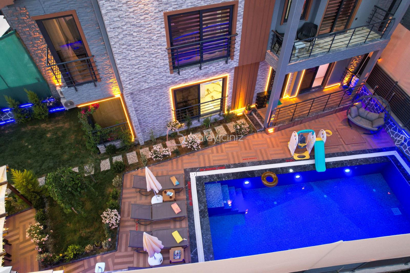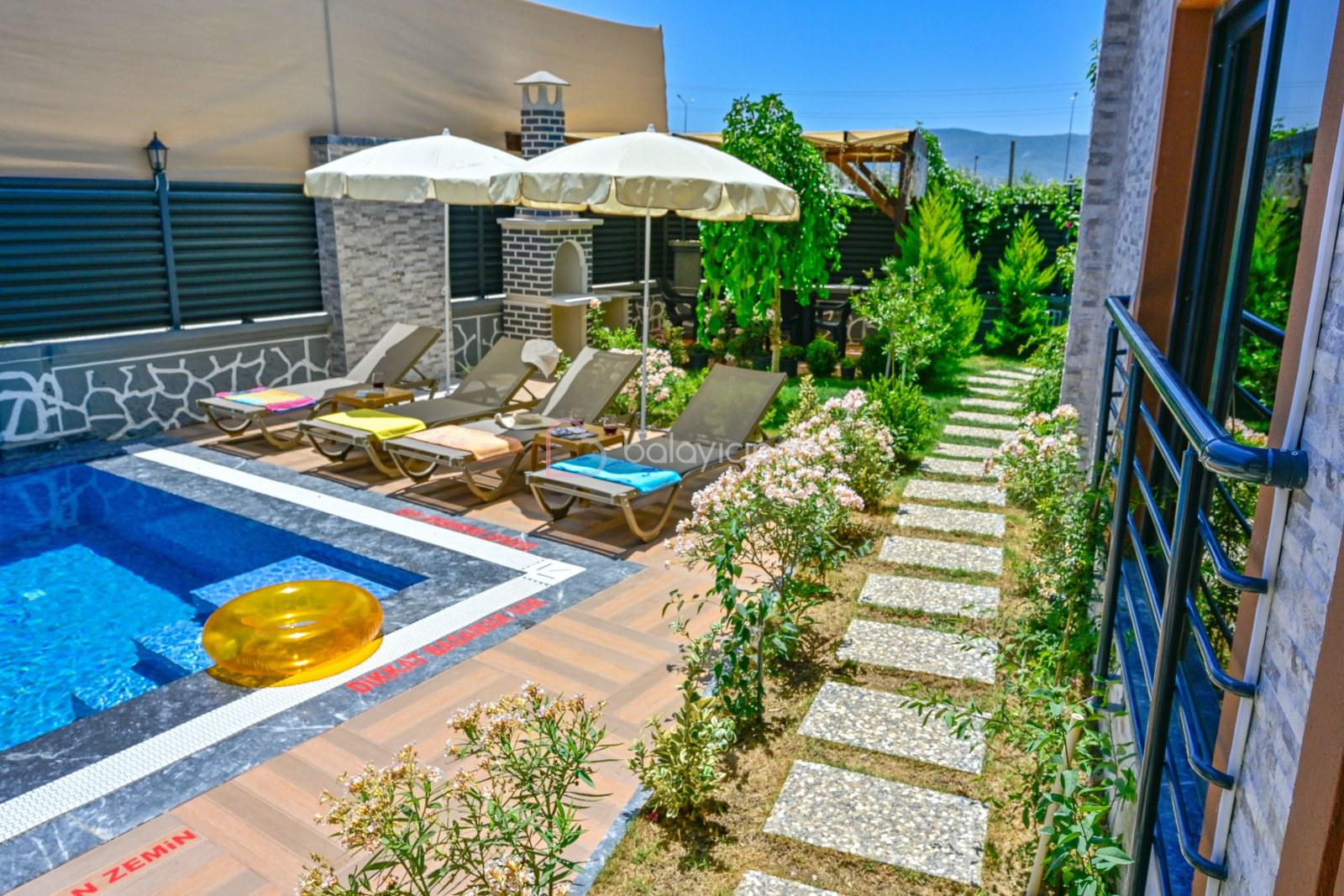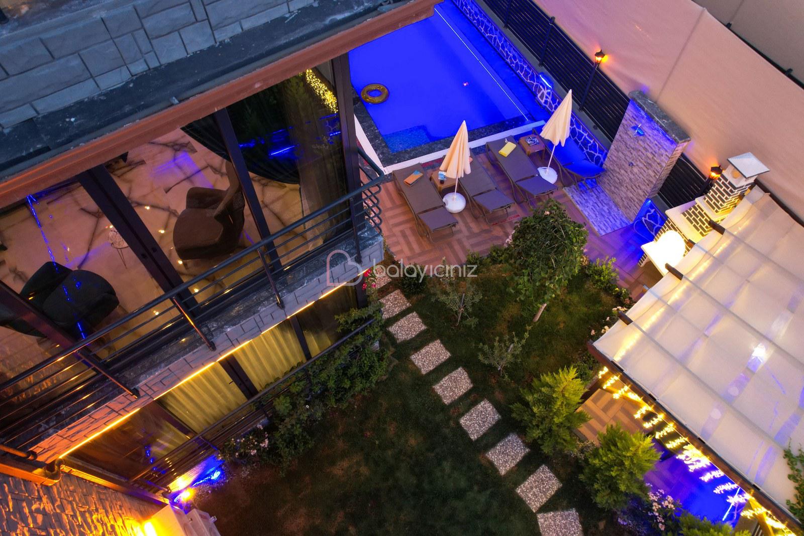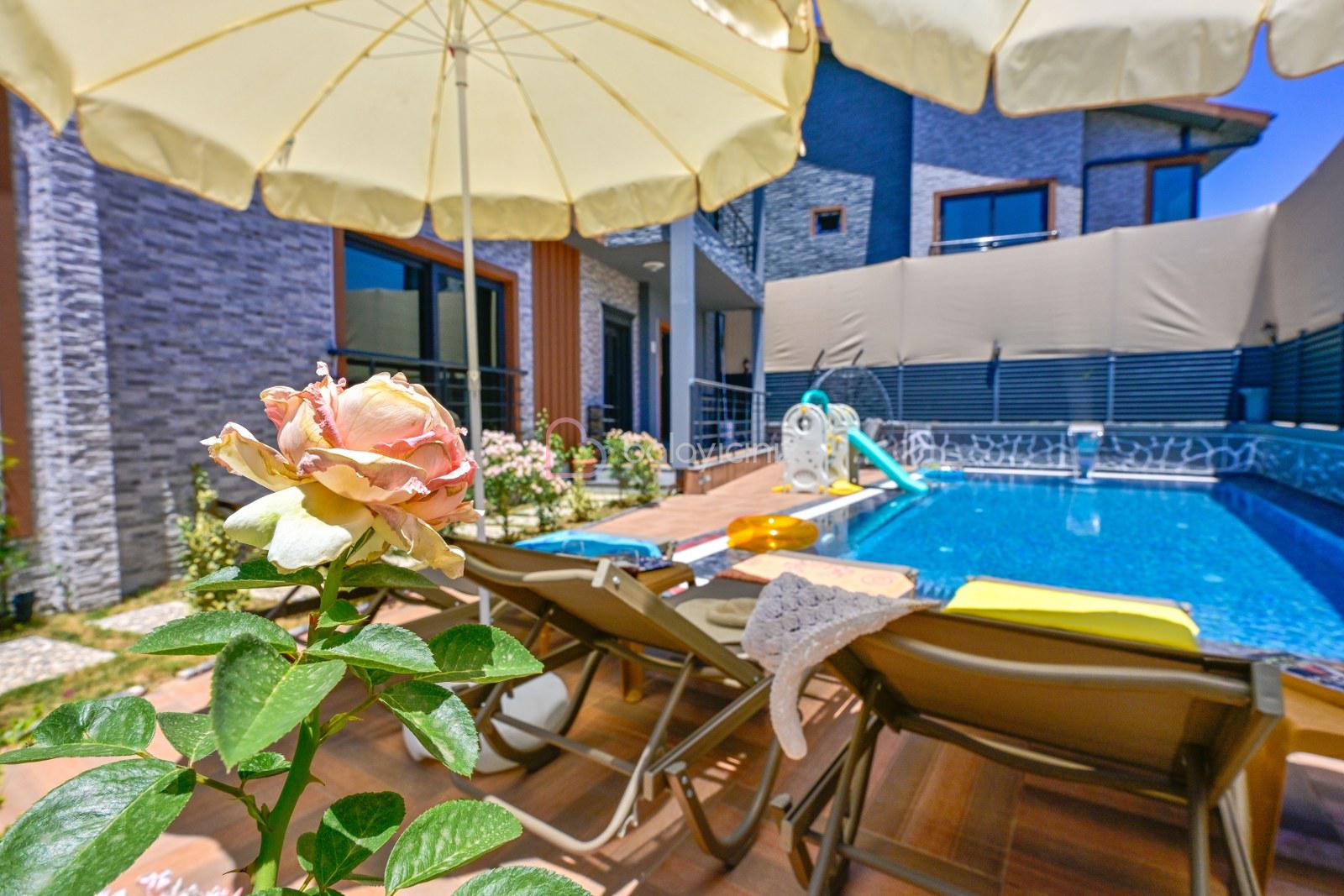 Havuz terasında özel yüzme havuzu, şezlonglar, güneş şemsiyesi, bahçe oturma grubu, salıncak bulunmaktadır.