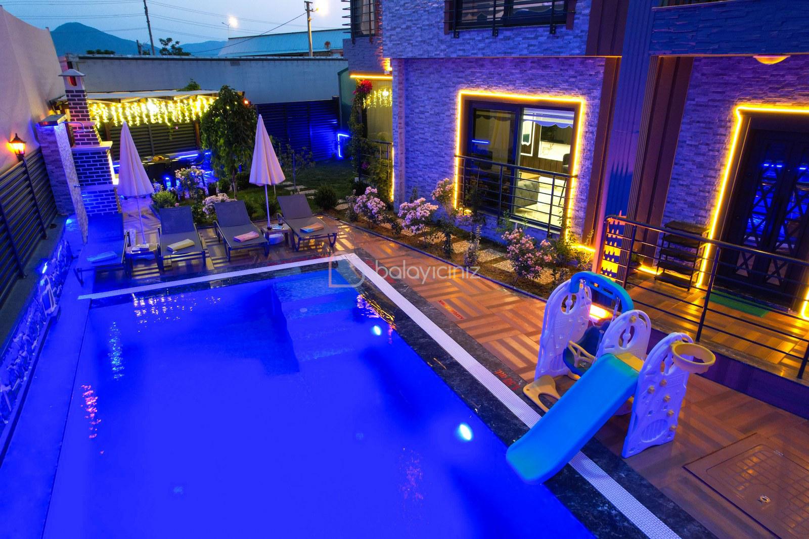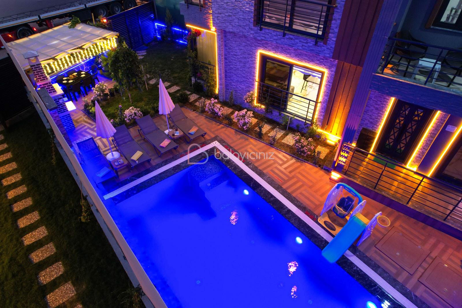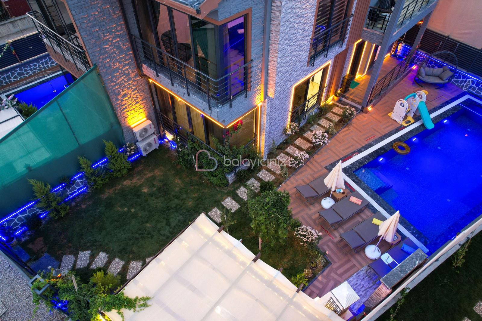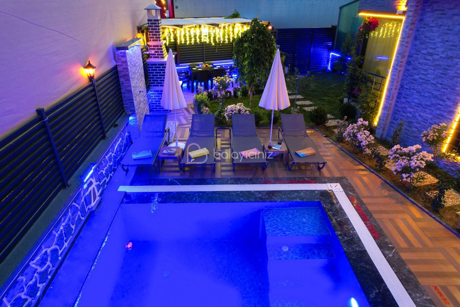 Havuz terasında özel yüzme havuzu, şezlonglar, güneş şemsiyesi, bahçe oturma grubu, salıncak bulunmaktadır.