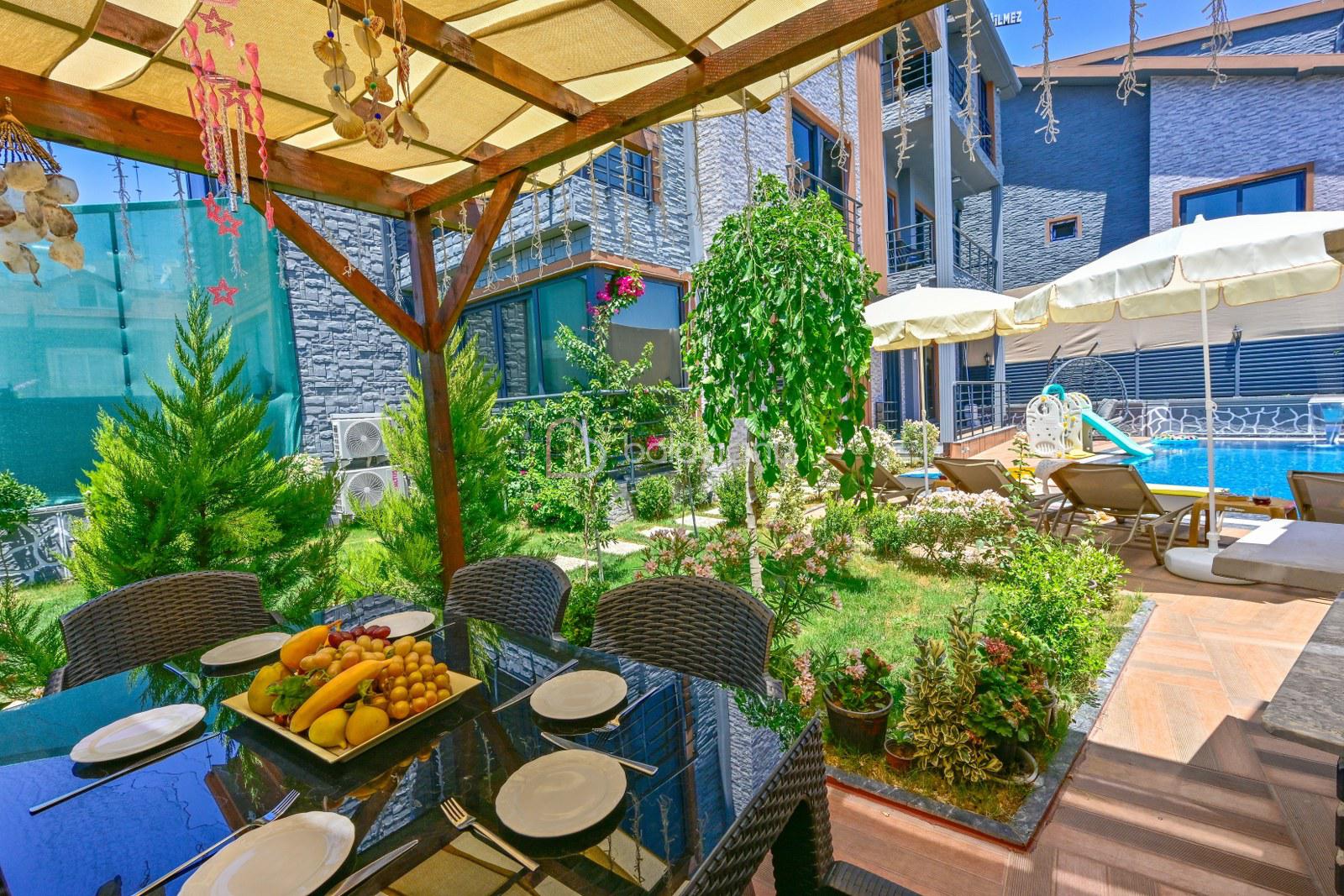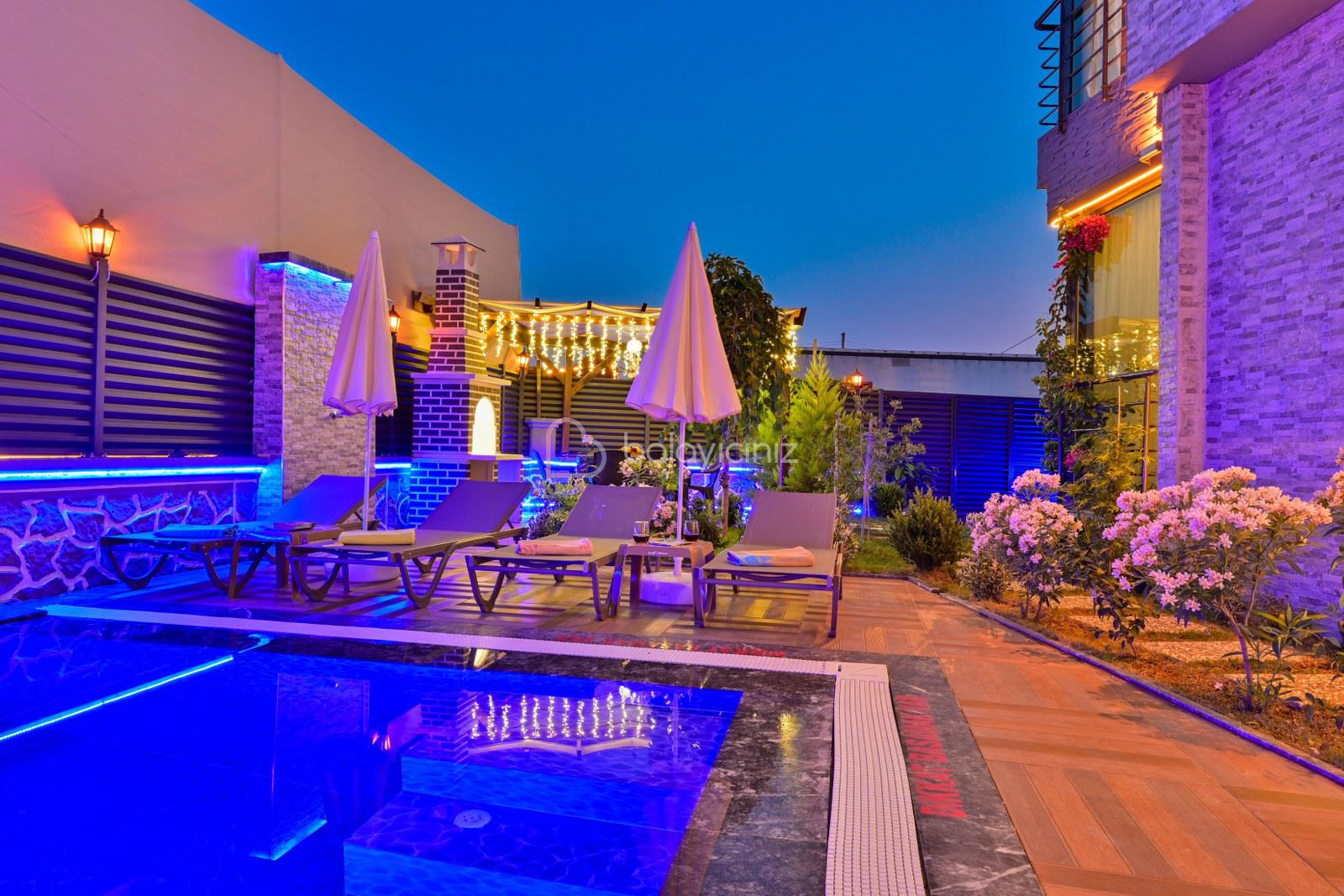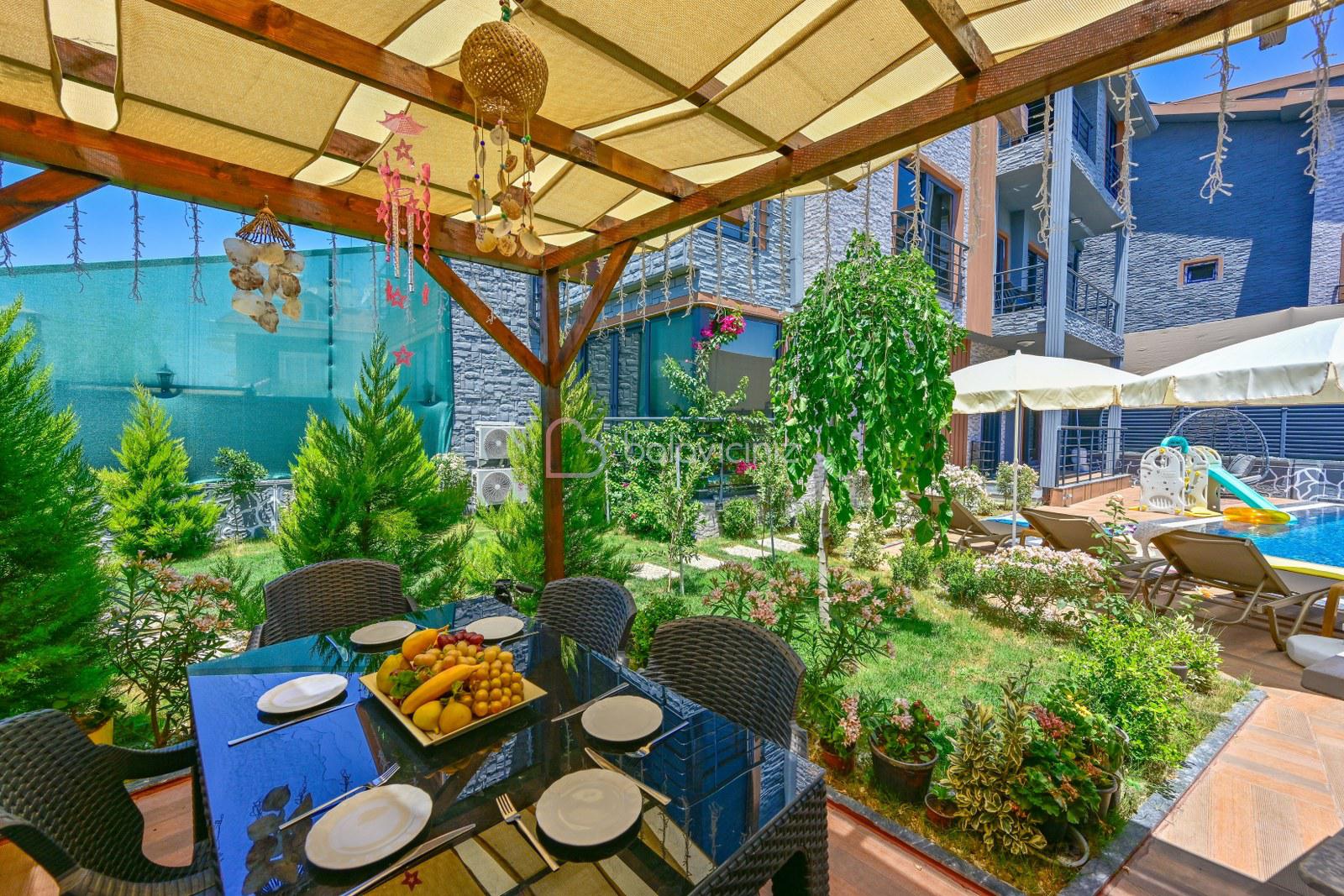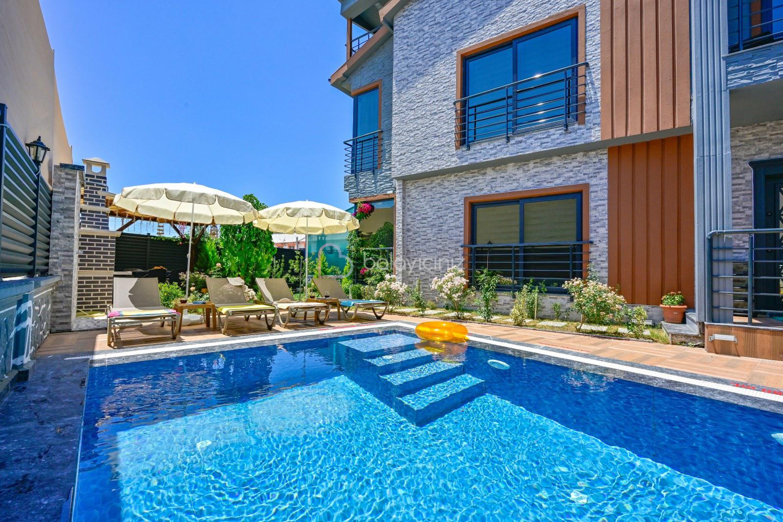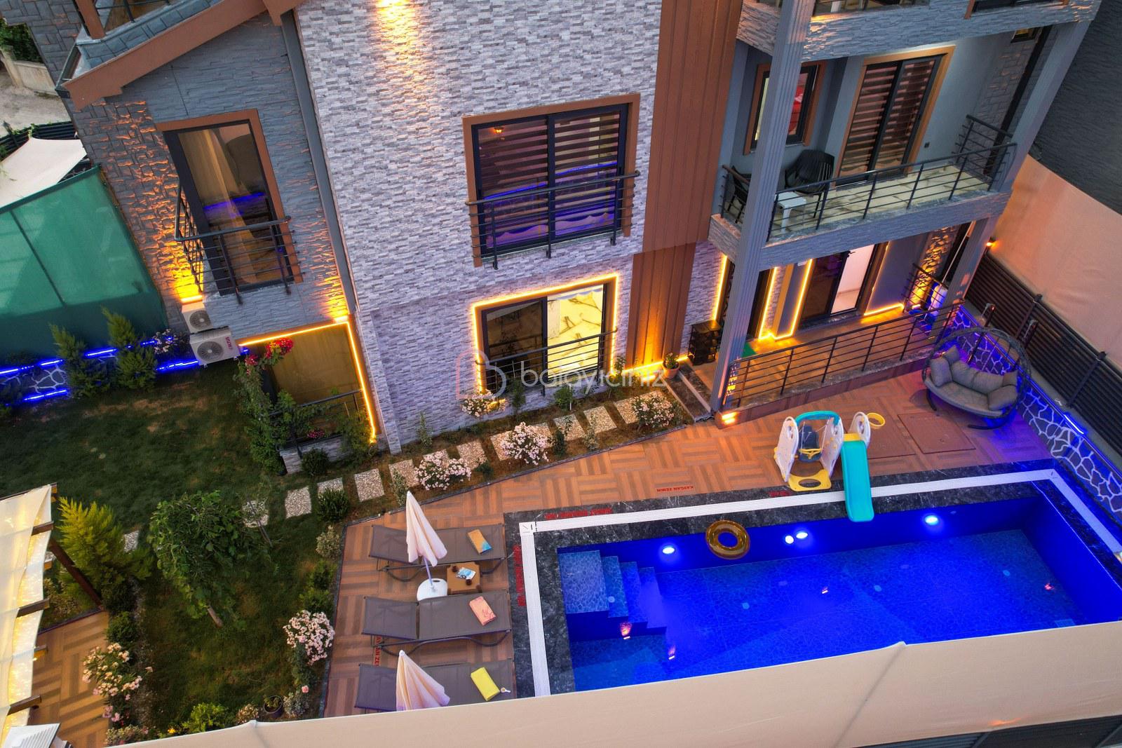 Havuz terasında özel yüzme havuzu, şezlonglar, güneş şemsiyesi, bahçe oturma grubu, salıncak bulunmaktadır.