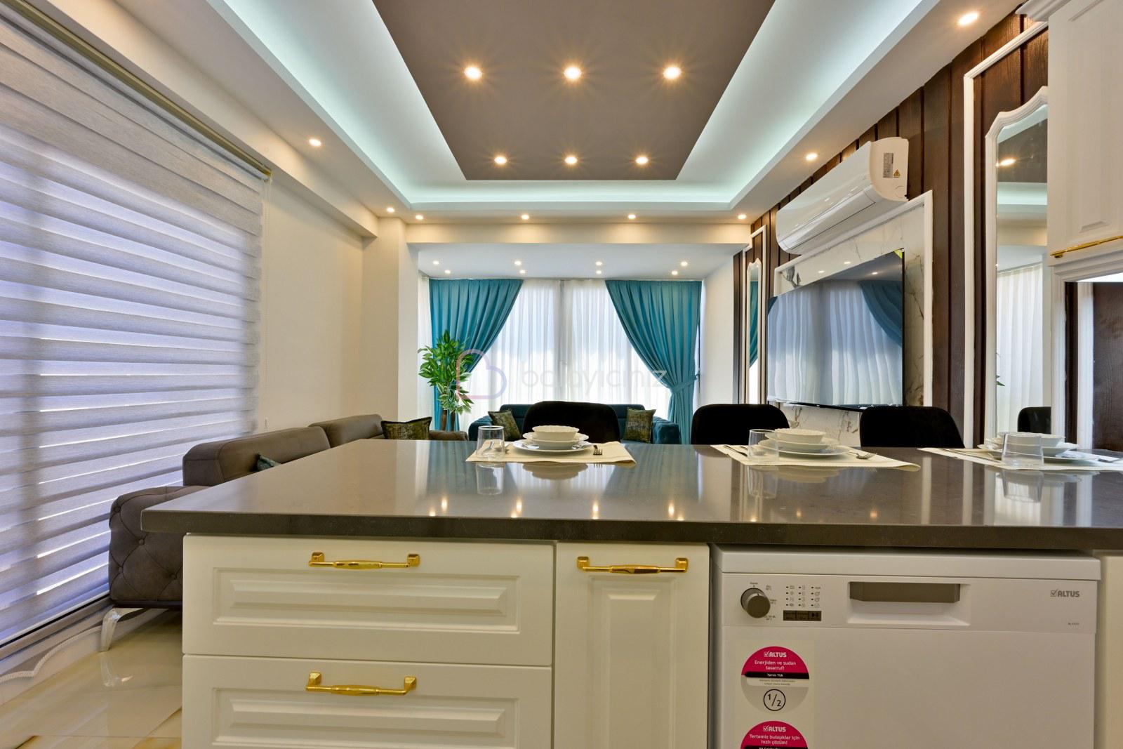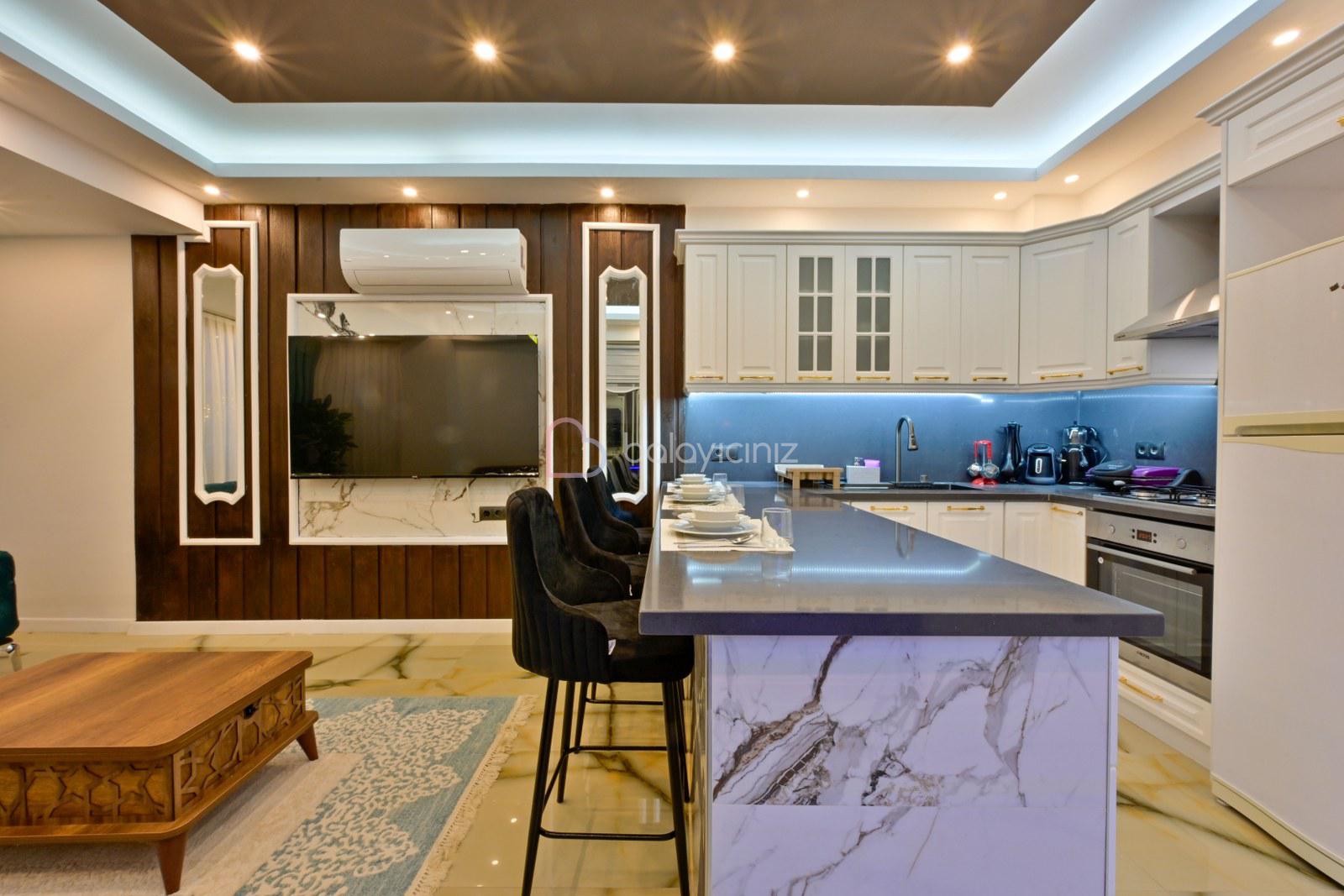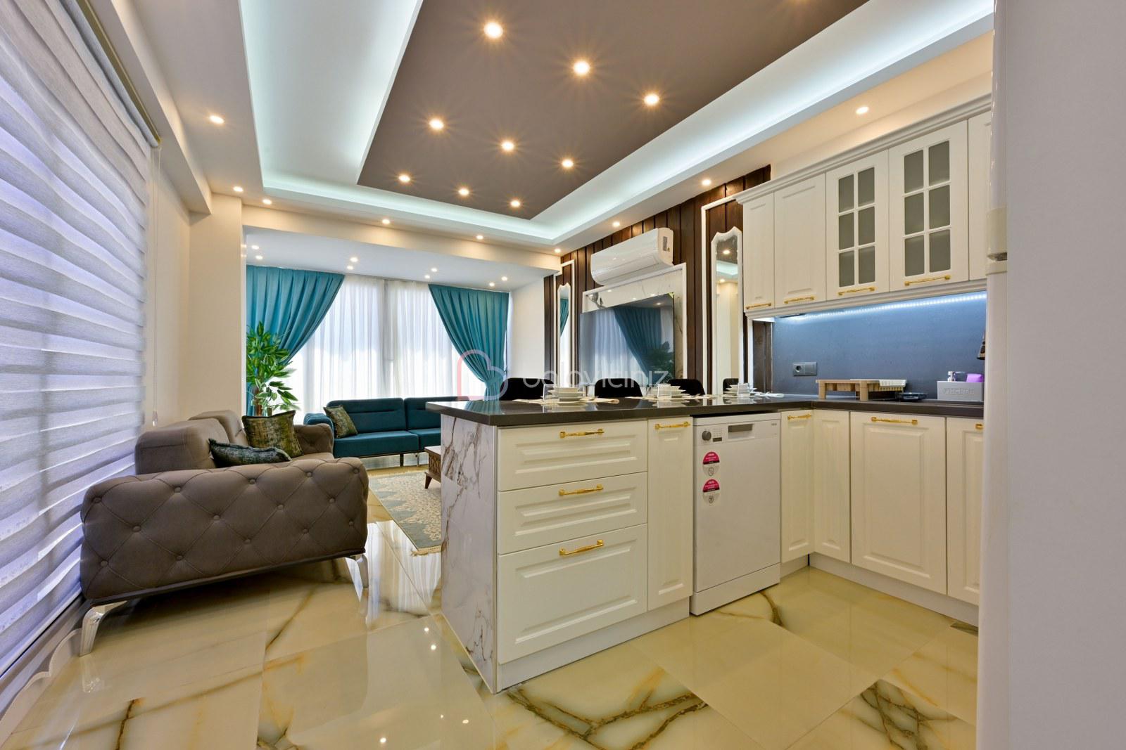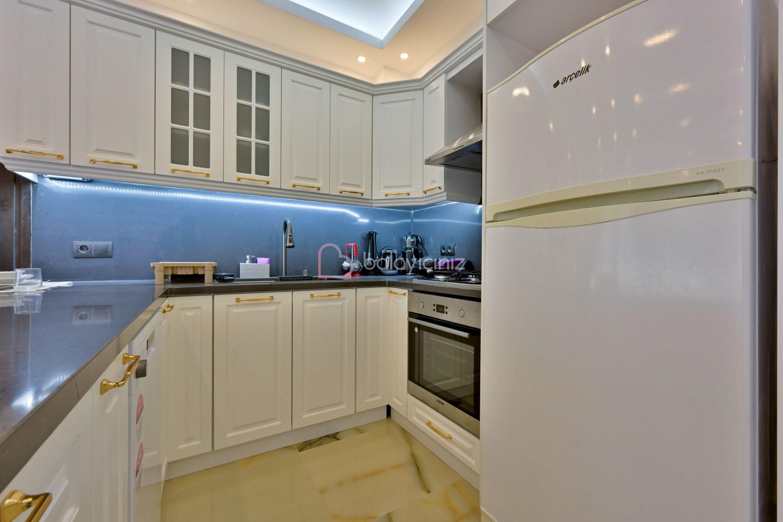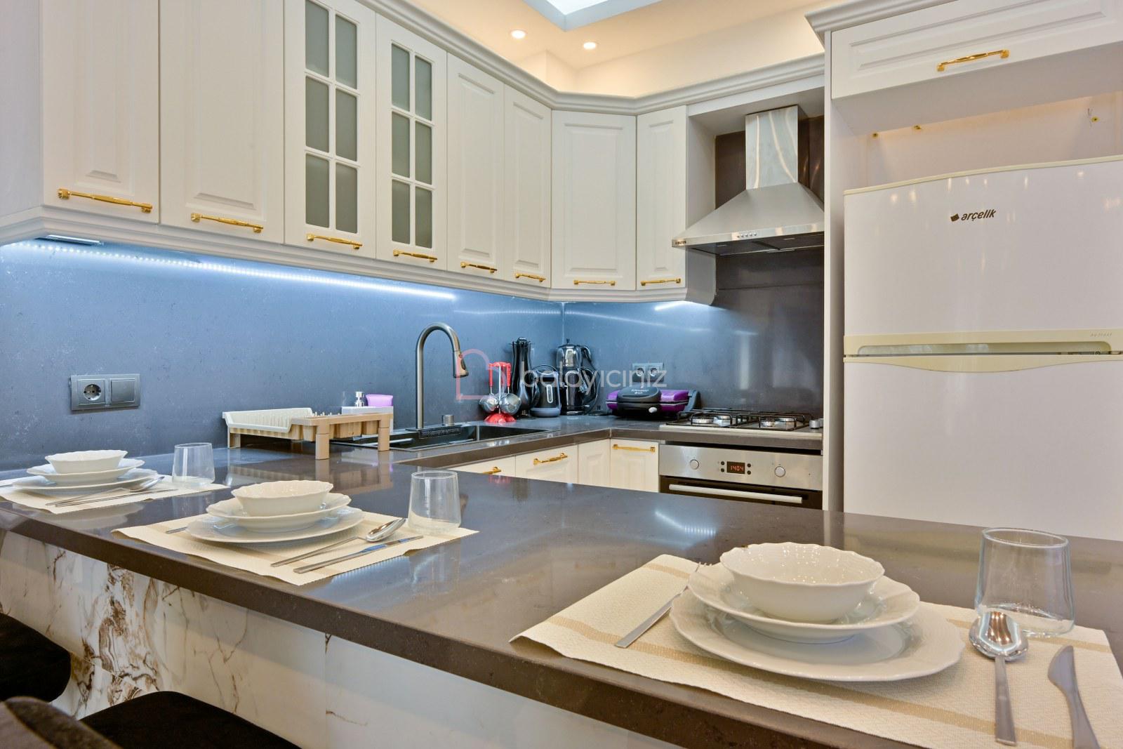 Amerikan mutfakta buzdolabı, bulaşık makinesi, çamaşır makinesi, fırın, 4'lü ocak, elektrikli su ısıtıcısı (kettle), tost makinesi, yemek masası, yemek takımları, çatal ve bıçak takımları, tencere ve tava takımları, bardaklar bulunmaktadır.