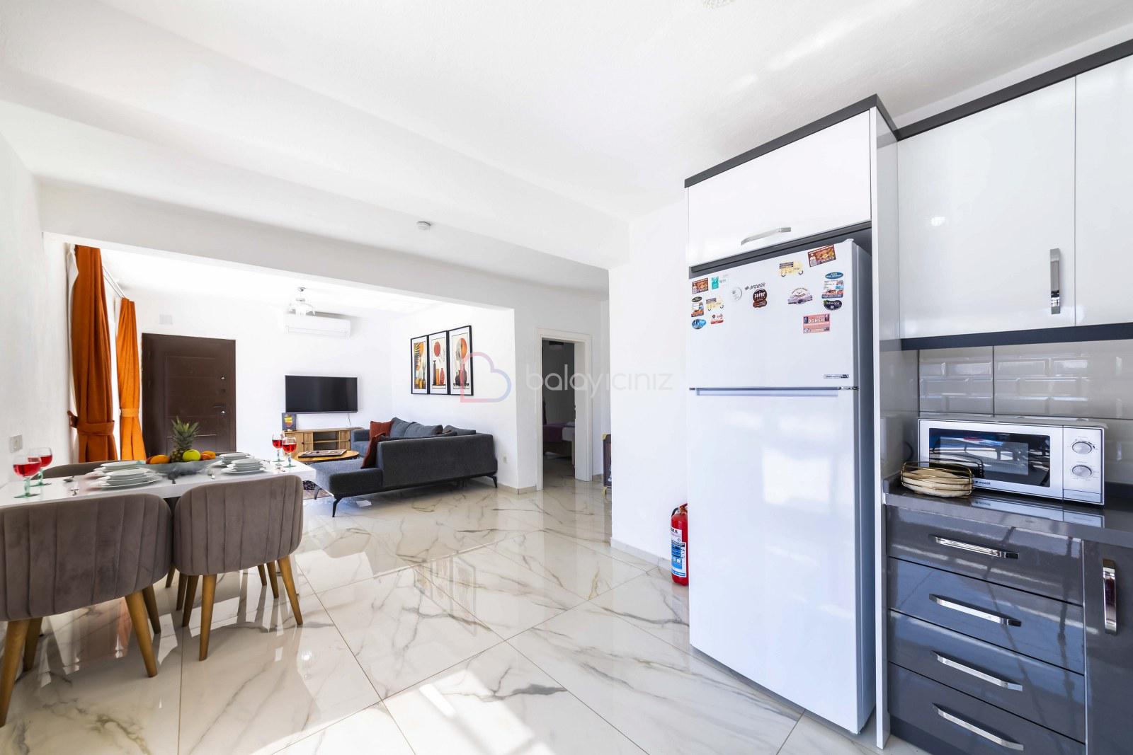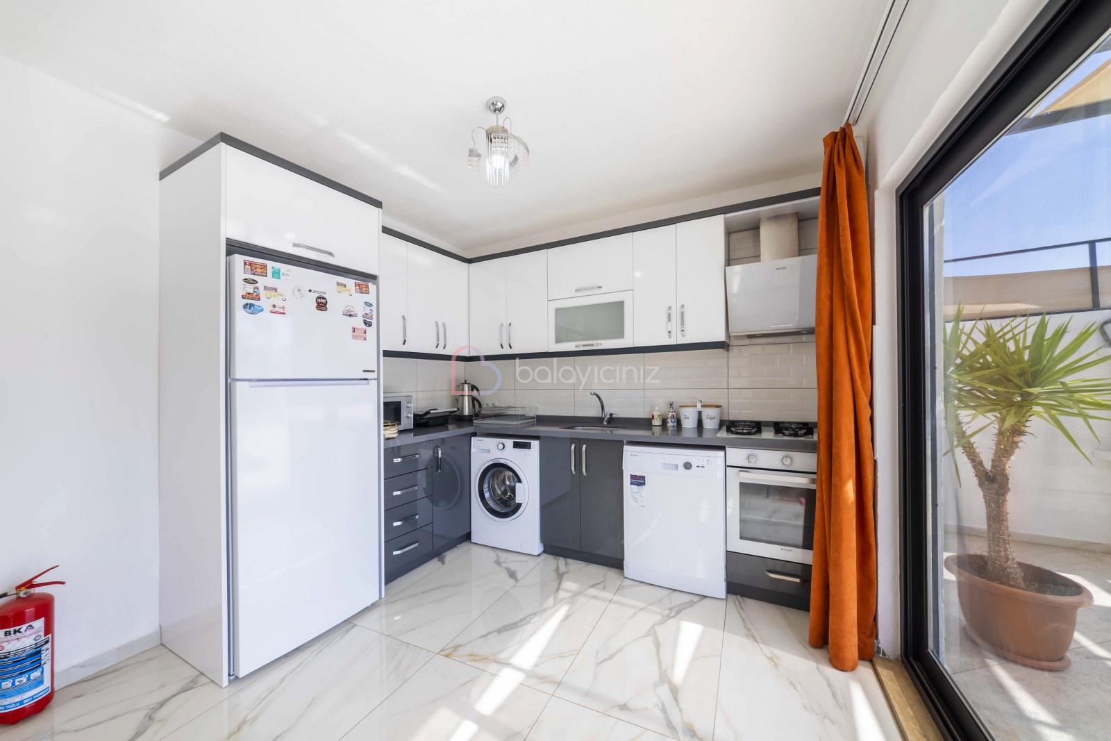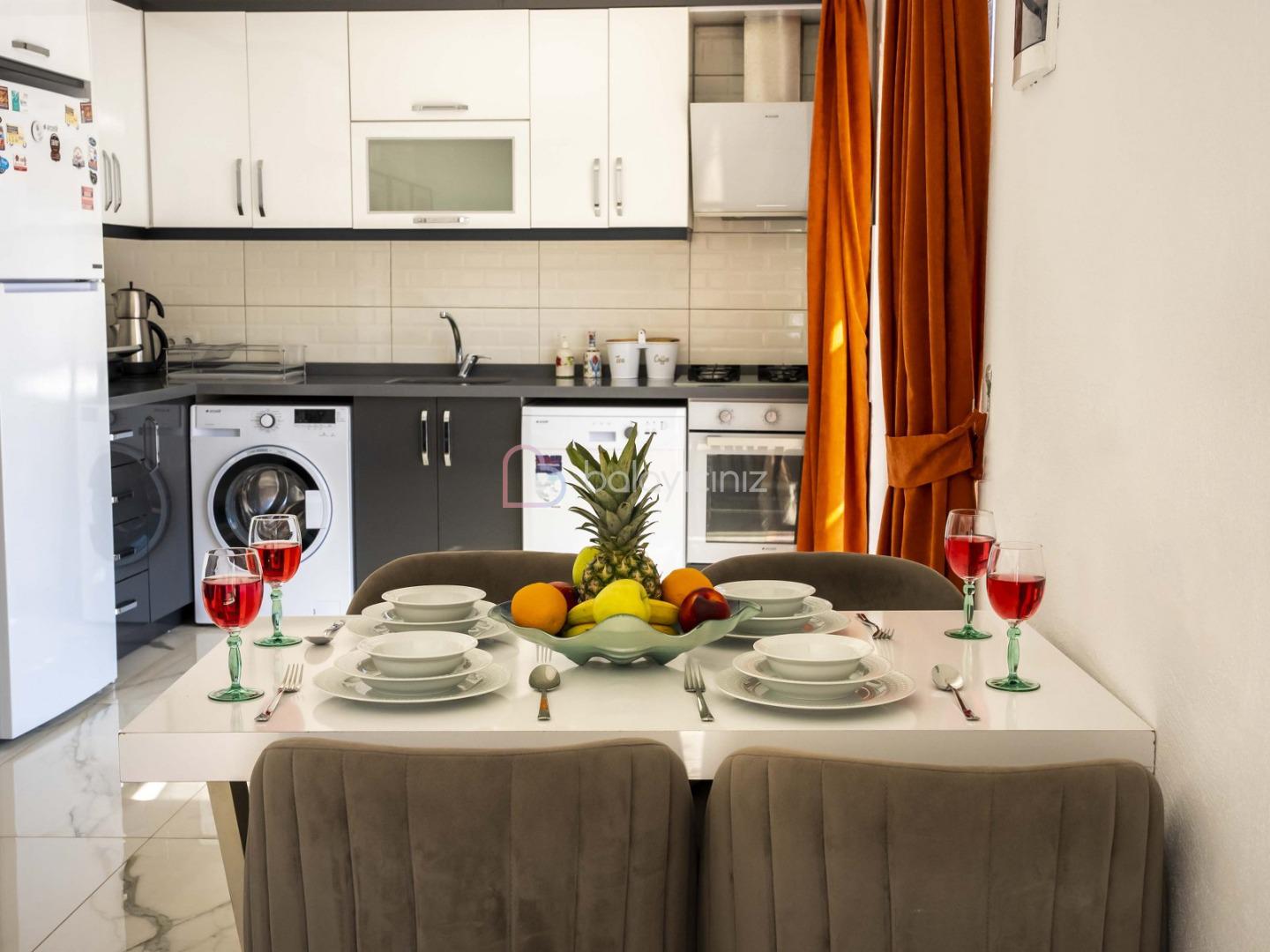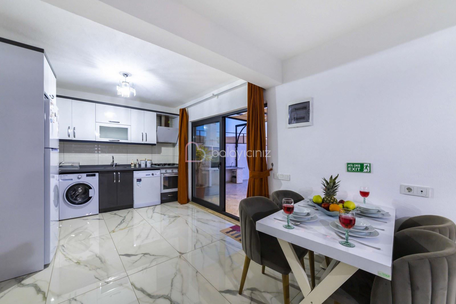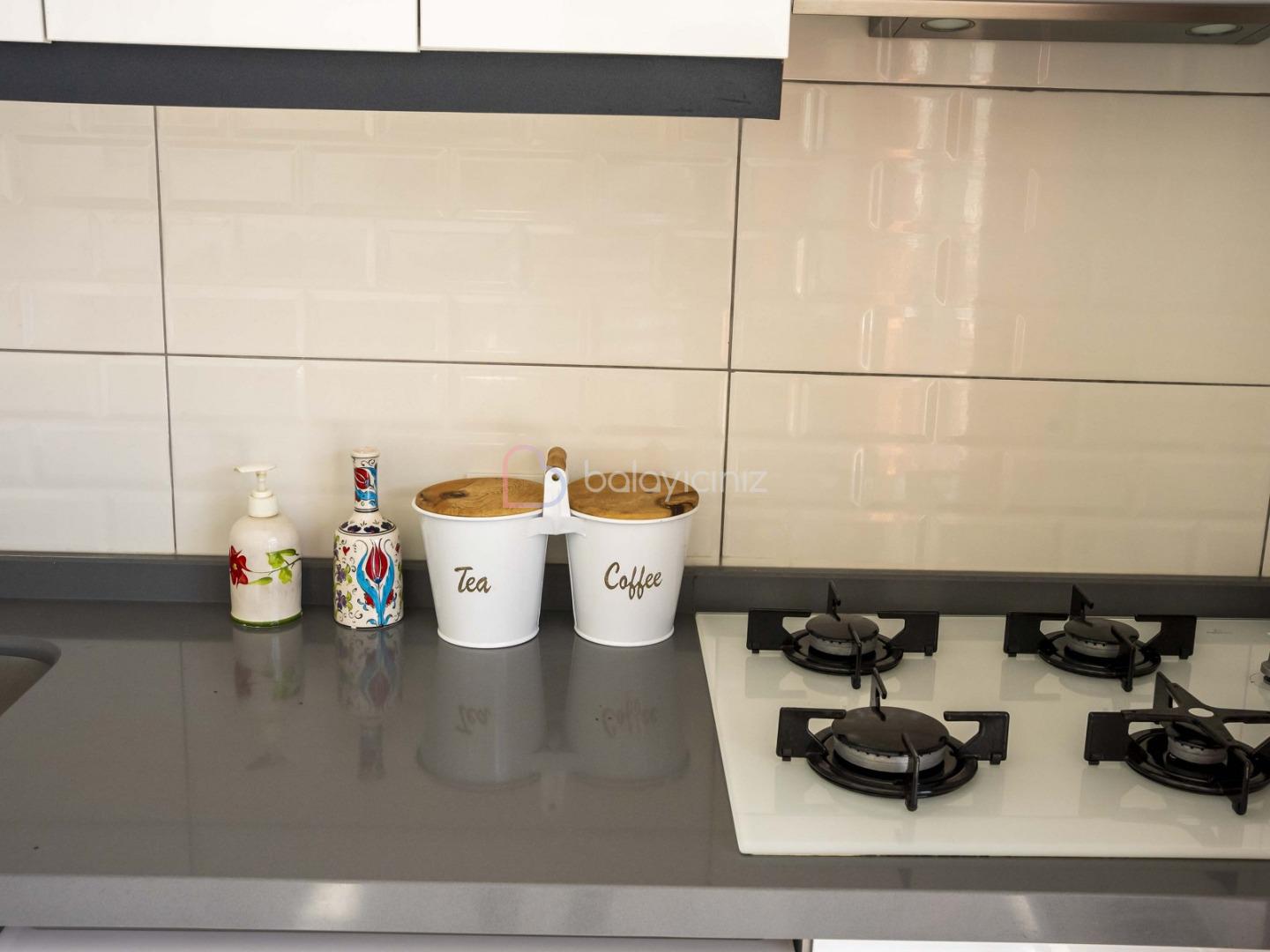 Modern Amerikan Mutfak, buzdolabı, çamaşır makinesi, bulaşık makinesi, ankastre fırın, mikrodalga fırın, 4'lü ocak, elektrikli su ısıtıcısı, yemek takımı, çatal bıçak seti, tavalar, tencereler, bardaklar bulunmaktadır.