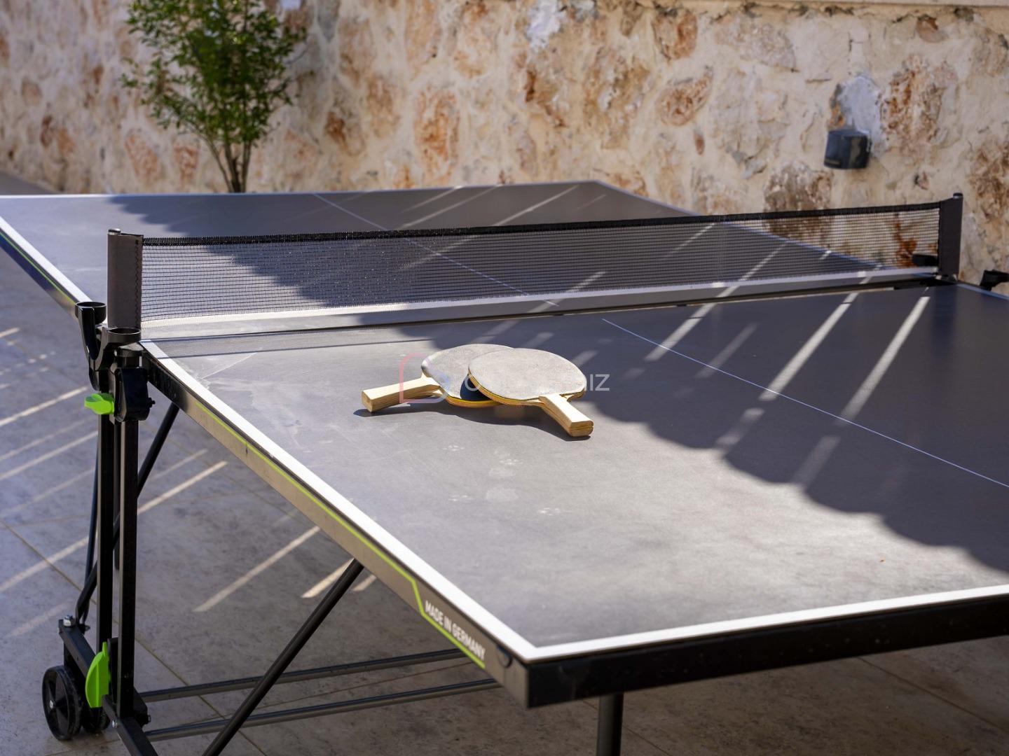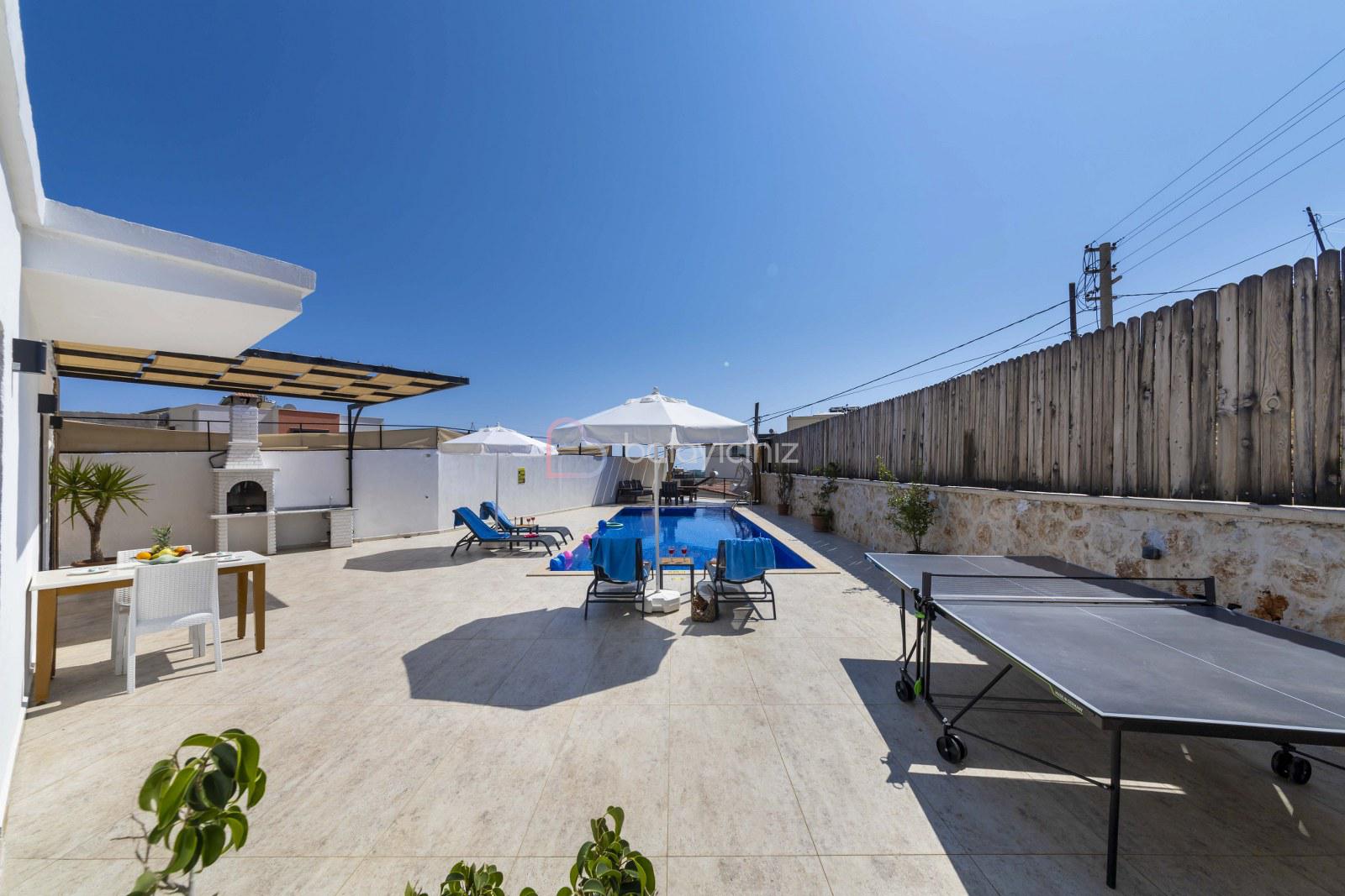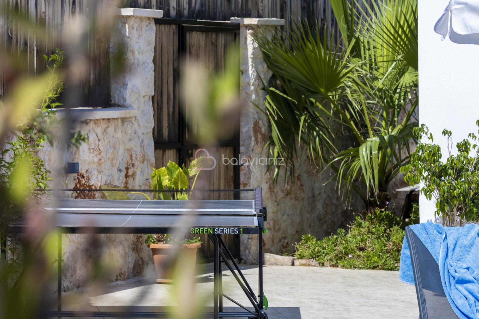 Korunakli yüzme havuzu, şezlong, şemsiye, masa ve sandalye, masa tenisi, mangal bulunmaktadır.