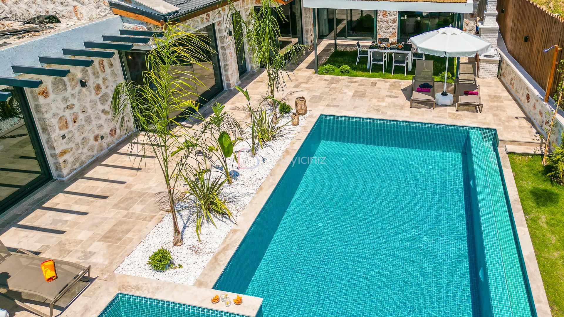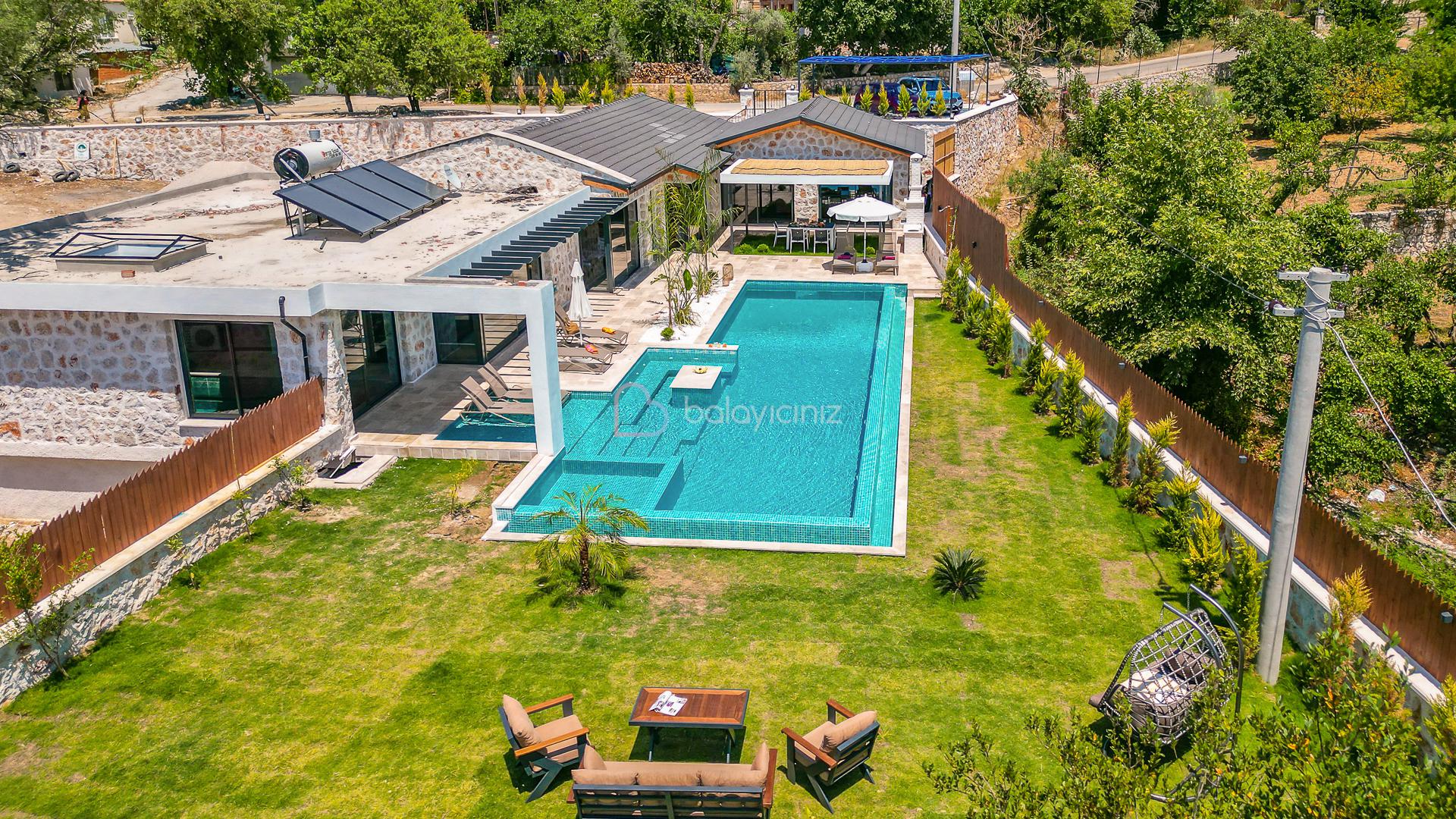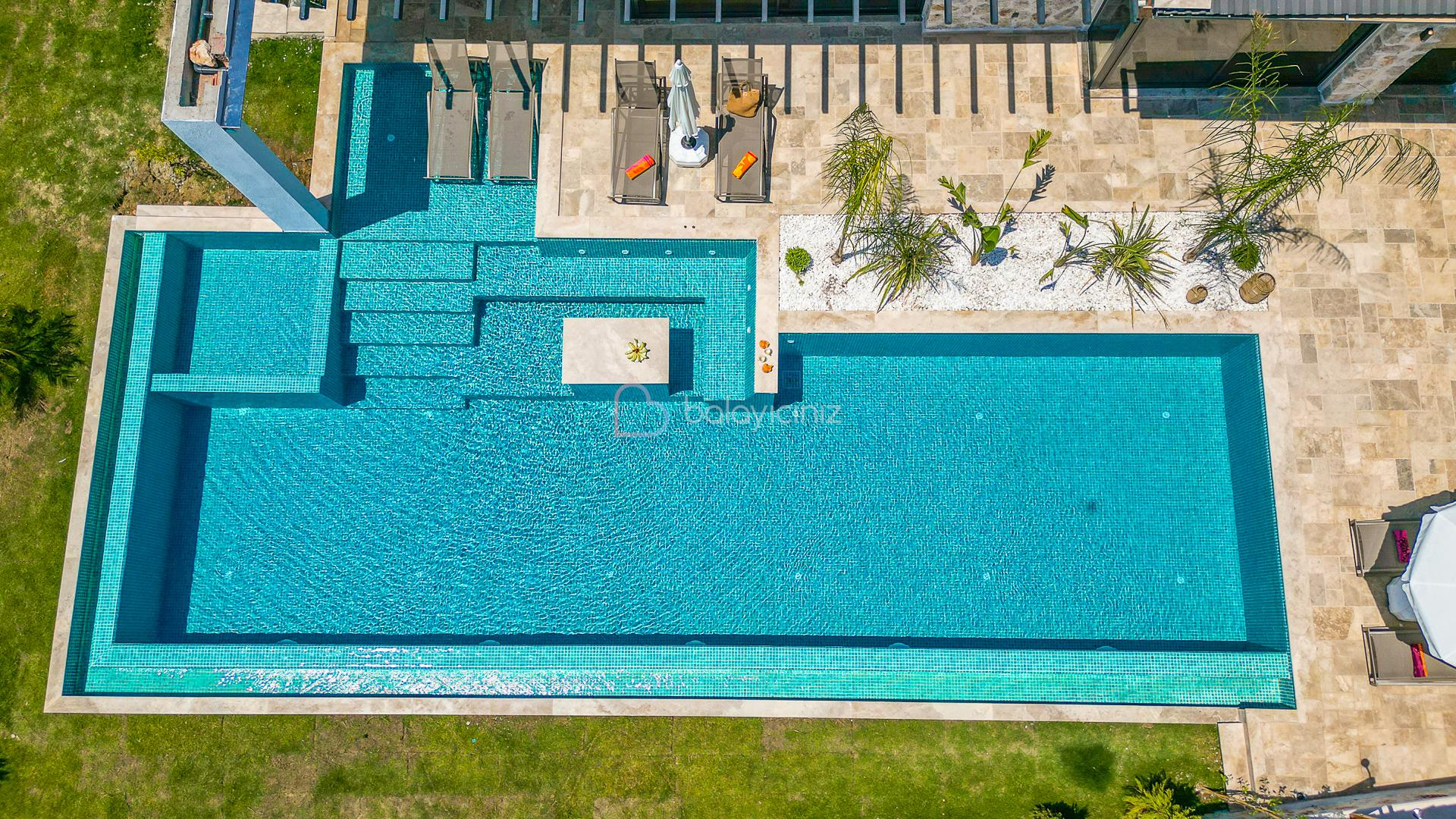 Not: Villanın güneşlenme terası ve havuzunun dış taraftan görünmemesi için gerekli önlemler alınmıştır fakat villanın diğer bölümlerinin görünürlüğü kesin olarak garanti edilememektedir.