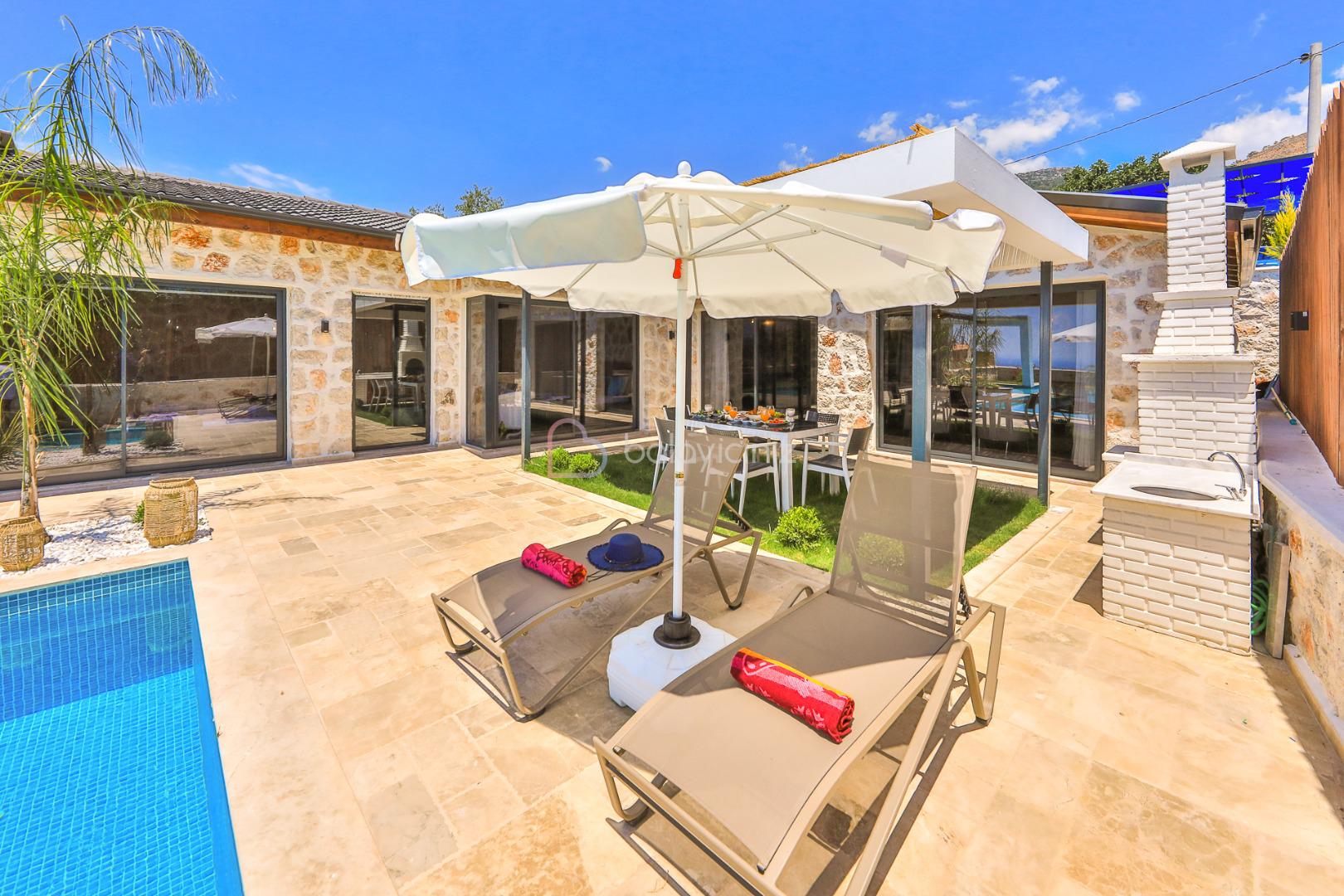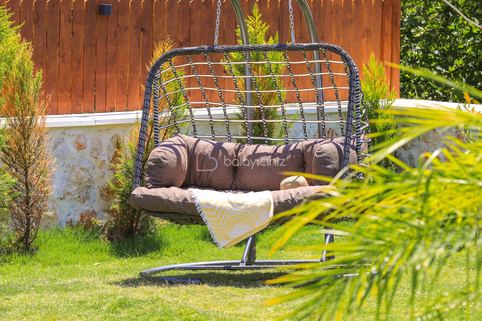 4 kişi kapasiteli şemsiye, şezlong, salıncak, mangal, duş, oturma gurubu, yemek masası ve sandalyesi bulunmaktadır.