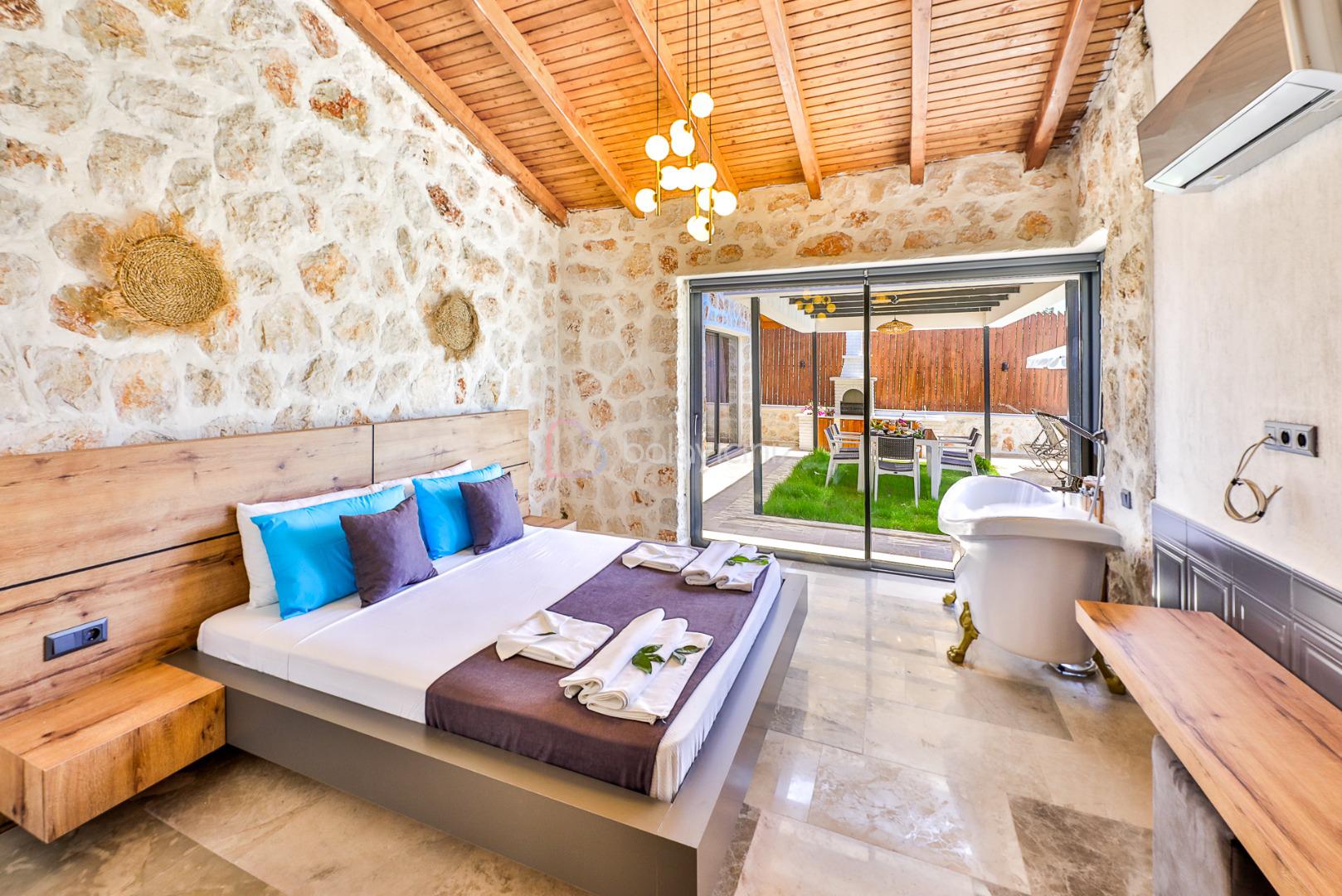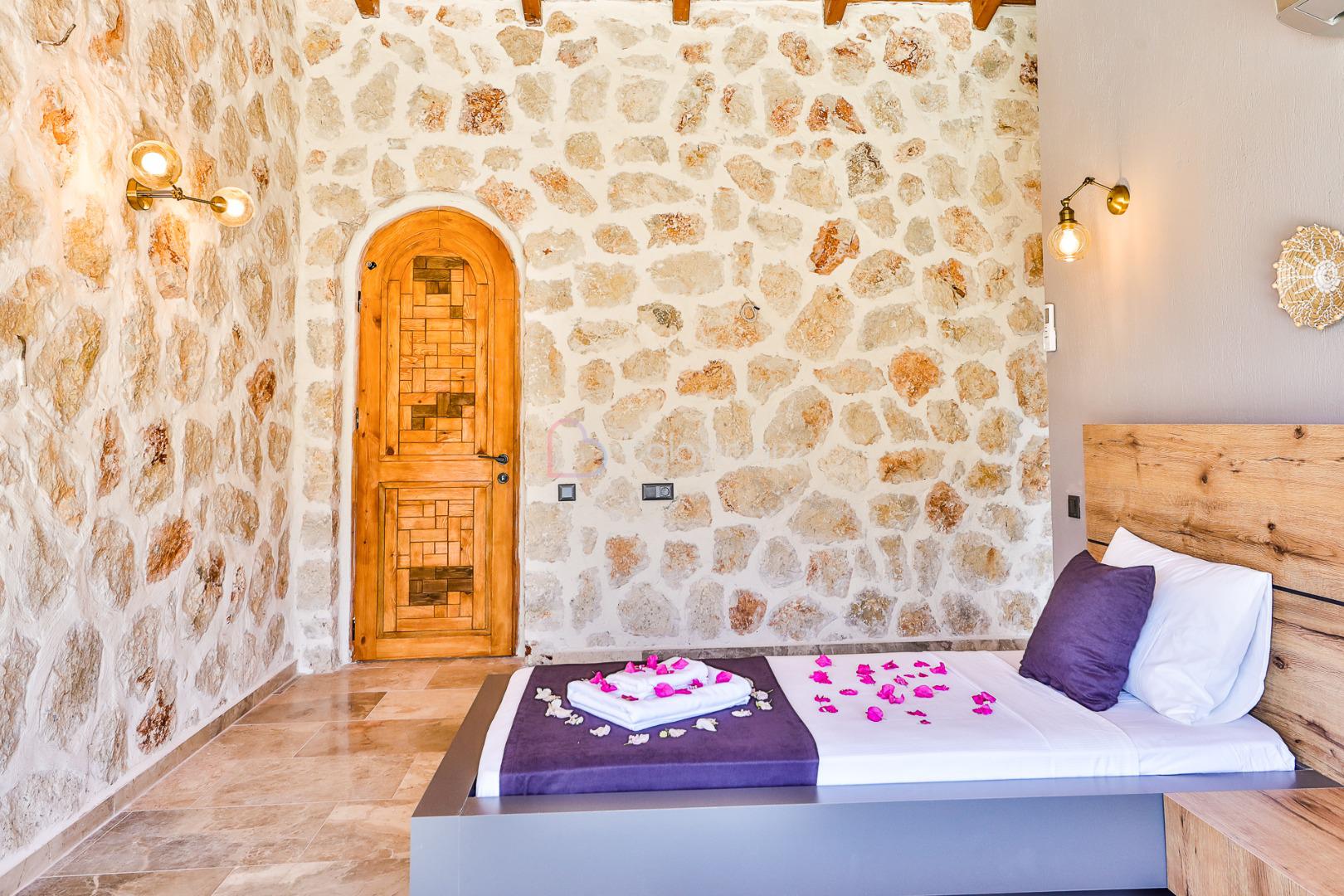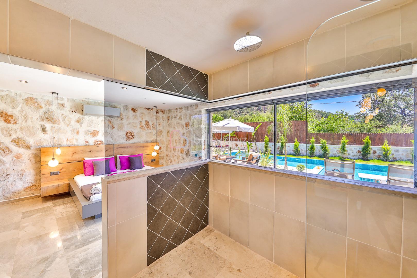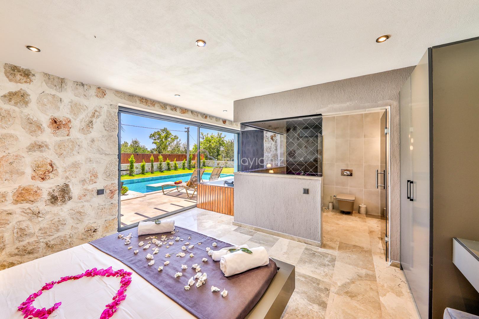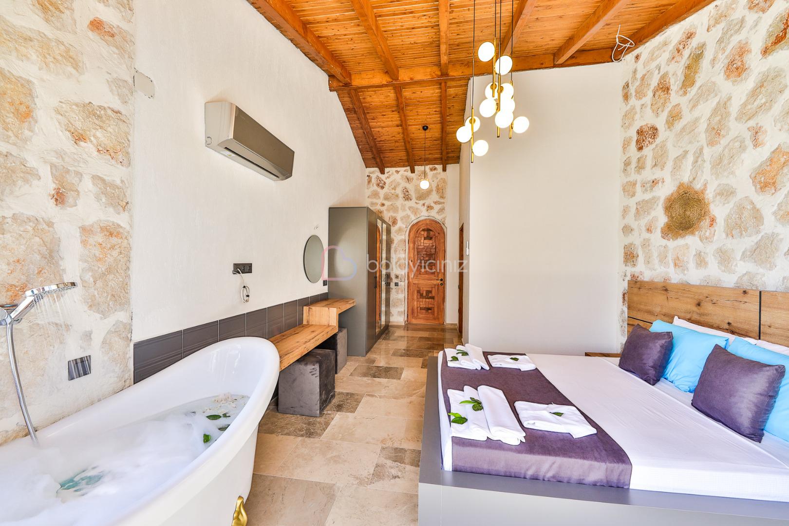 1.Yatak Odası: En süit odada çift kişilik yatak, makyaj masası, klima, elbise dolabı, komodin, jakuzi, tuvalet banyo ve havuz terasına çıkış bulunmaktadır.