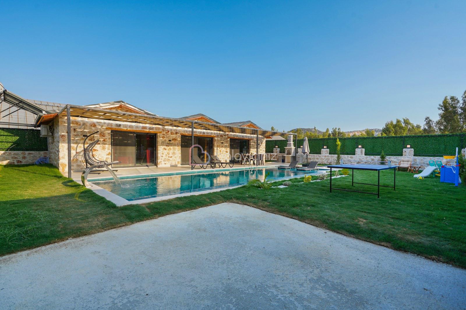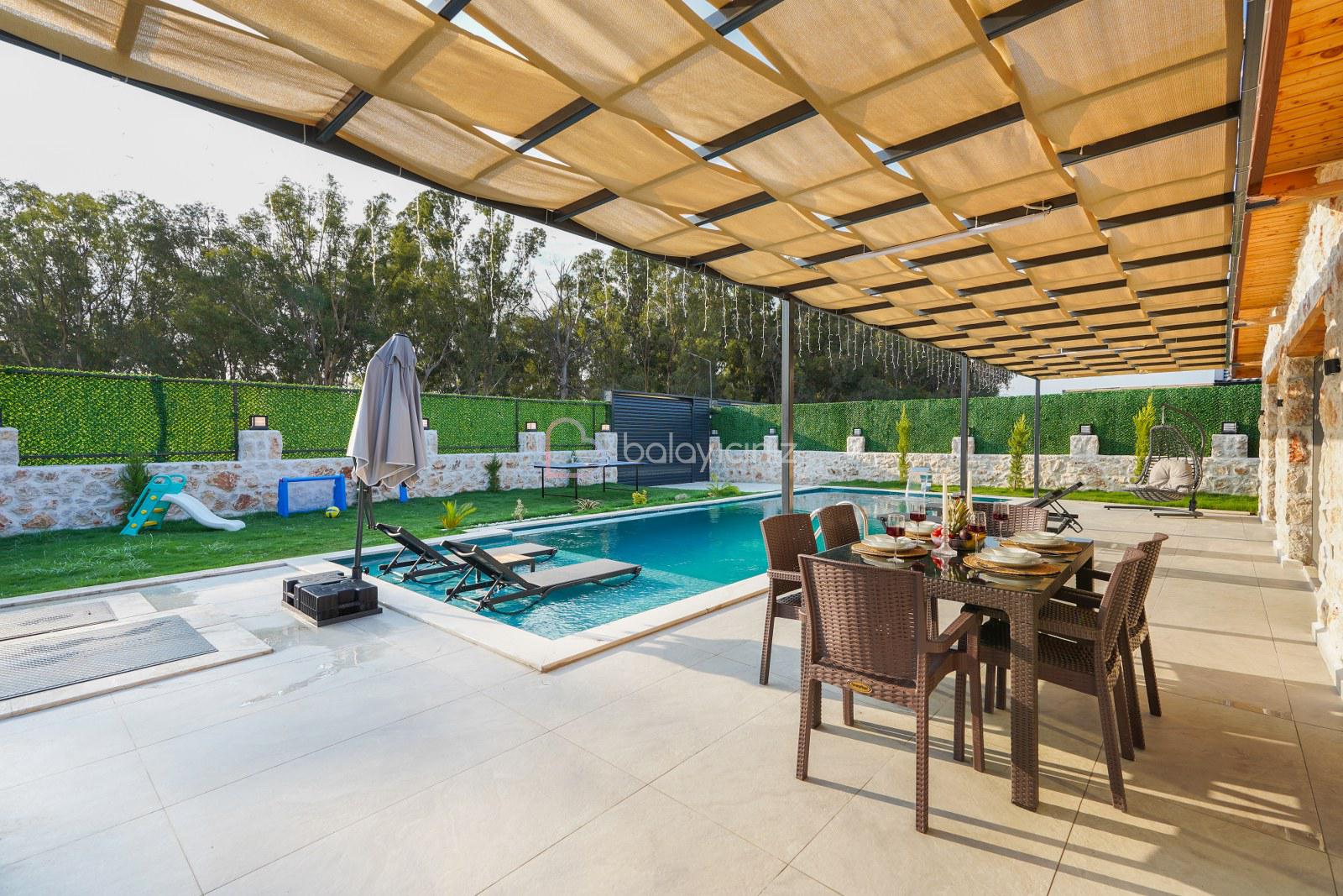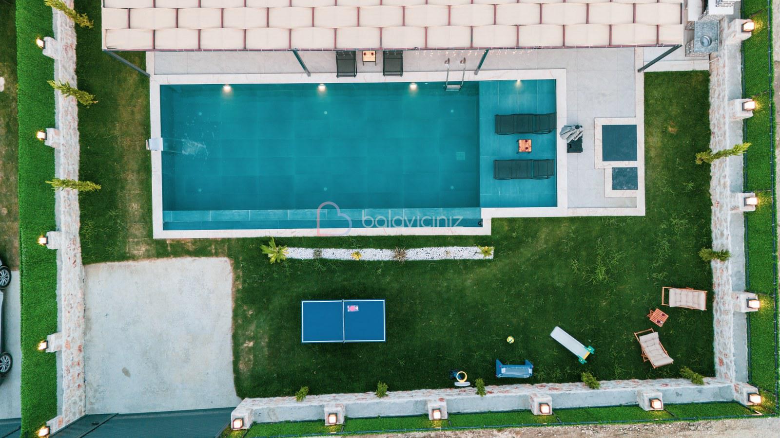 Şezlong, barbekü alanı, yemek masası, masa tenisi, çocuk oyun alanı, oturma takımı, salıncak bulunmaktadır.