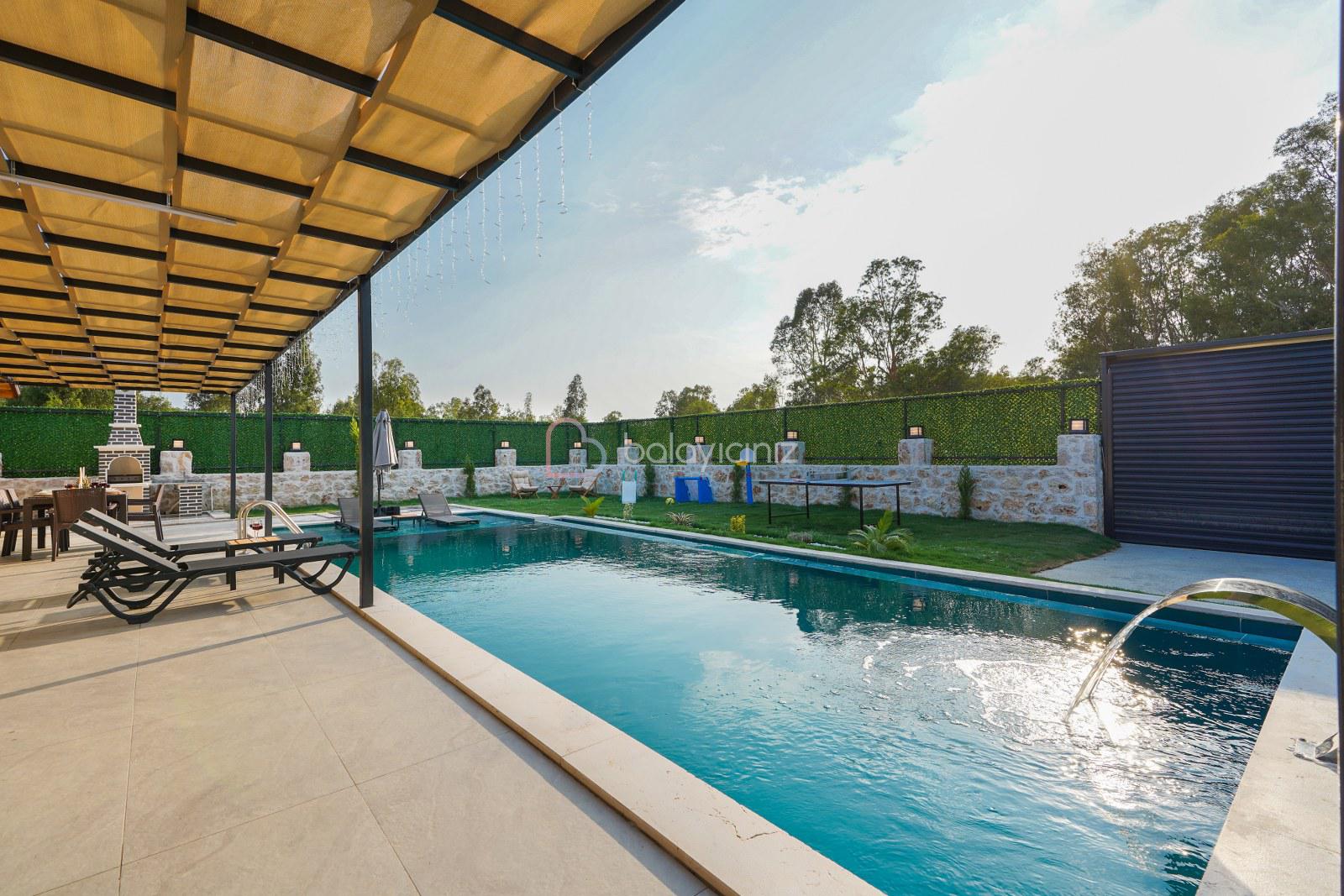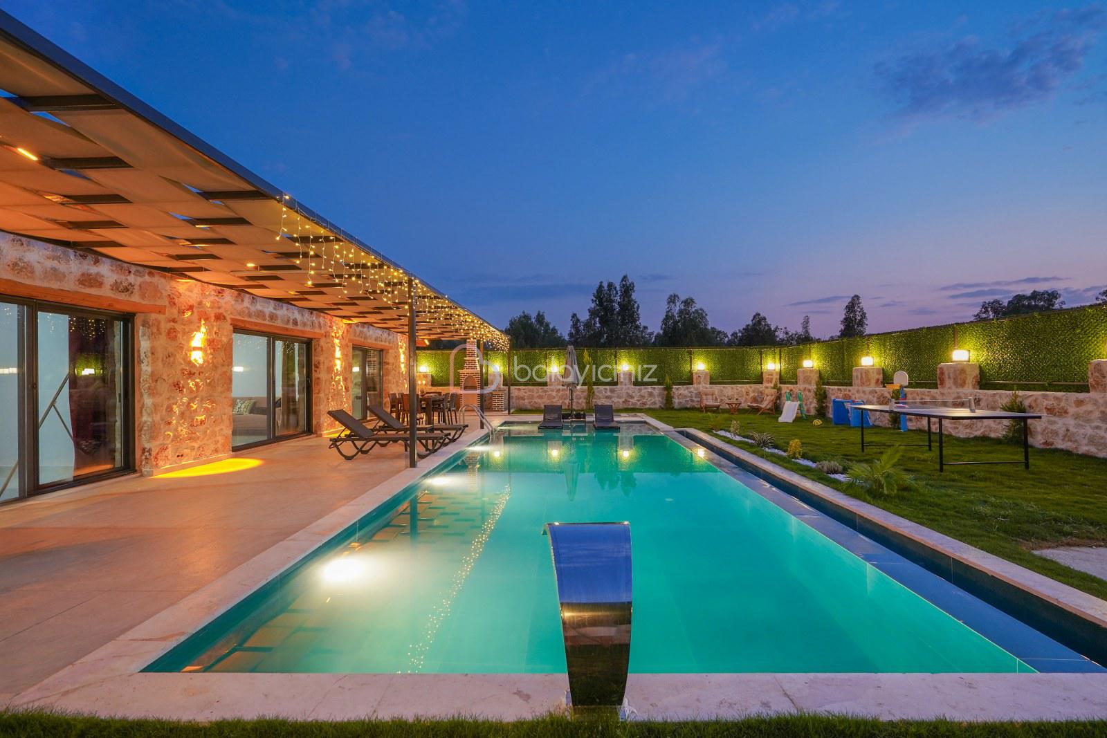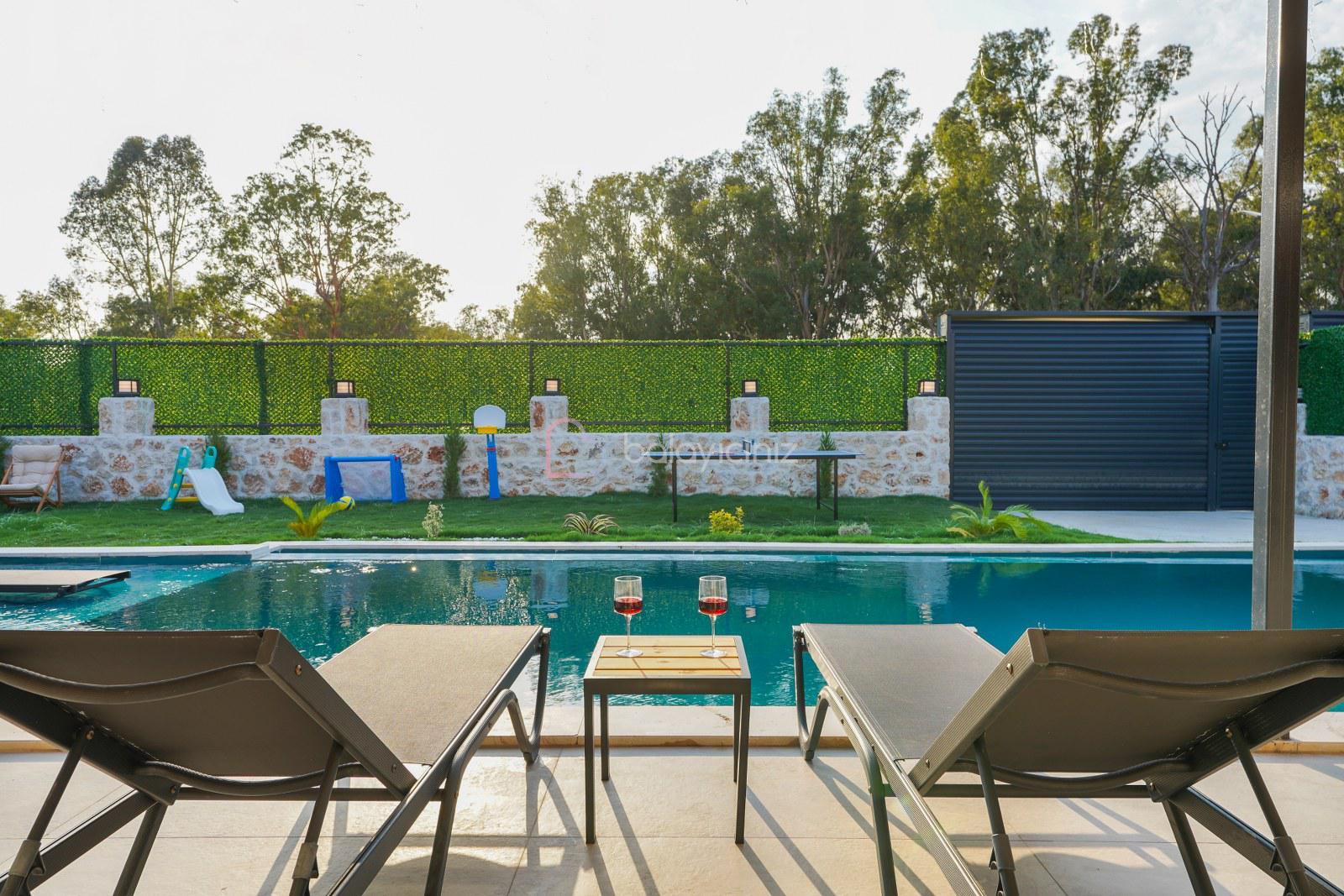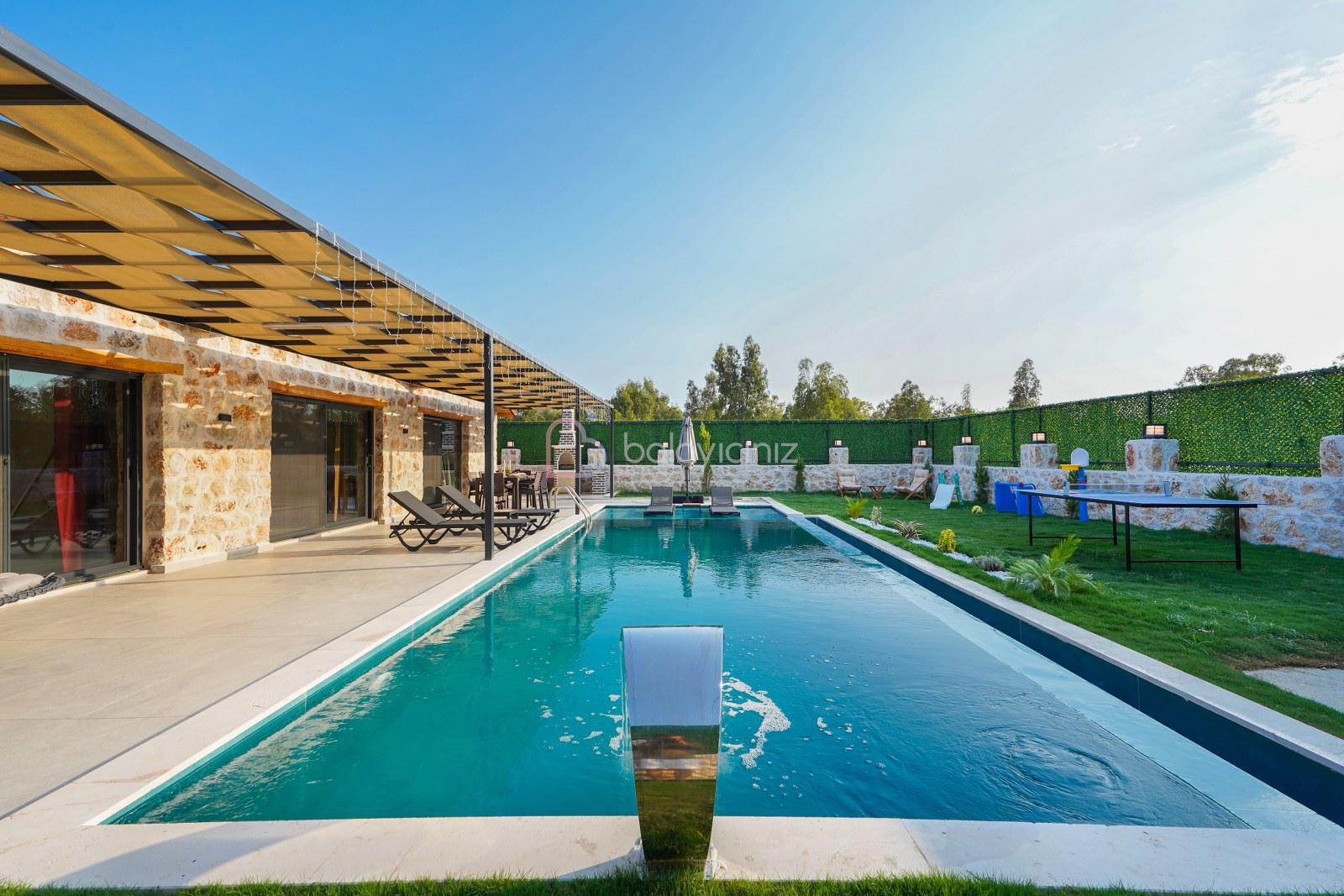Şezlong, barbekü alanı, yemek masası, masa tenisi, çocuk oyun alanı, oturma takımı, salıncak bulunmaktadır.