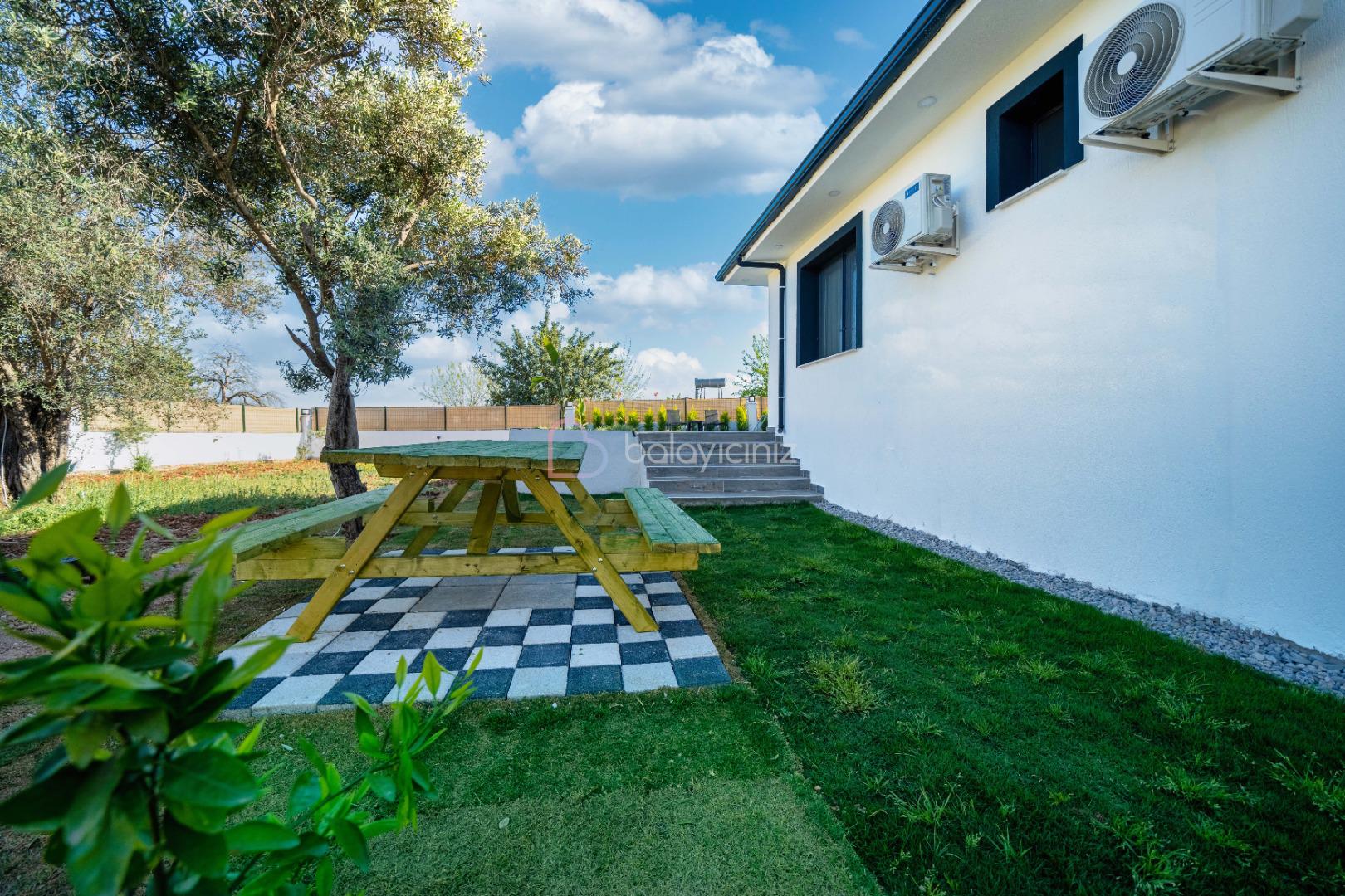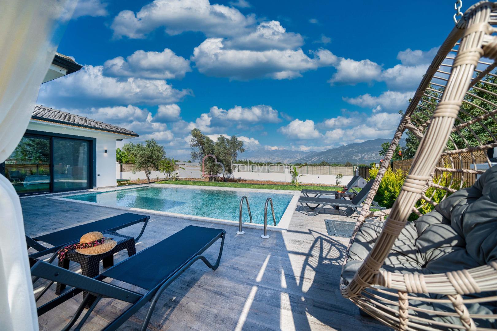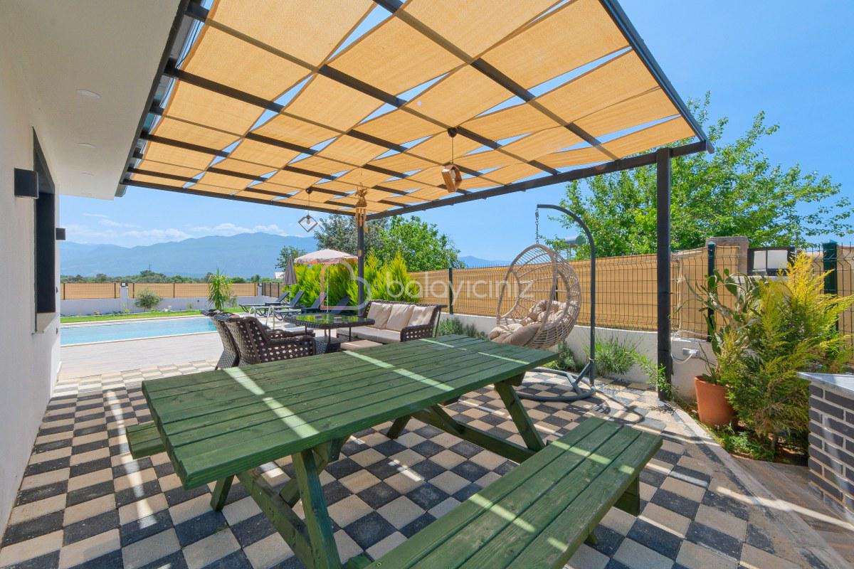 Şezlonglar, güneş şemsiyesi, salıncak, barbekü, yemek masası ve sandalyeler bulunmaktadir.