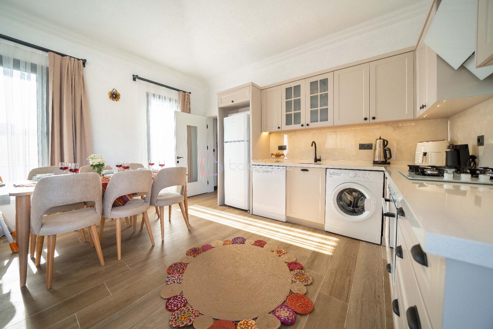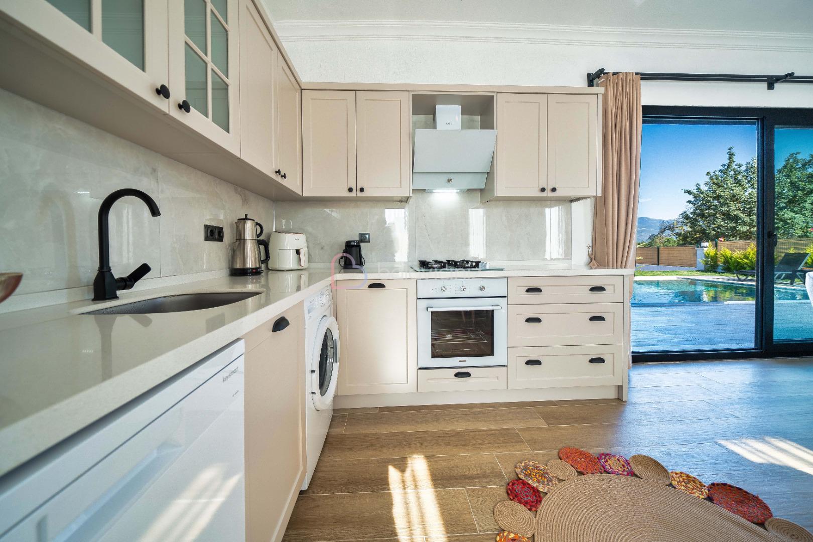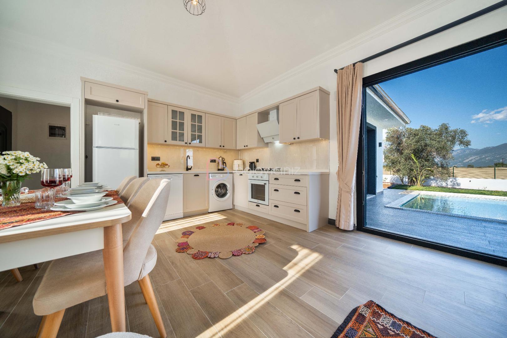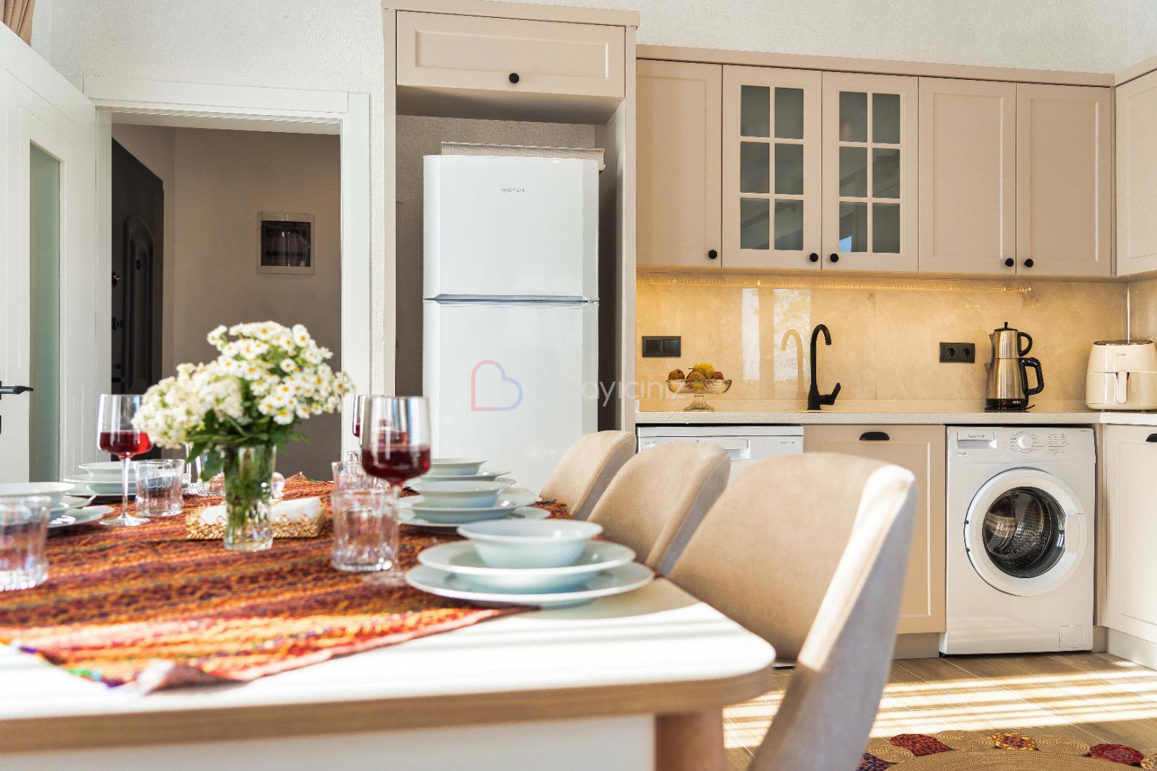 Buzdolabı, fırın, çamaşır makinesi, bulaşık makinesi, 4’lü ocak, elektrikli su ısıtıcısı (kettle), elektrikli süpürge, yemek takımı, tava, tencereler, çatal ve bıçak takımı ve diğer mutfak malzemesi mevcuttur. Havuz terasına çıkış bulunmaktadir.
