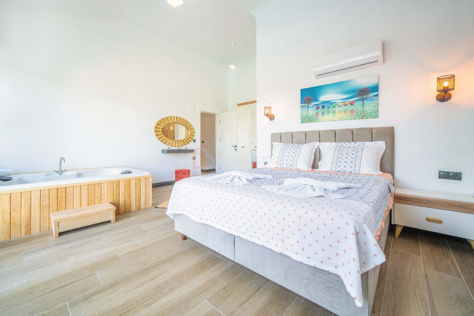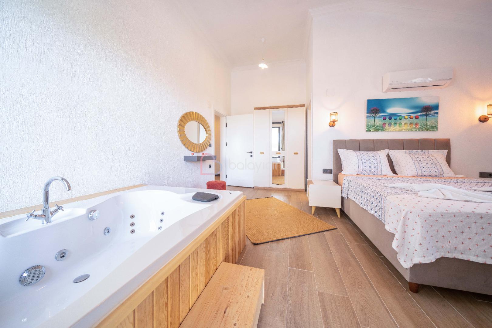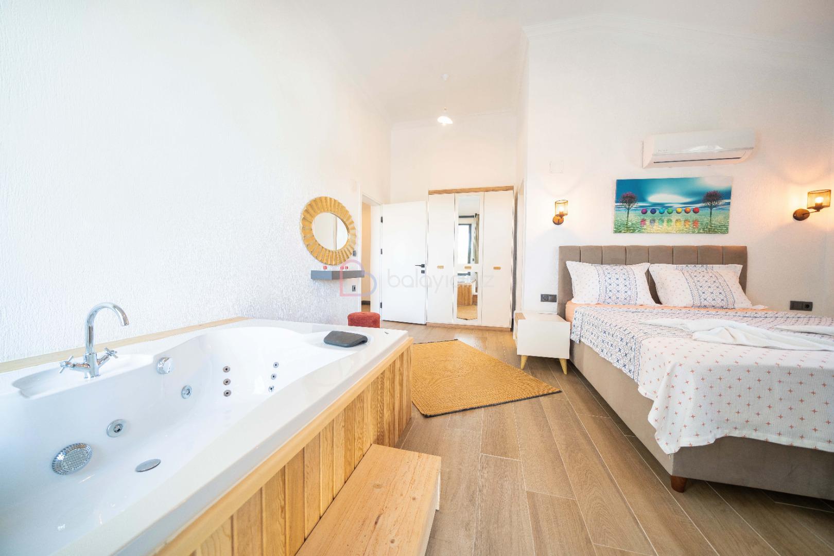 1.Yatak odası: 1 adet çift kişilik yatak, elbise dolabı, komodin, makyaj masası, klima, jakuzi, banyo ve tuvalet bulunmaktadir.