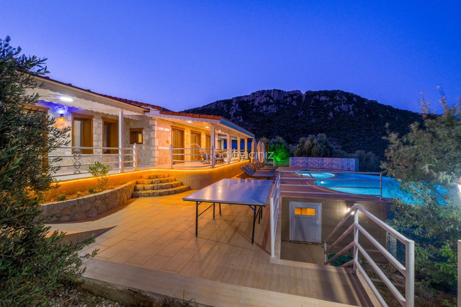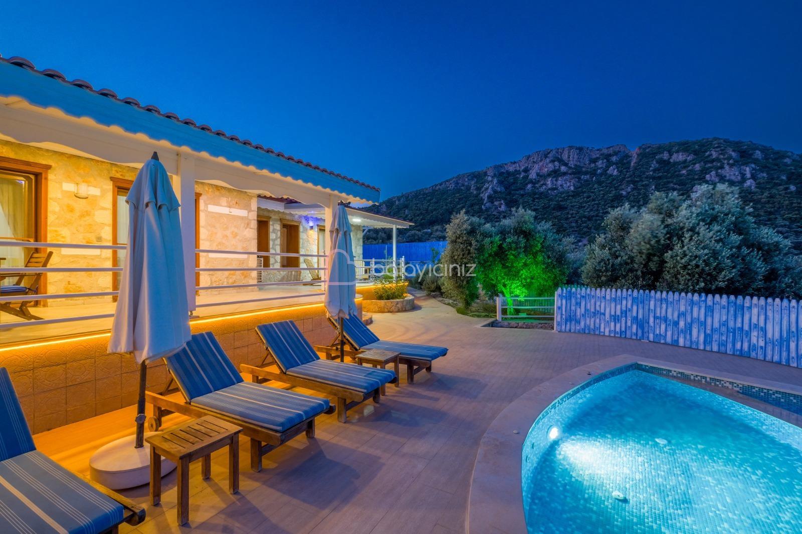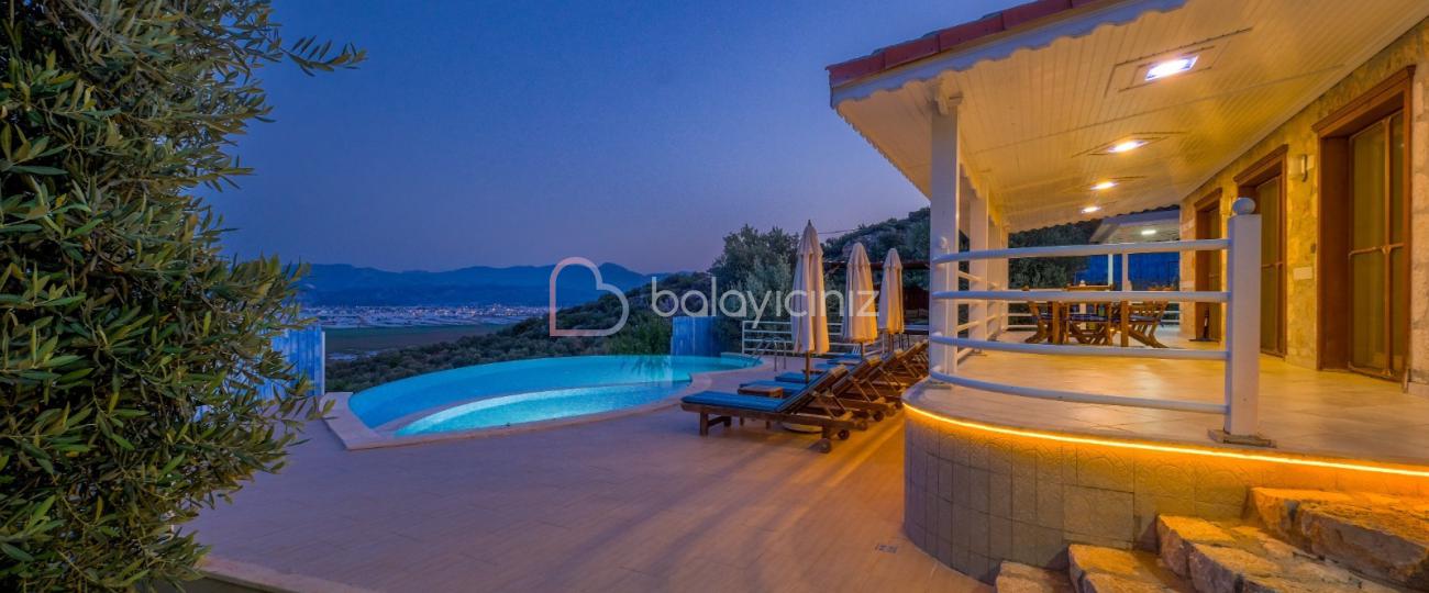 Villa Hüma, Kalkan Üzümlü mevkiinde bulunan korunaklı, jakuzili, doğa ve deniz manzaralı, özel havuzlu villadır. Villamız otantik bir konseptin modern tas mimari ile birleşimi olarak sunuluyor. Balayı çiftlerimize, kalabalık geniş aile, arkadaş grupları için şehir gürültüsünden, gözlerden uzak doğa içerisinde tatil imkânı sunmaktadır. Villamızı özel havuzu dışarıdan görünmeyecek şekilde kapatılmış olup sizlere ayrıcalıklı tatil imkânı sunmaktadır.