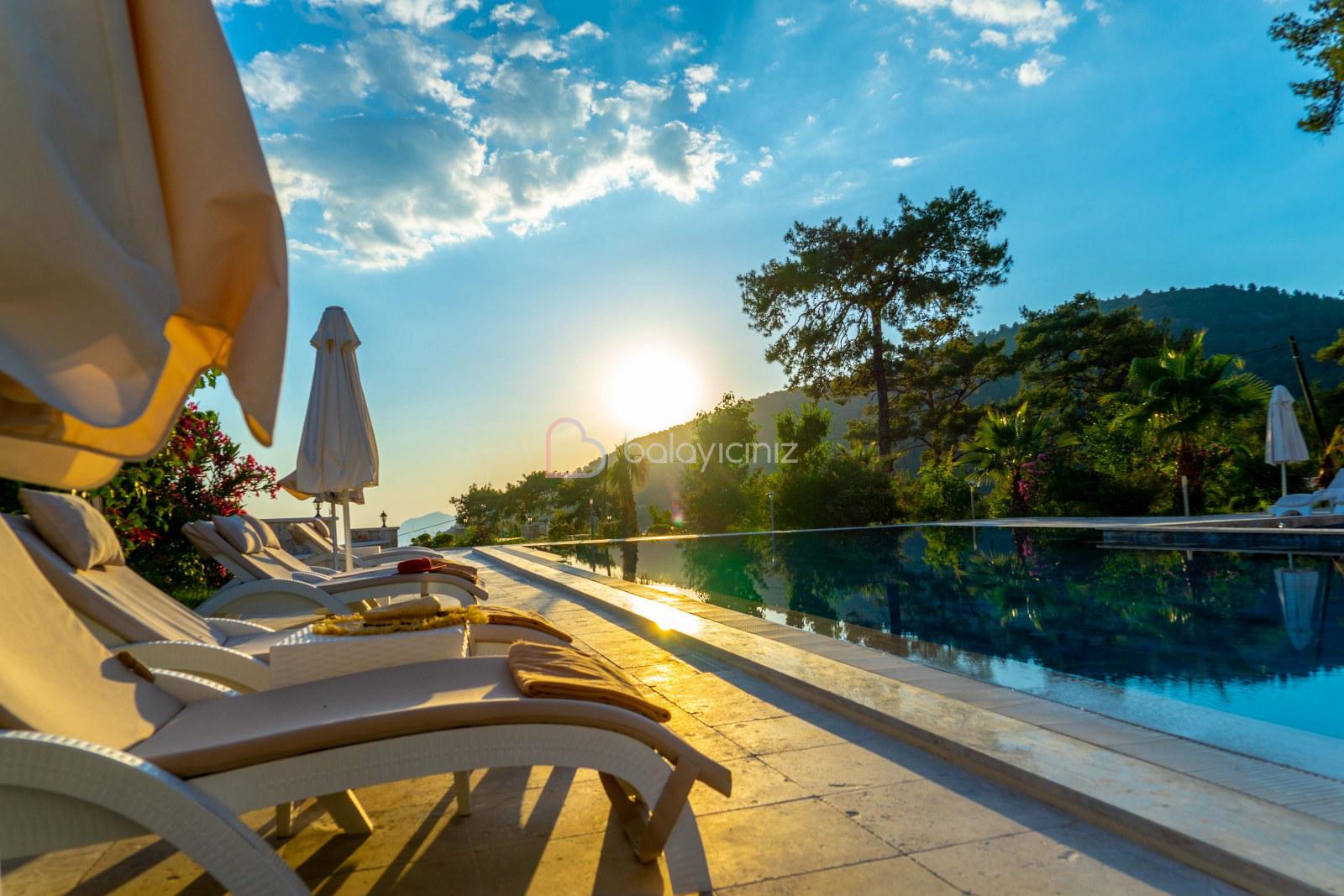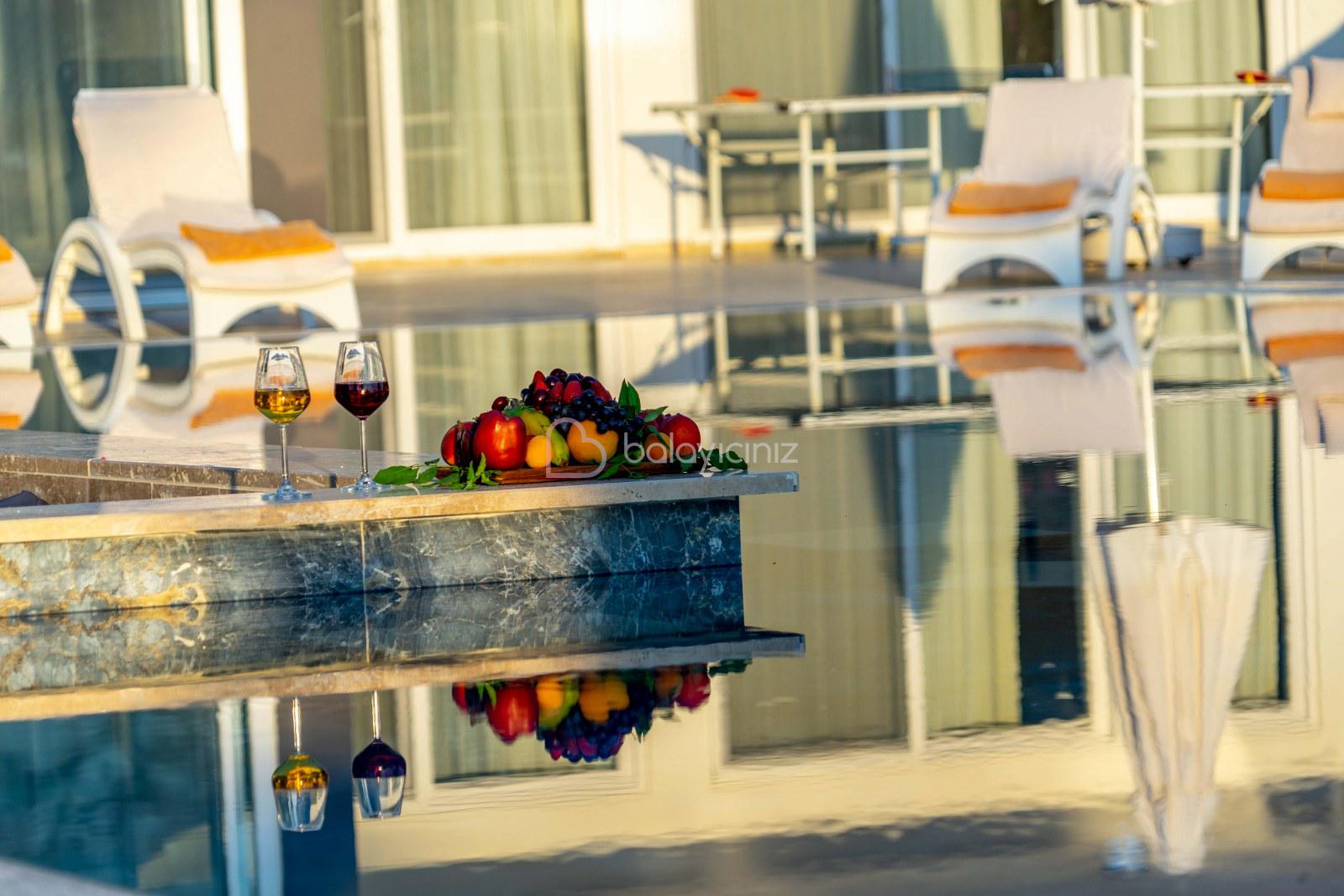 Havuz başında şezlong, şemsiye, mangal, masa ve sandalyeler bulunmaktadır.