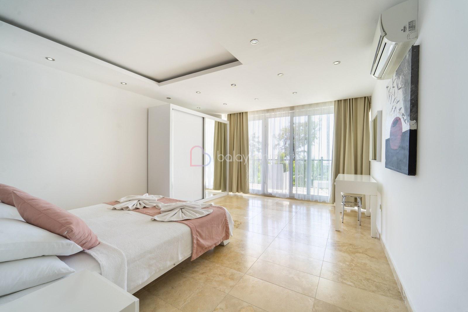 Yatak Odası 1: Suit doğa manzaralı odada çift kişilik yatak, komodin, klima, makyaj masası, elbise dolabı, ebeveyn banyosu bulunmaktadır.