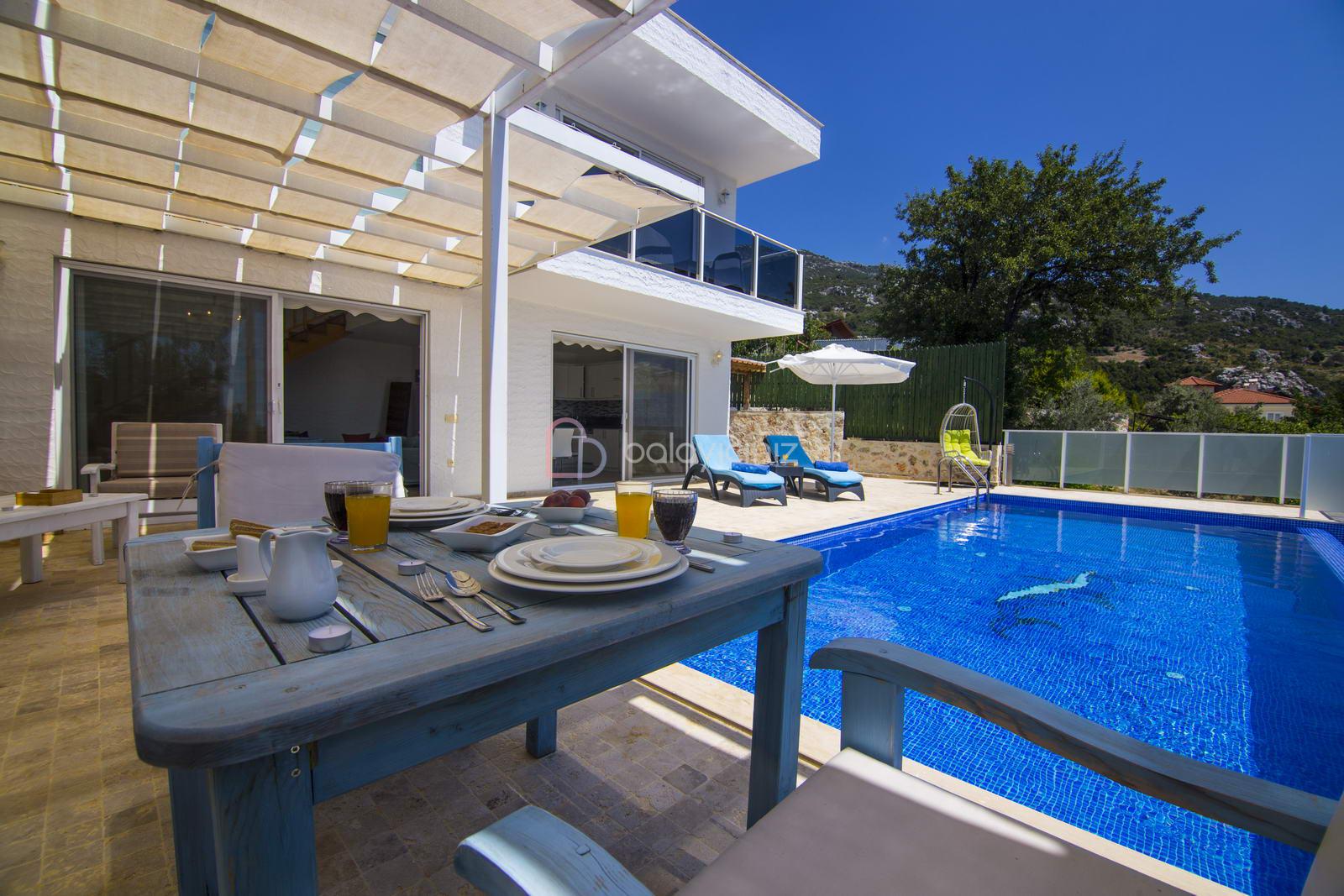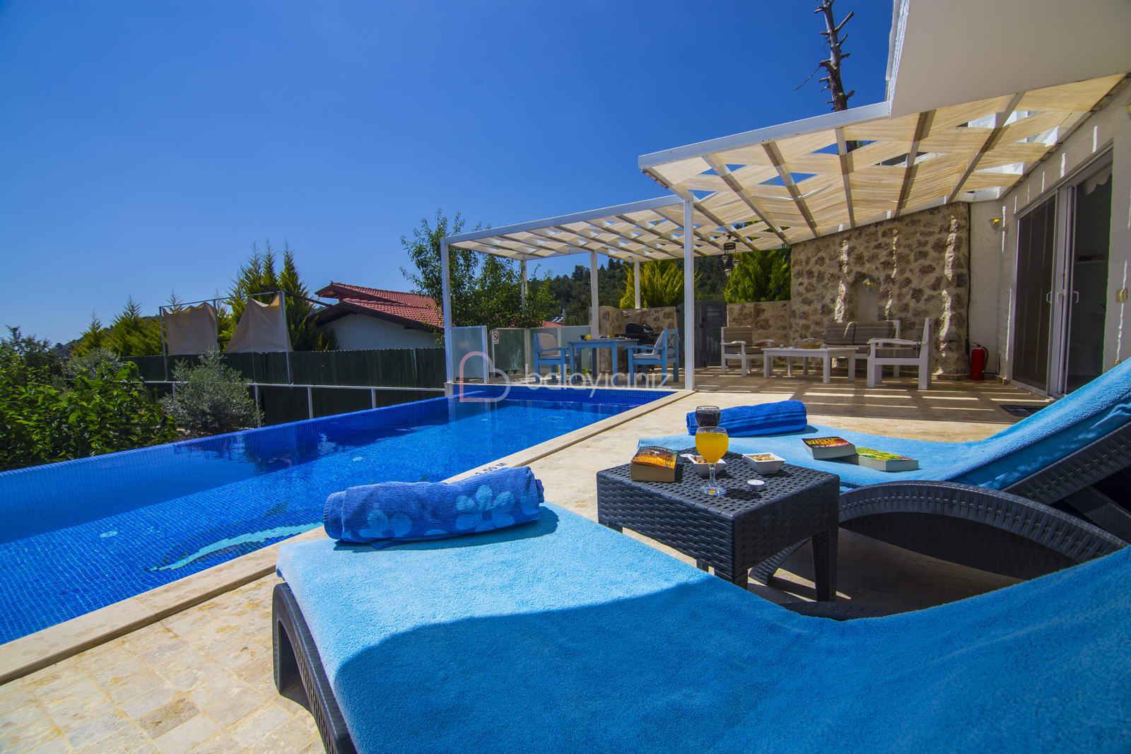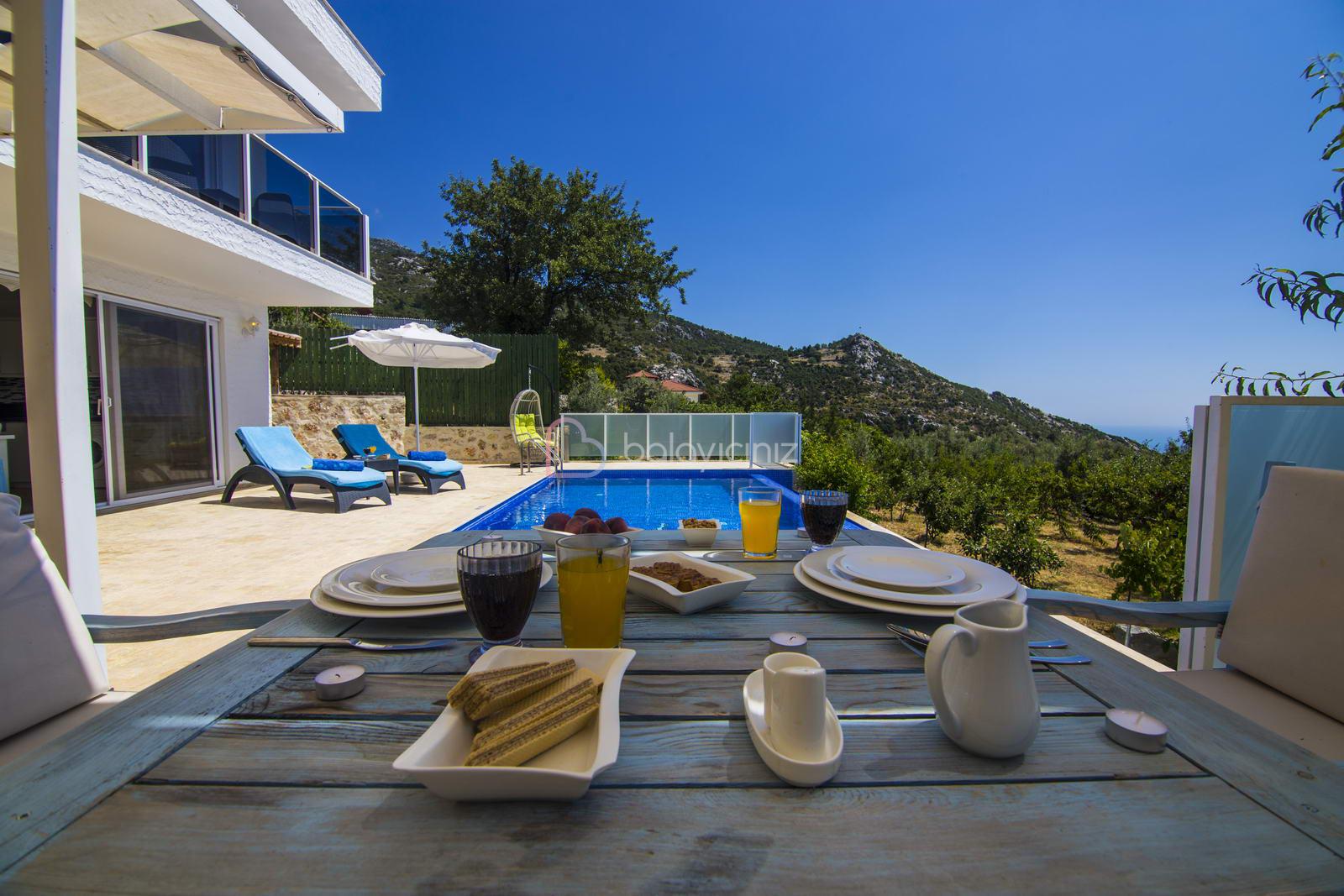 Not : Villanın güneşlenme terası ve havuzunun dış taraftan görünmemesi için gerekli önlemler alınmıştır fakat villanın diğer bölümlerinin görünürlüğü kesin olarak garanti edilememektedir.