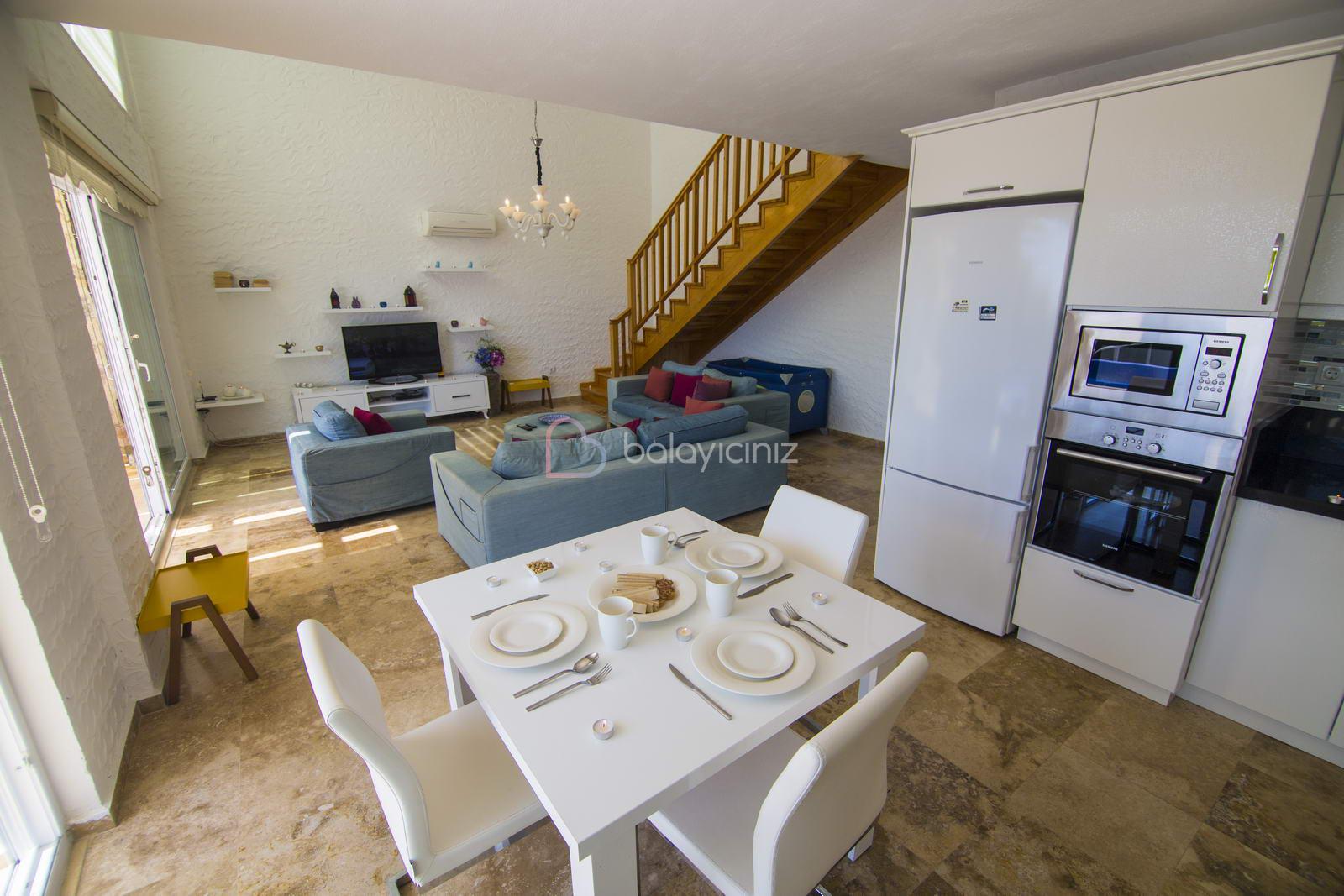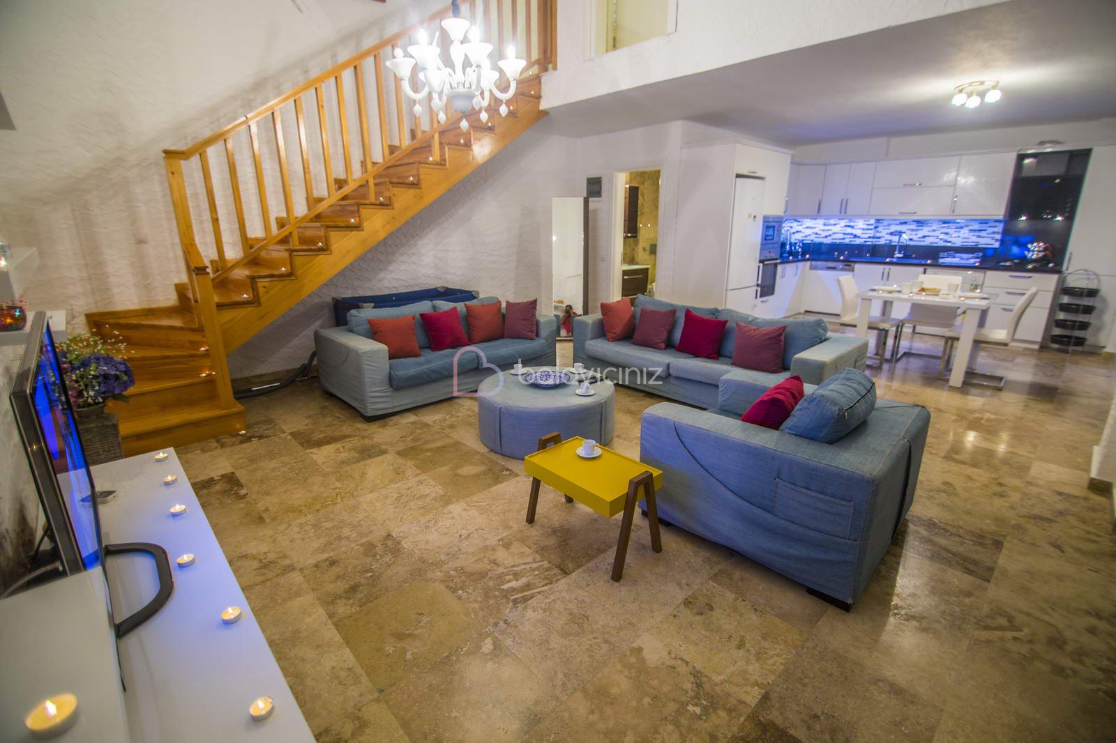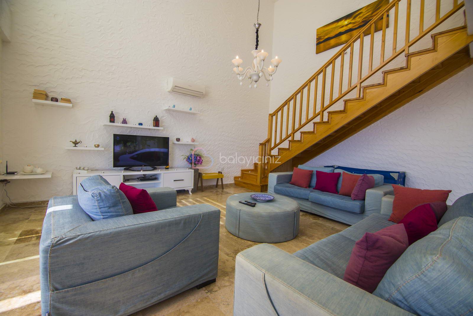 Oturma grubu, televizyon, uydu alıcı, klima, internet için modem ve havuz terasına çıkış bulunmaktadır.