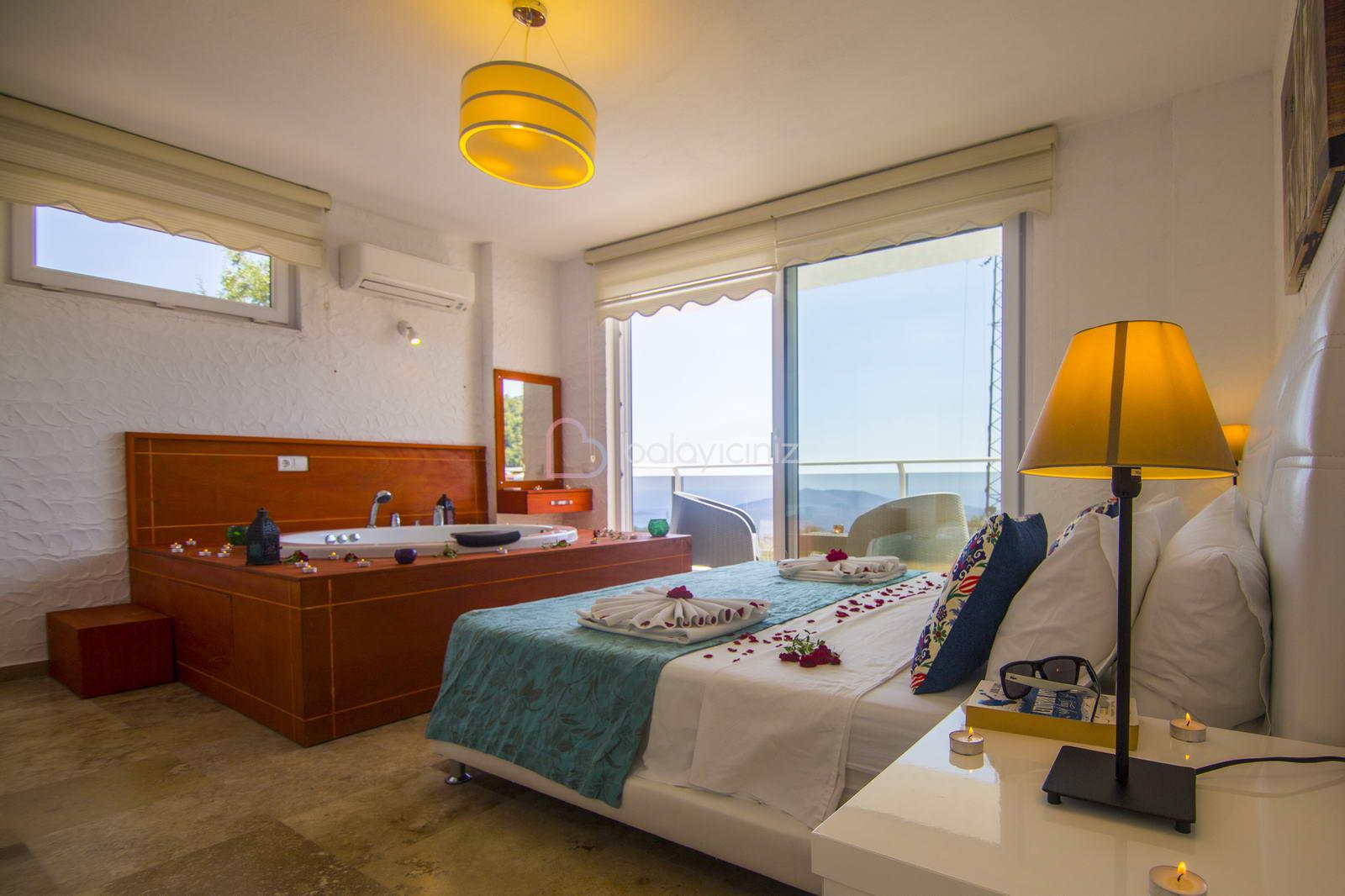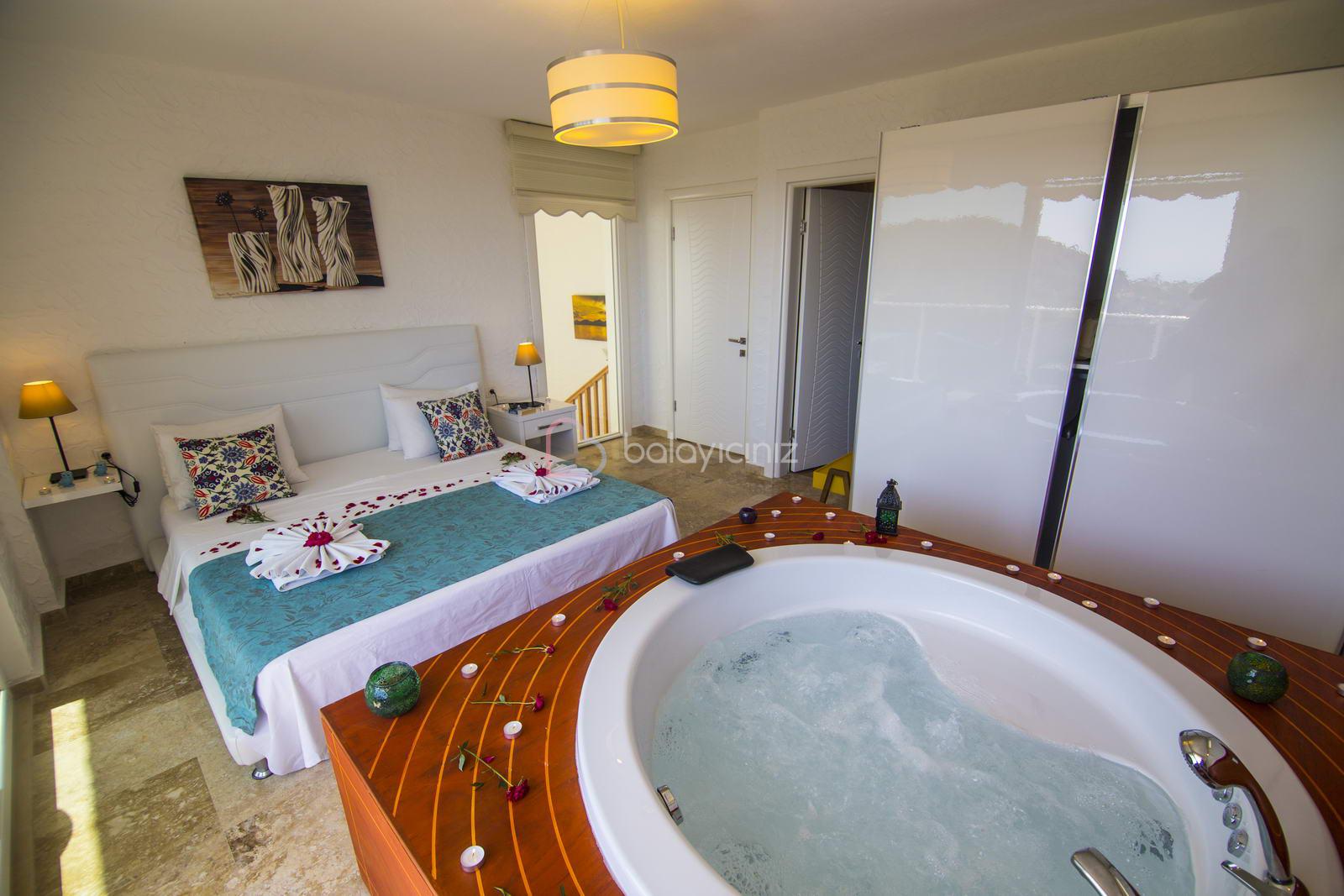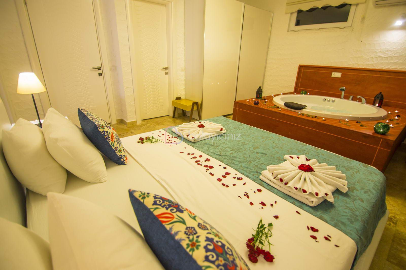 1.Yatak Odası: 1 adet çift kişilik yatak, komodin, elbise dolabı, makyaj masası, klima, banyo, jakuzi, tuvalet ve havuz terasına çıkış bulunmaktadır.
