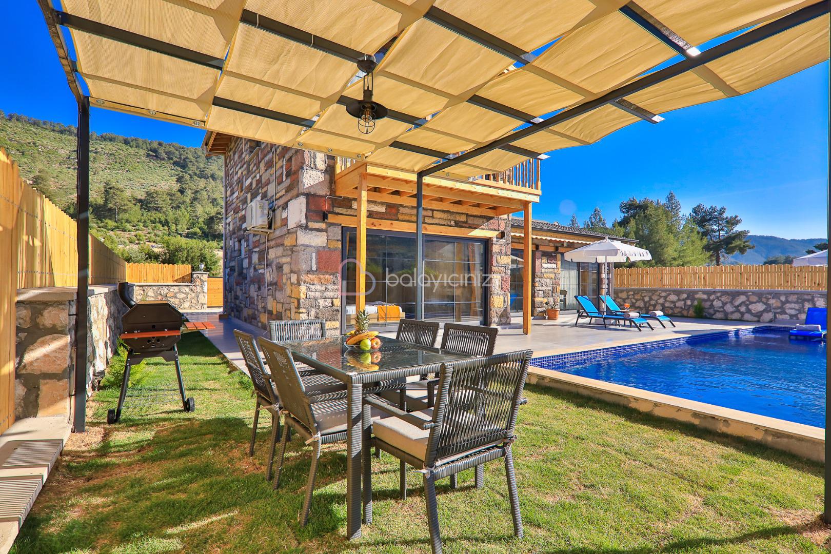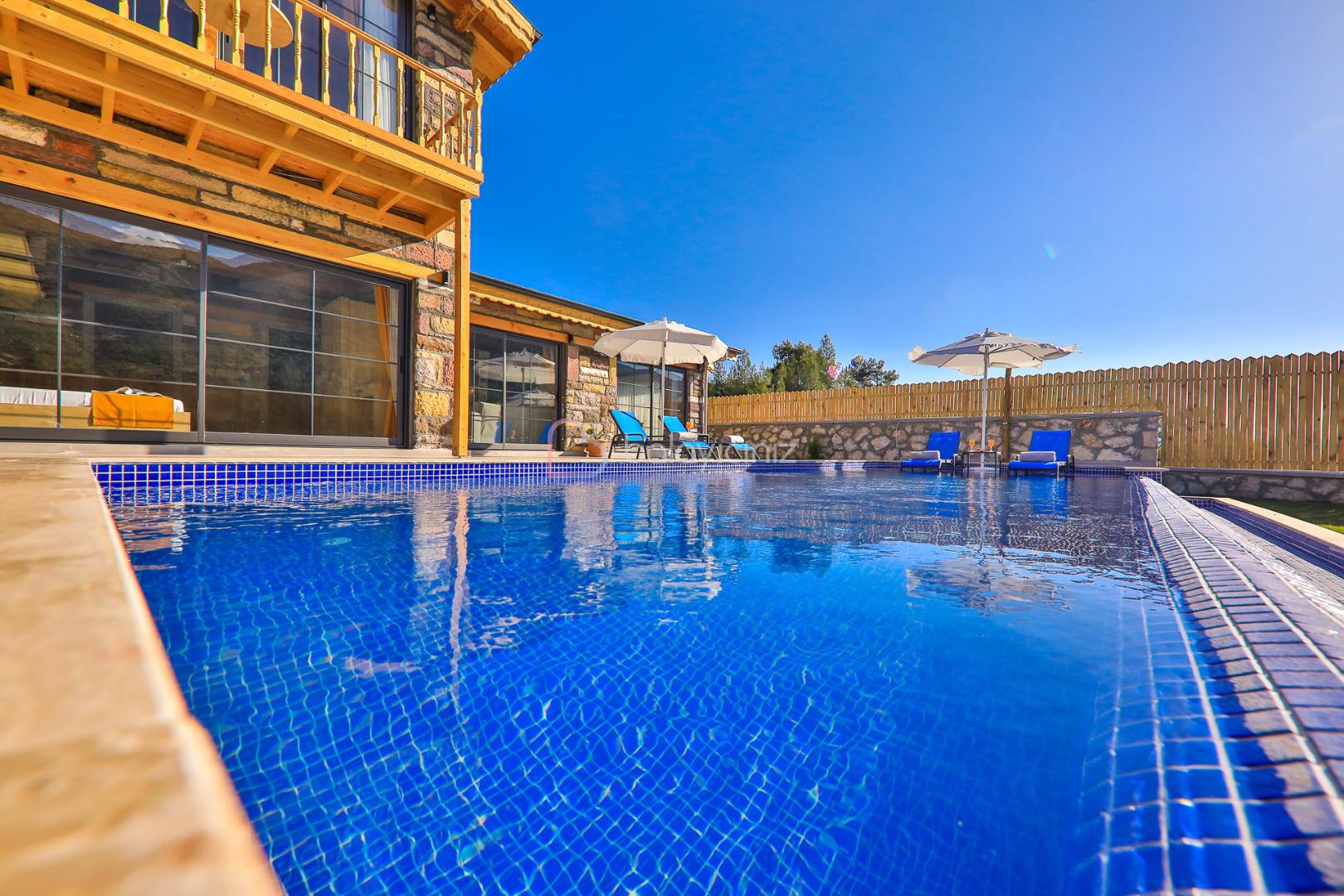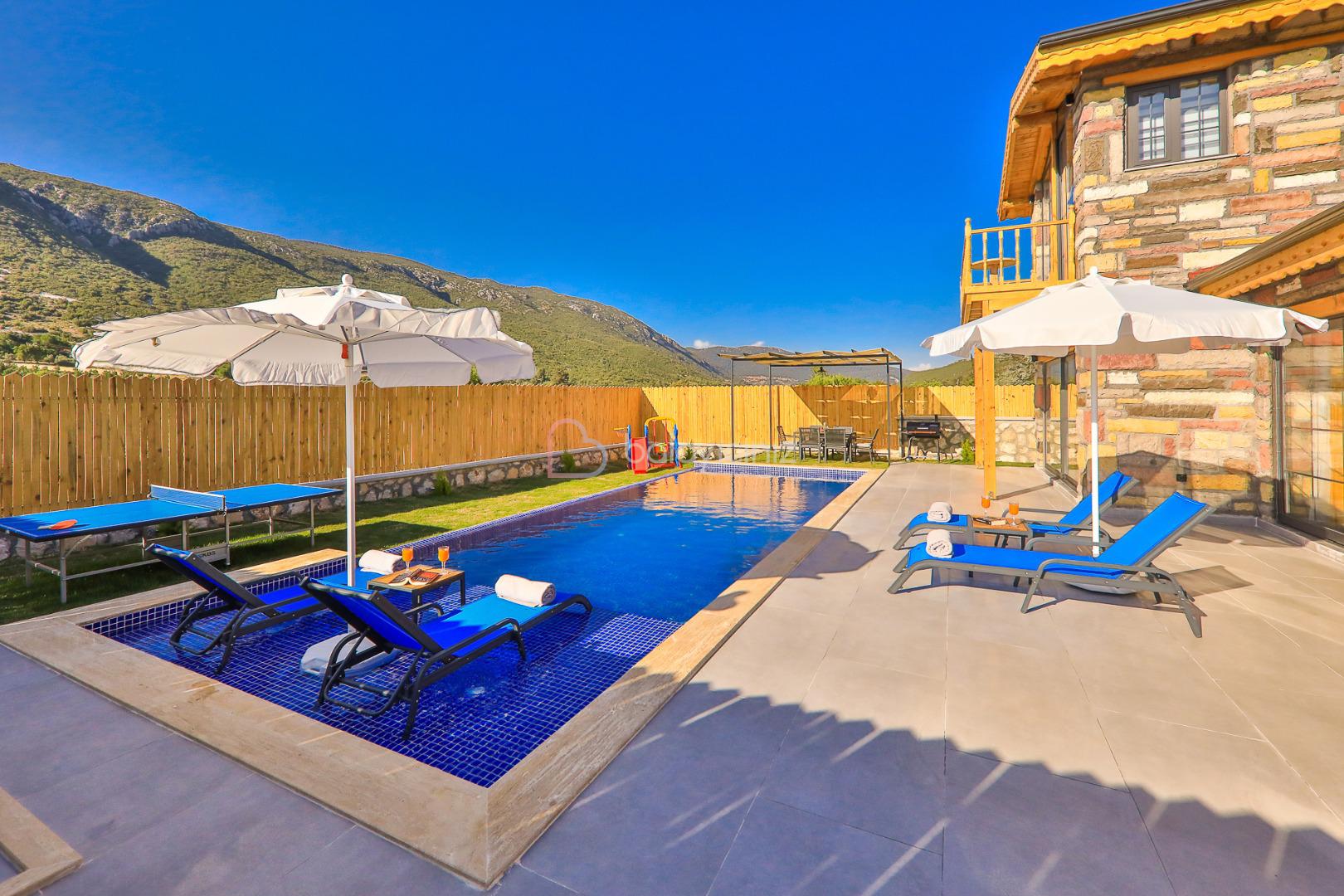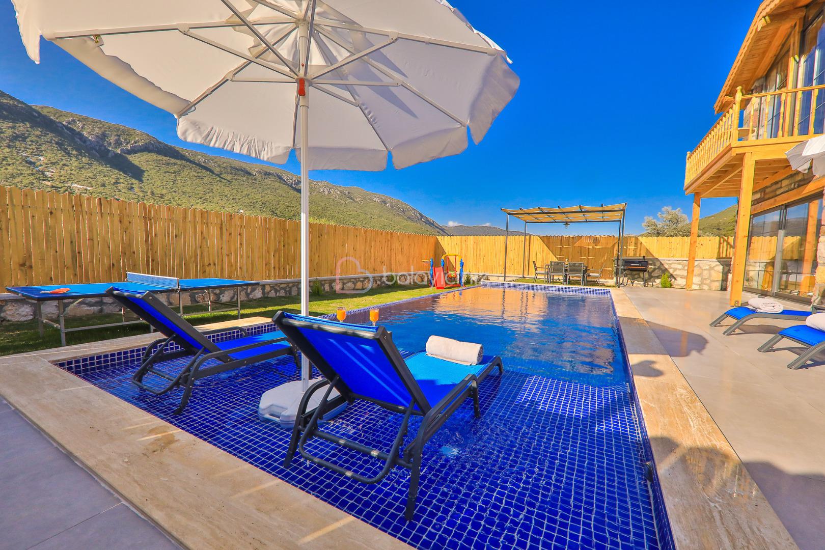 Villamızın özel yüzme havuzu muhafazakâr olup dışarıdan kesinlikle görünmemektedir. Şezlong, şemsiye, yemek masası, mangal bulunmaktadır.
