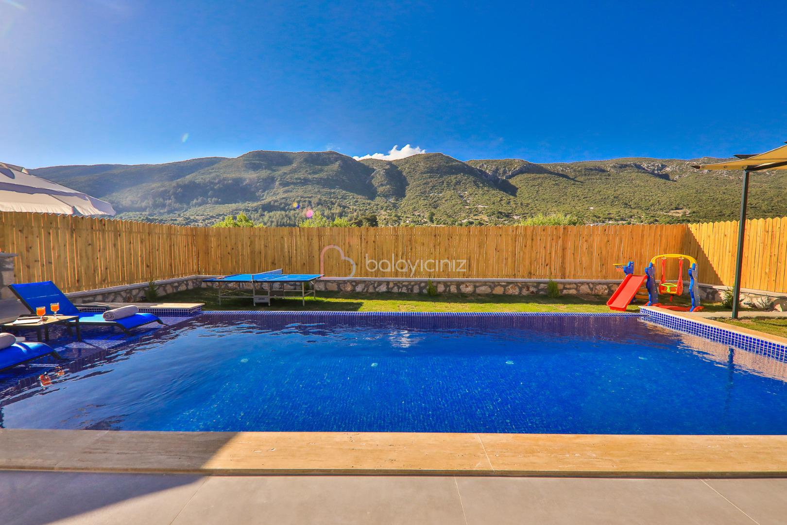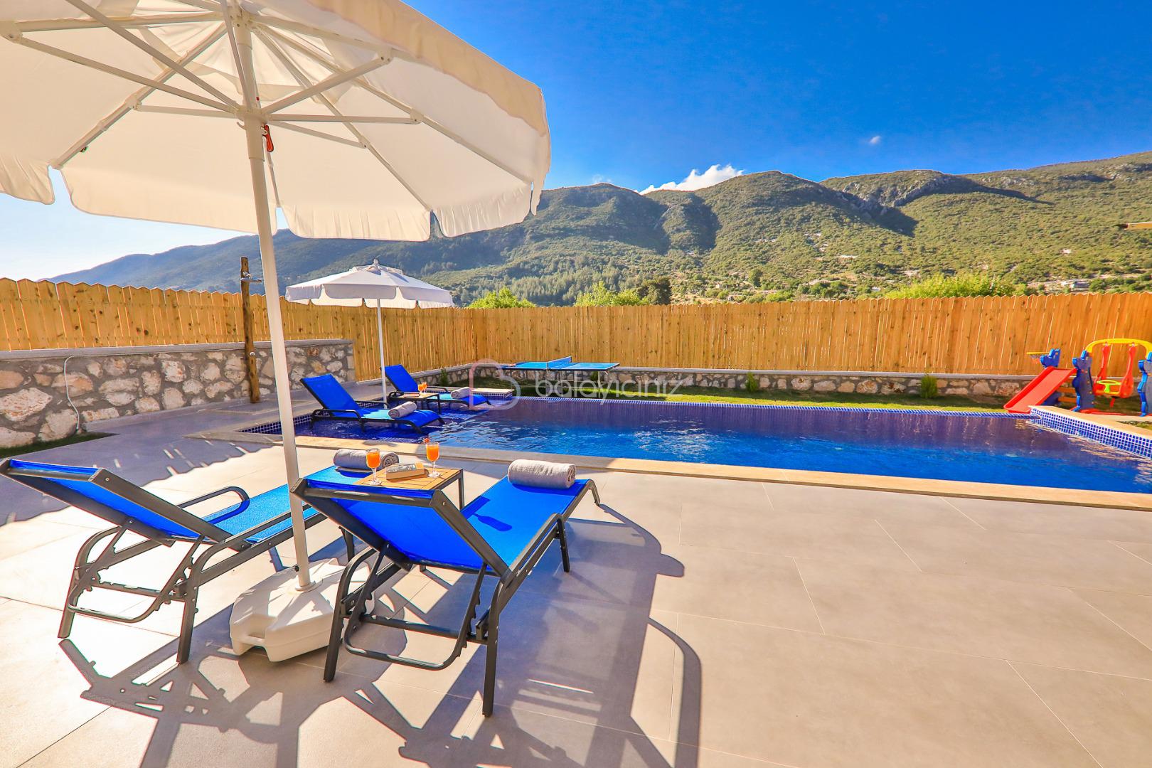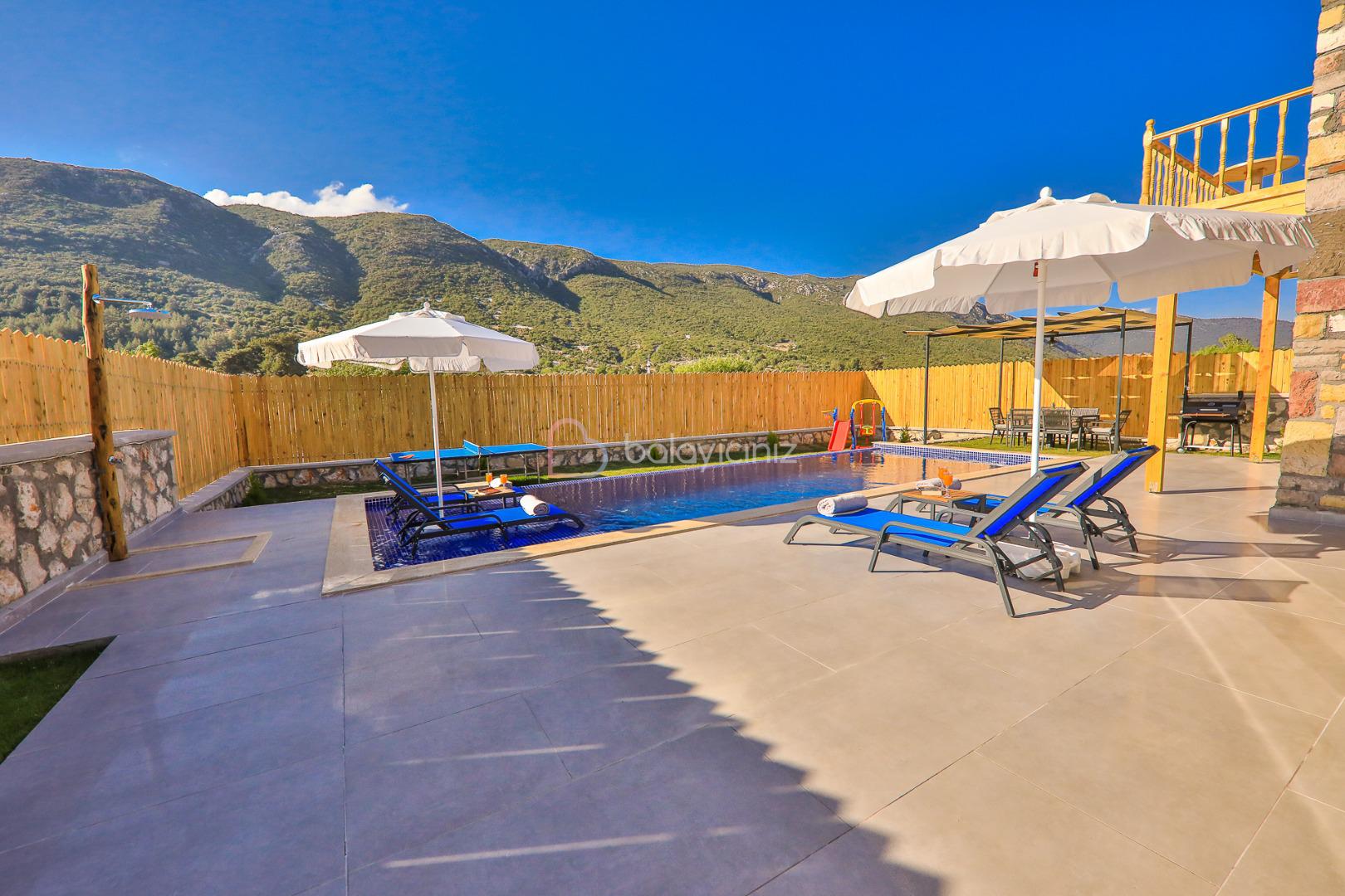 Villamızın özel yüzme havuzu muhafazakâr olup dışarıdan kesinlikle görünmemektedir. Şezlong, şemsiye, yemek masası, mangal bulunmaktadır.