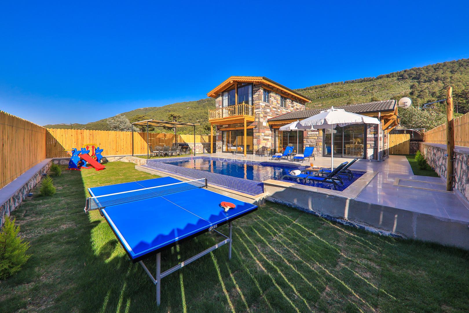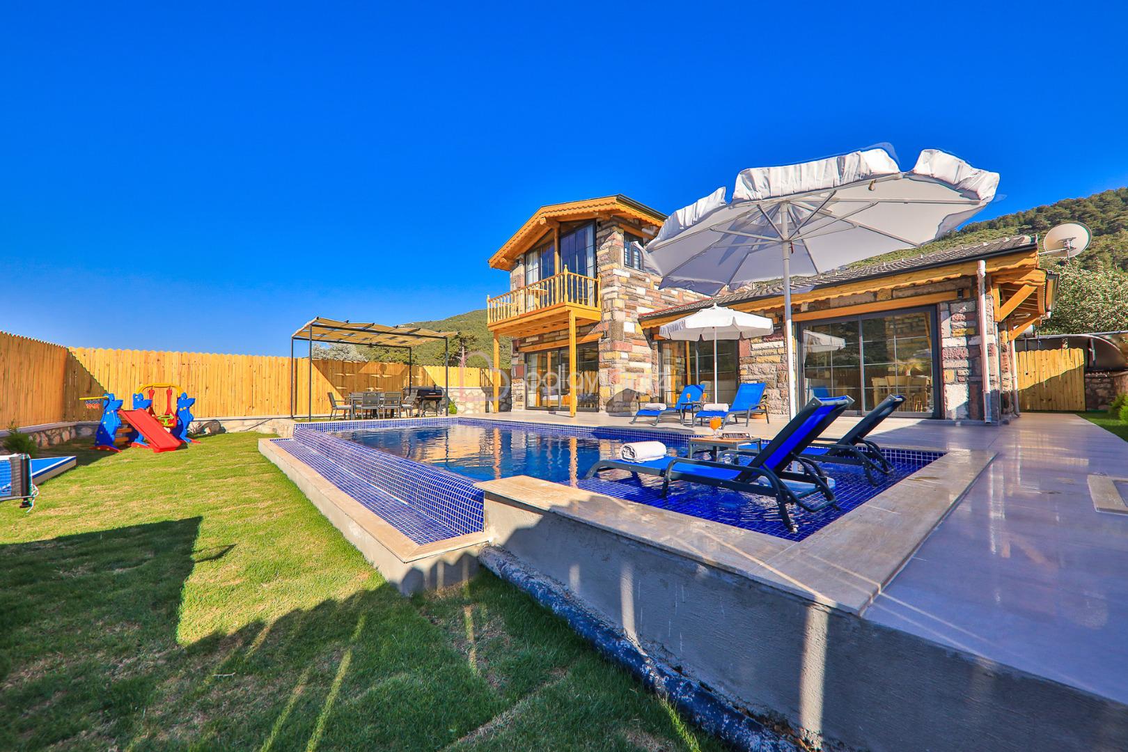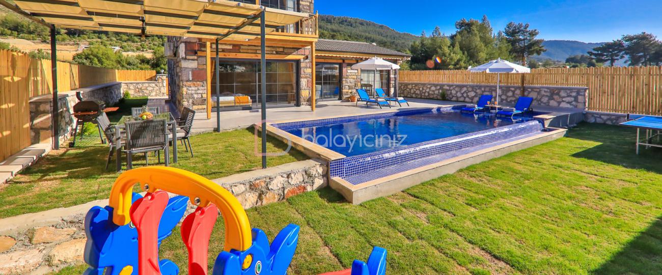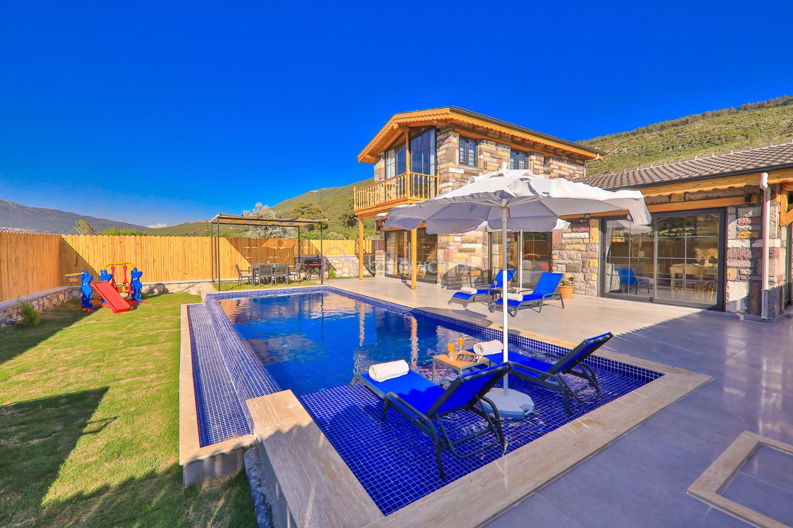 Villamızın özel yüzme havuzu muhafazakâr olup dışarıdan kesinlikle görünmemektedir. Şezlong, şemsiye, yemek masası, mangal bulunmaktadır.