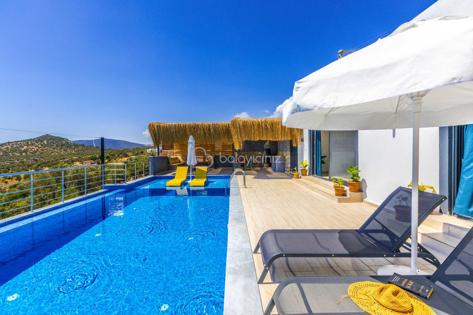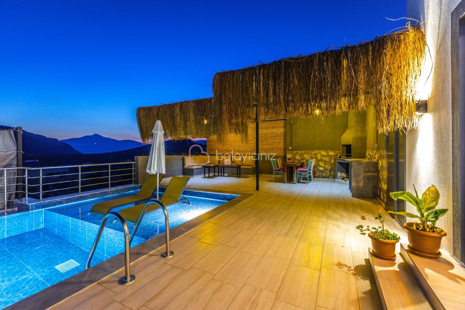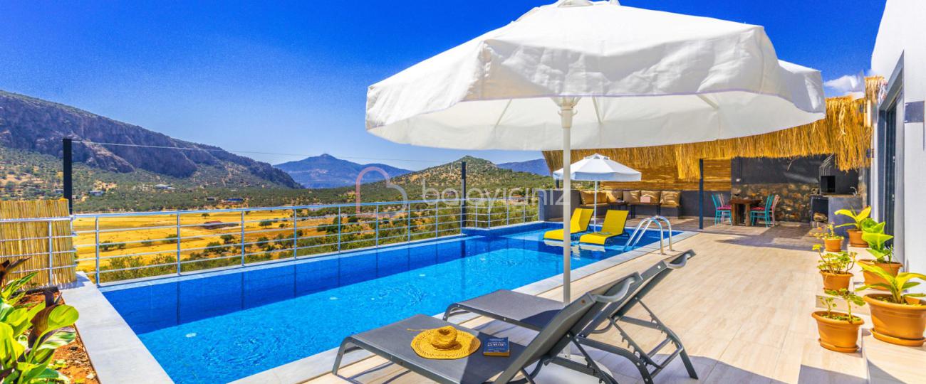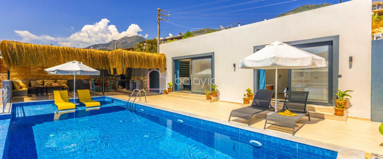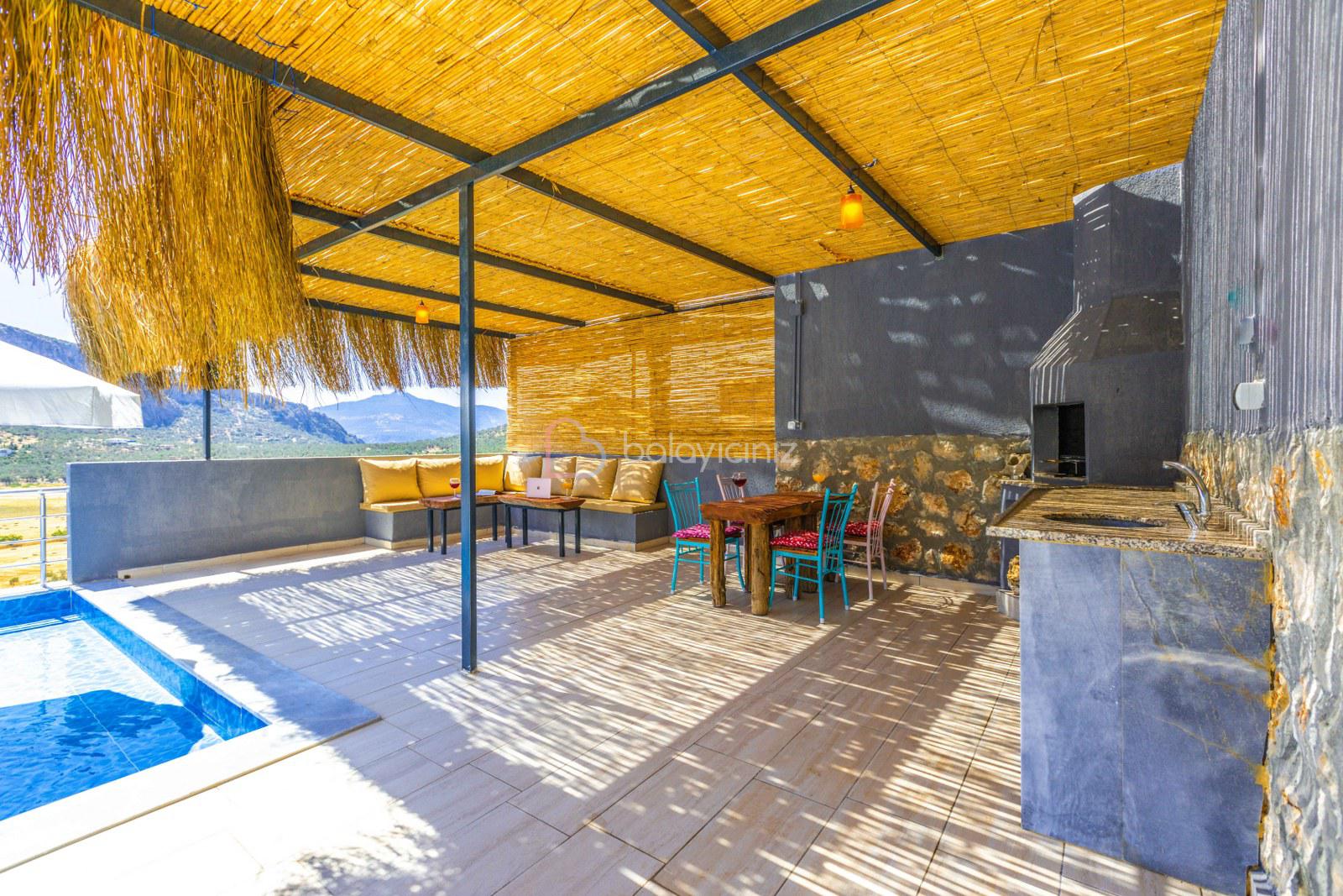 Terasında özel yüzme havuzu, şezlonglar, güneş şemsiyeleri, masa ve sandalyeler, pergole, mangal bulunmaktadır.