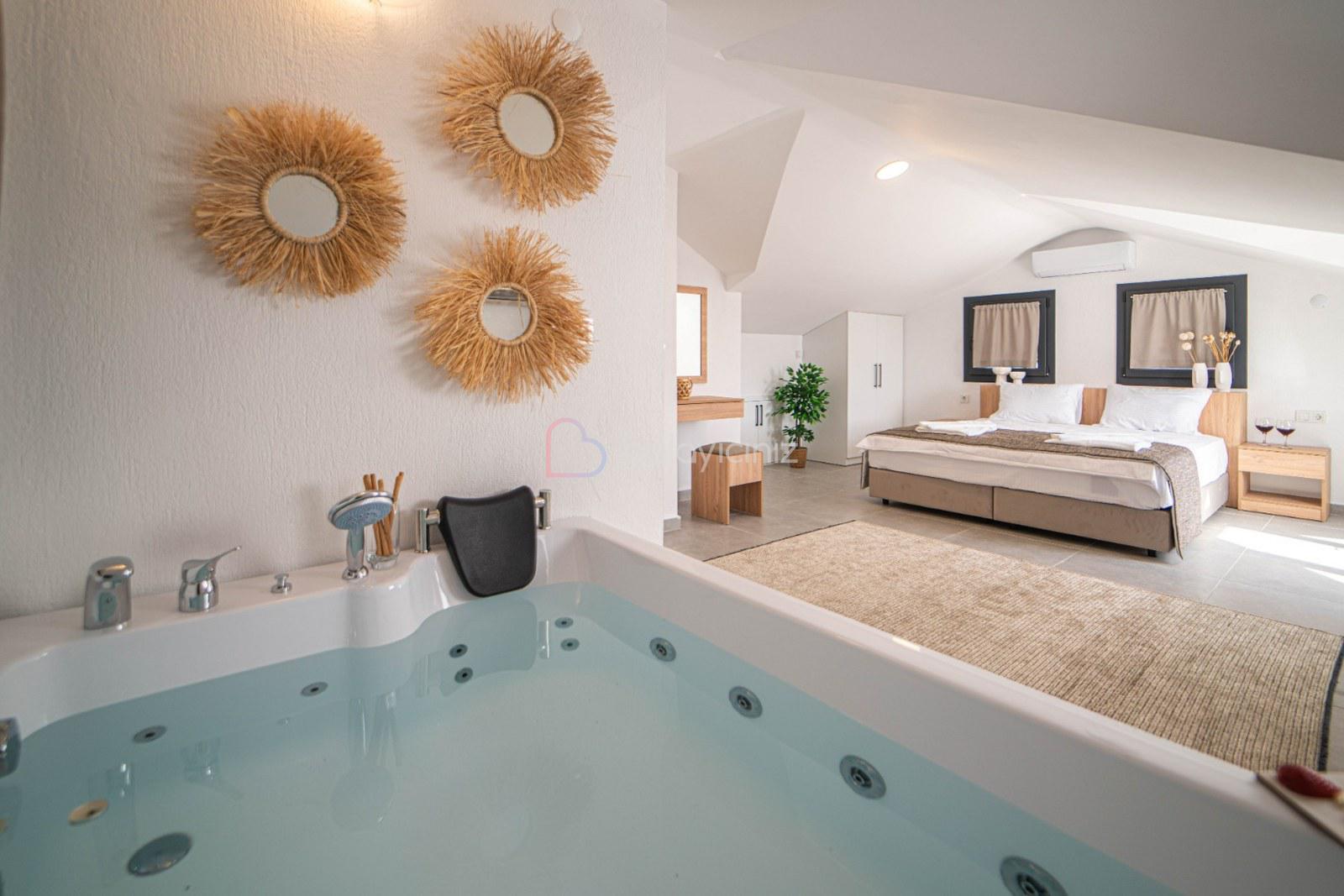 1.Yatak Odası: 1 adet çift kişilik yatak, elbise dolabı, makyaj masası, jakuzi, klima, banyo ve tuvalet bulunmaktadır.