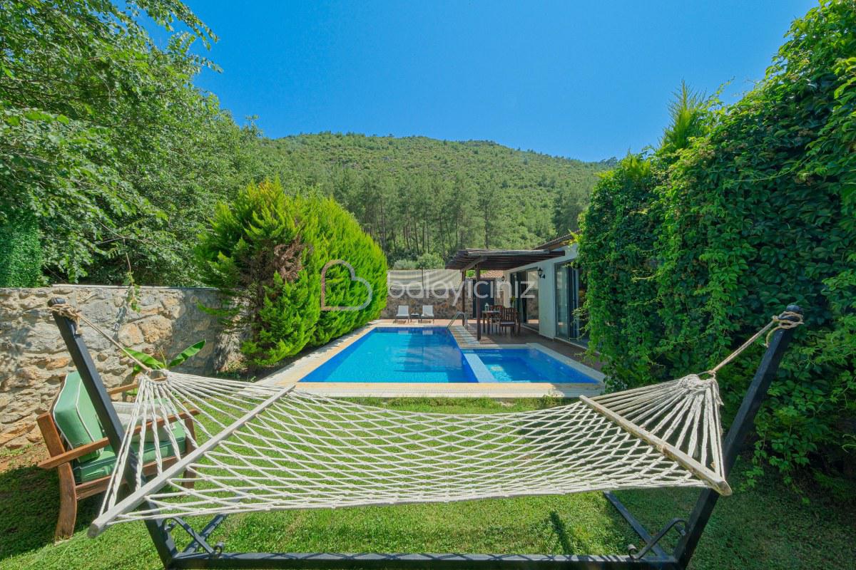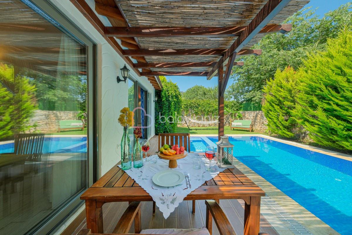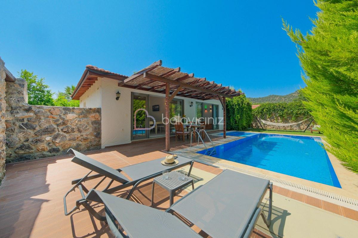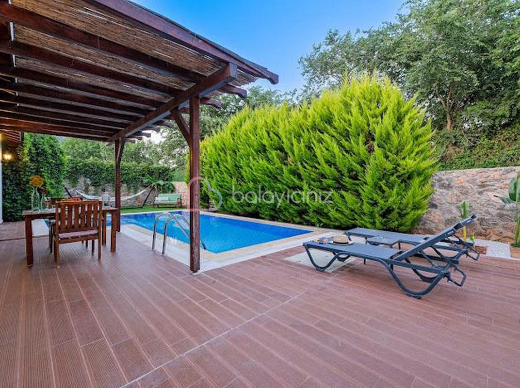Özel yüzme havuzu, şezlong, oturma alanı, hamak, mangal, yemek masası bulunmaktadır.