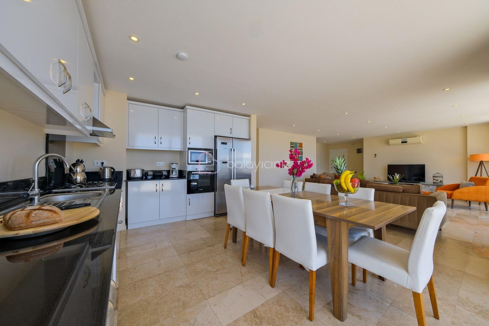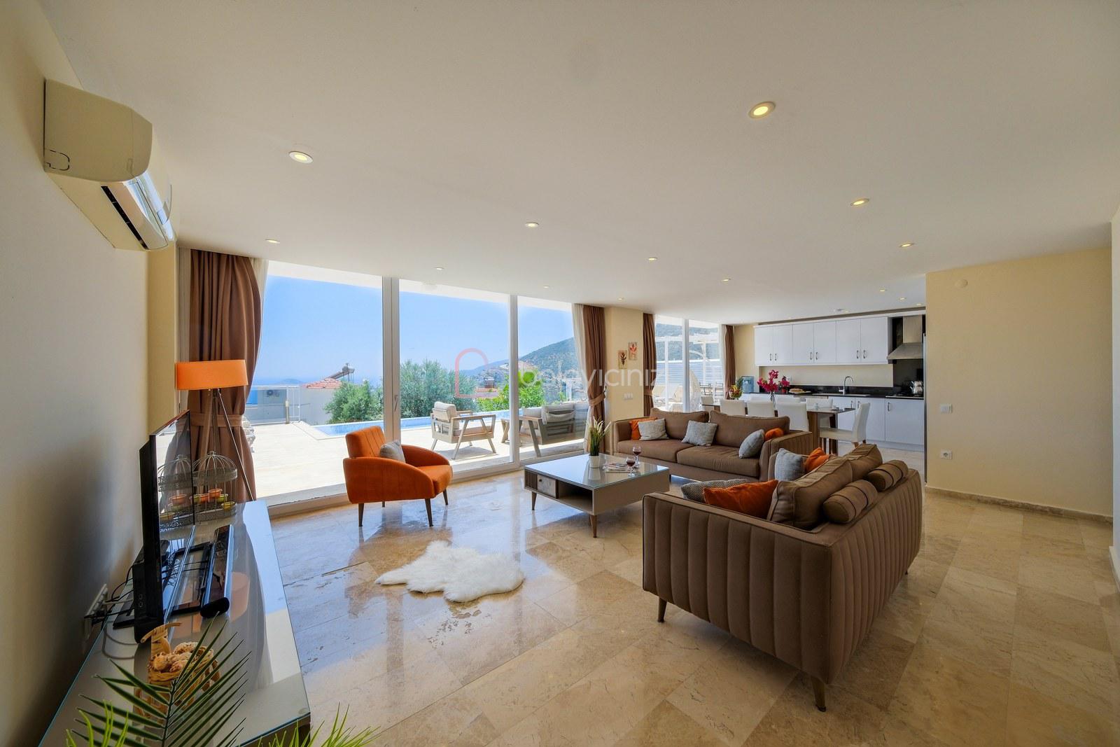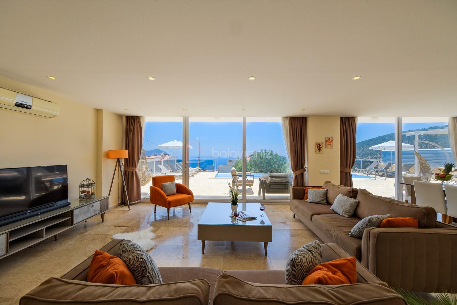 Deniz manzaralı salonunda oturma grubu, plazma TV, uydu alıcısı, elektrikli süpürge, ütü ve ütü masası, sehpa, klima ve havuz terasına çıkış bulunmaktadır.