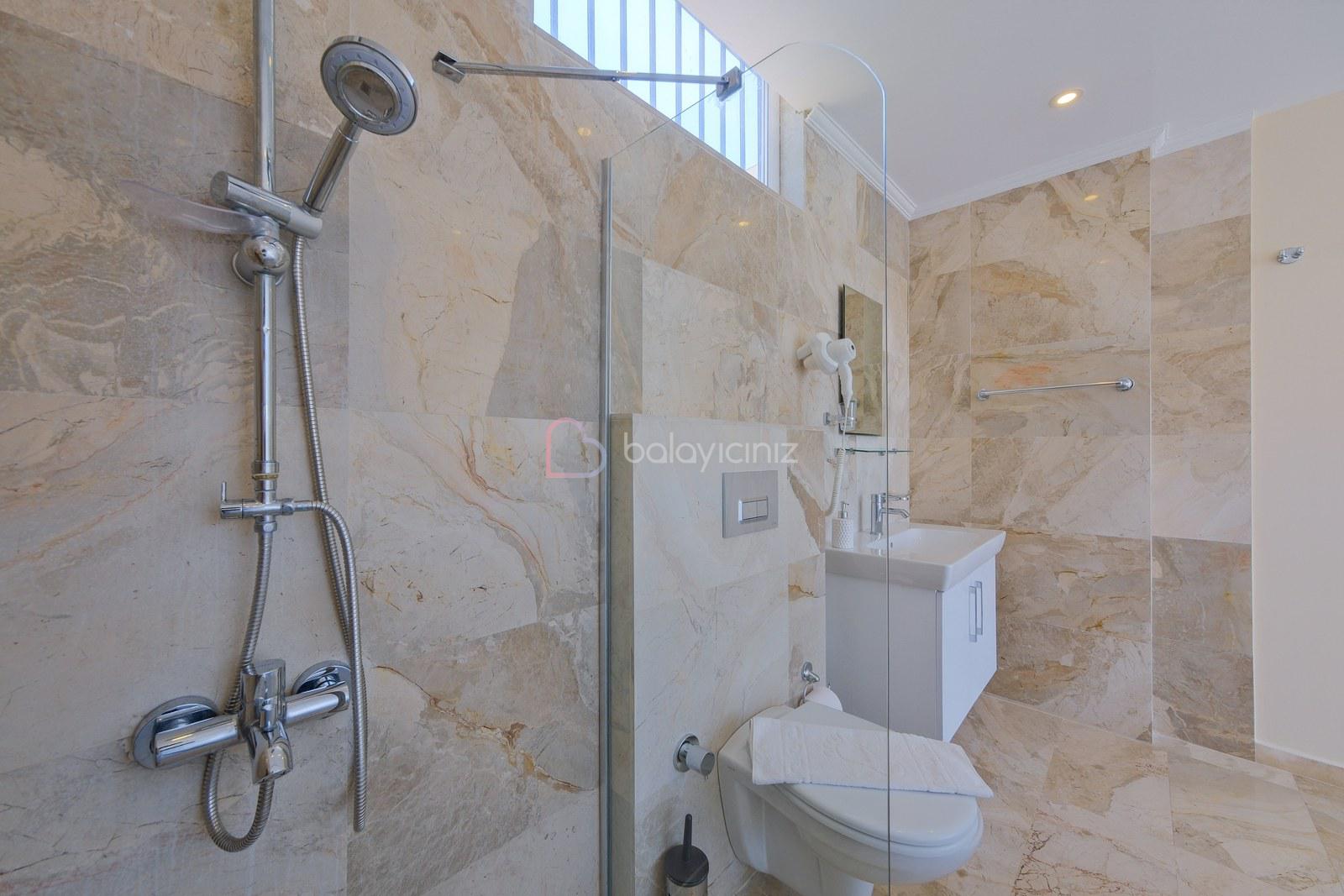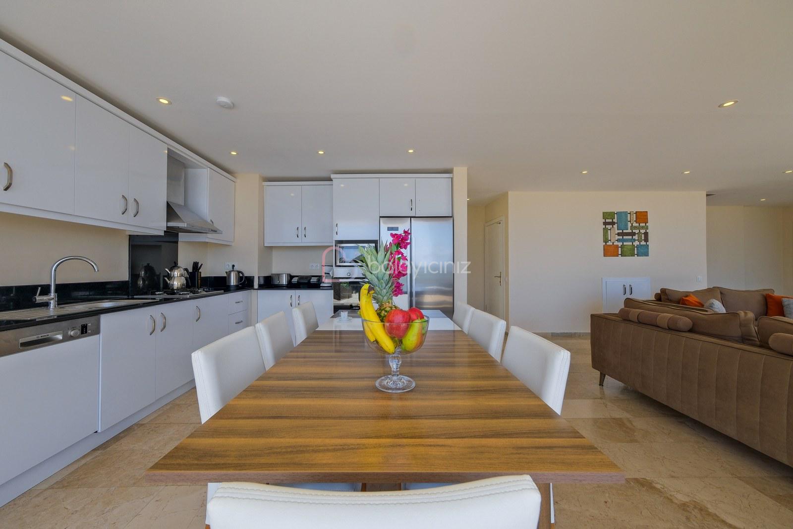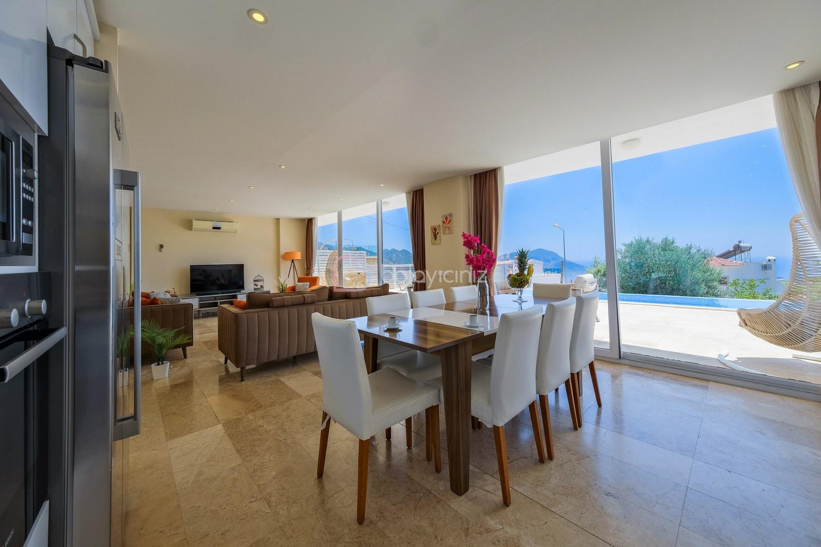Deniz manzaralı salonunda oturma grubu, plazma TV, uydu alıcısı, elektrikli süpürge, ütü ve ütü masası, sehpa, klima ve havuz terasına çıkış bulunmaktadır.