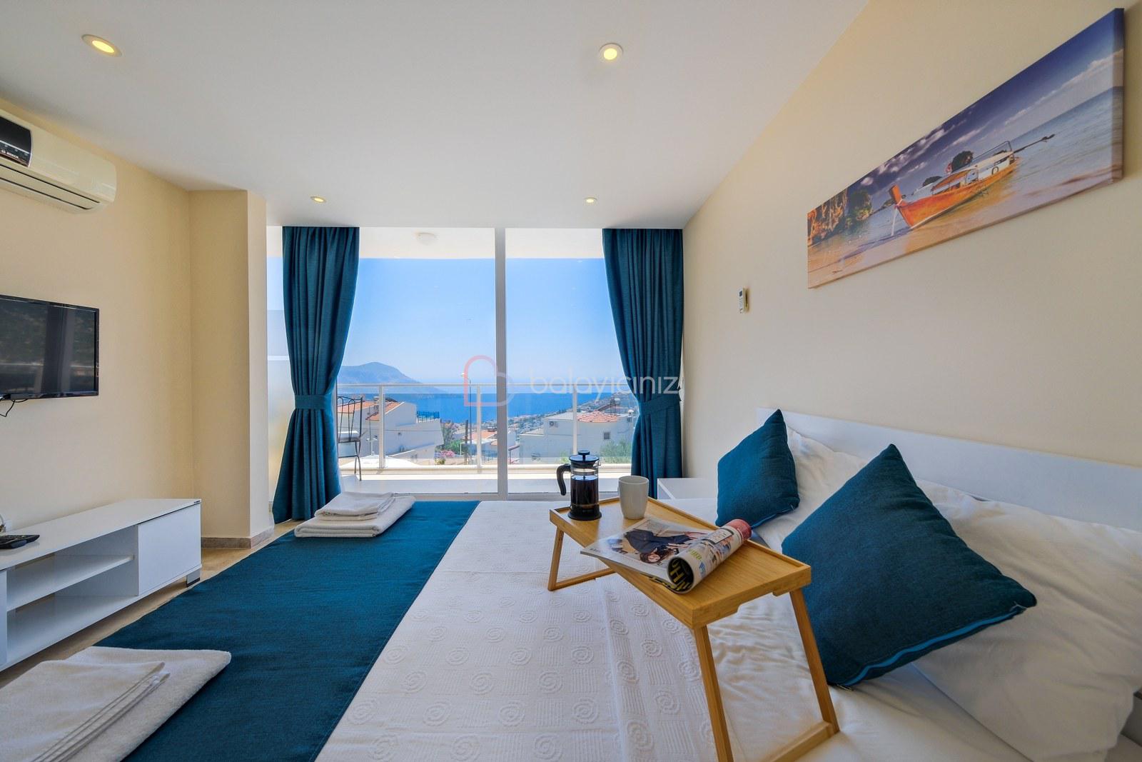 Yatak odası 1: Deniz manzaralı süit odada çift kişilik yatak, televizyon, klima, komodin, makyaj masası, elbise dolabı, banyo ve tuvalet bulunmaktadır.
