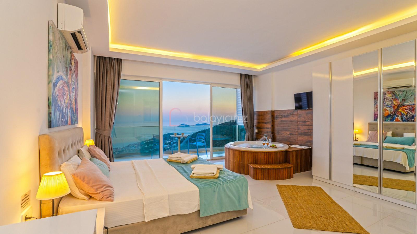 1.Yatak odasi (aile): 1 çift kisilik yatak, jakuzi, banyo, tuvalet, elbise dolabi, klima, komidin bulunmaktadir.