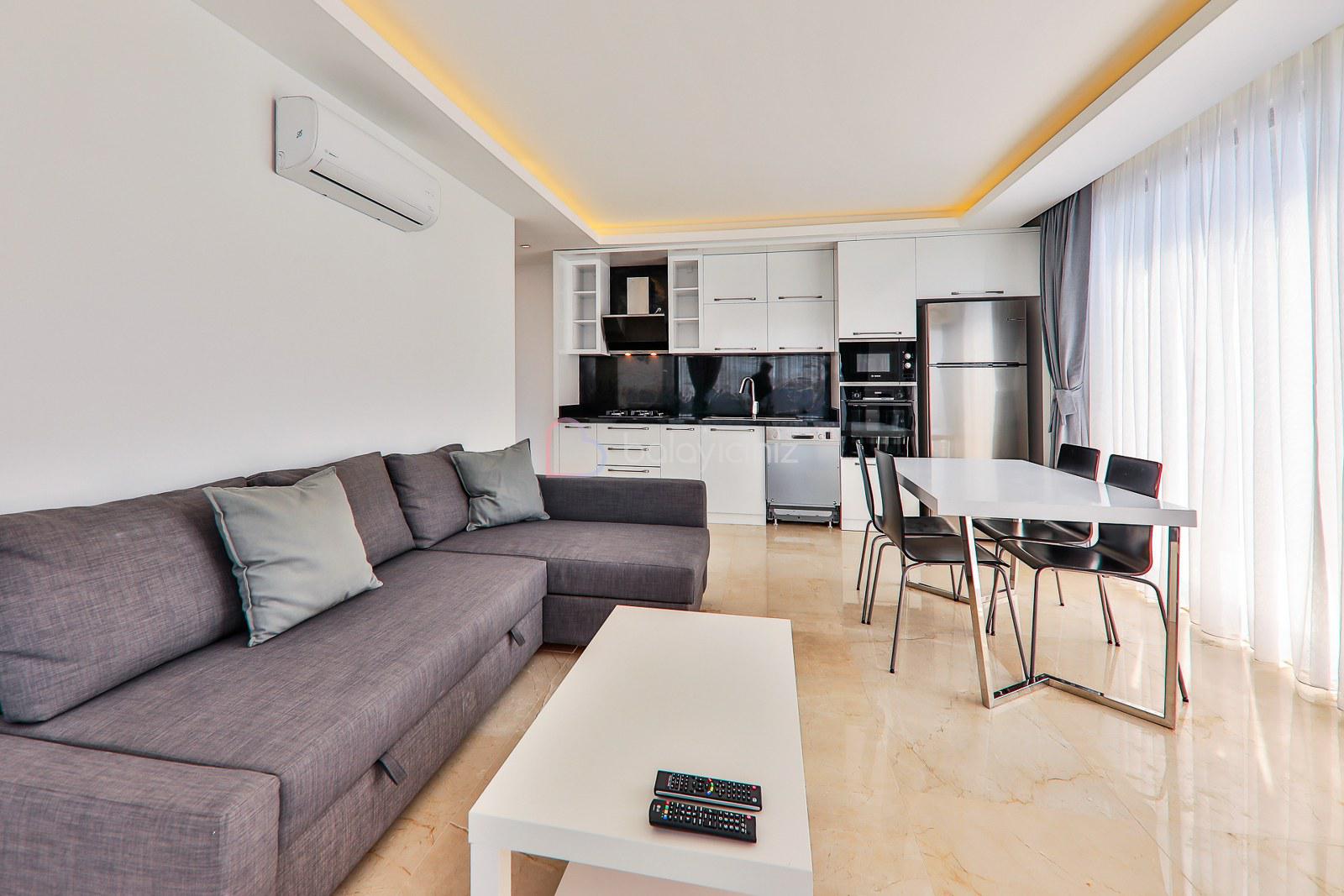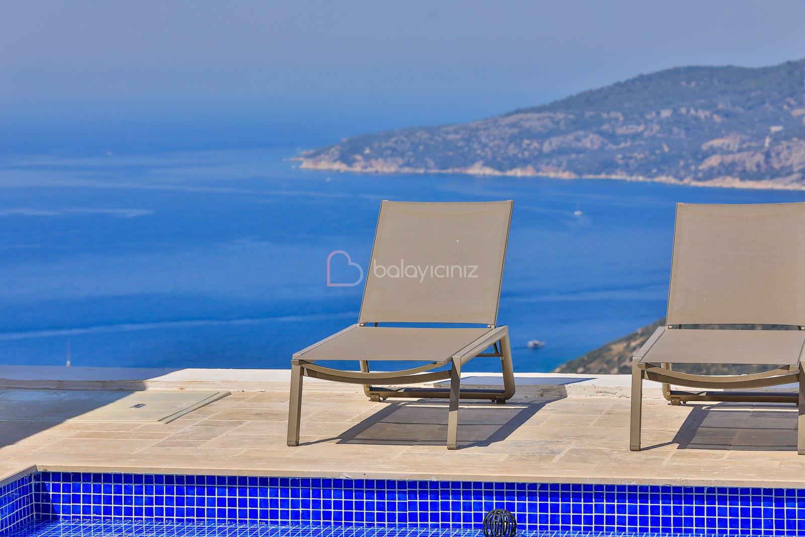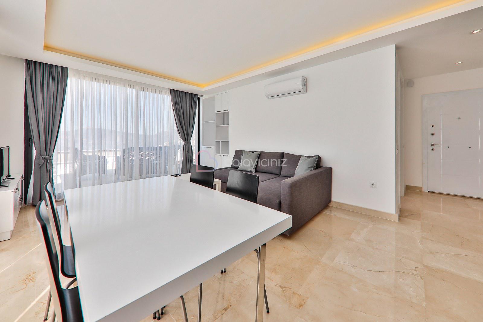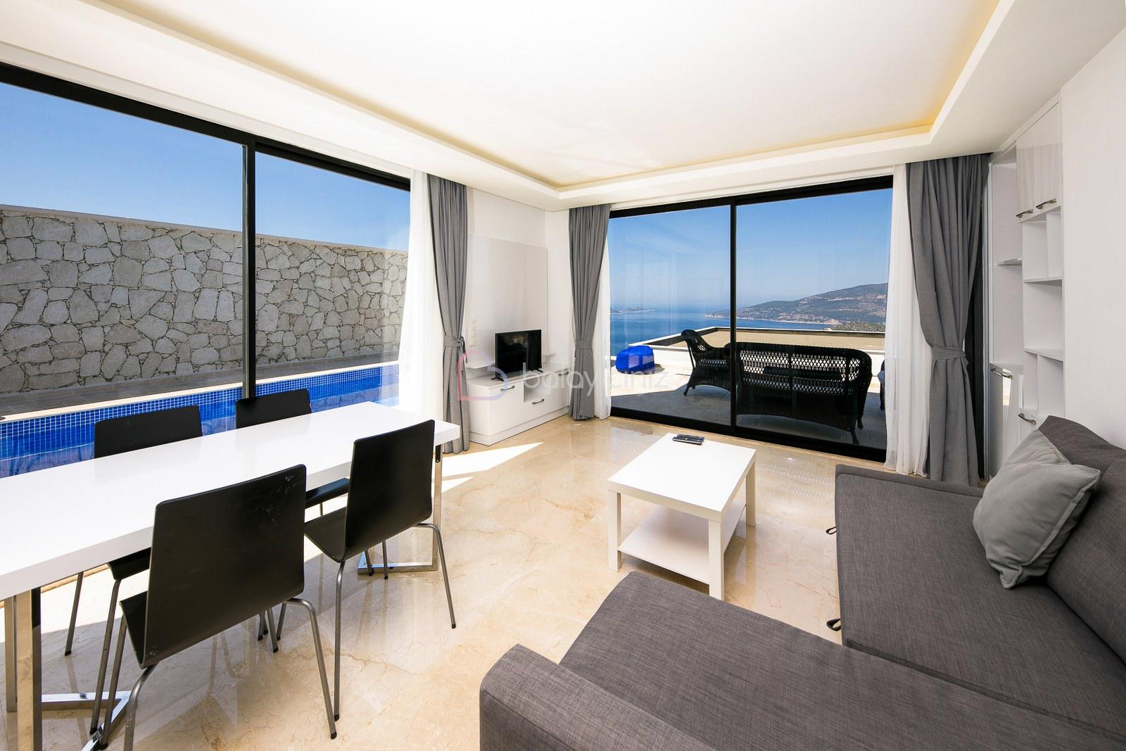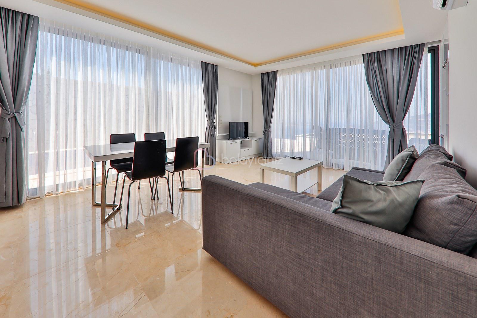Deniz manzaralı salonunda oturma grubu, LCD TV, uydu alıcısı, DVD player, ütü ve ütü masası, yemek masası, klima, sehpa ve havuz başına çıkış bulunmaktadır.