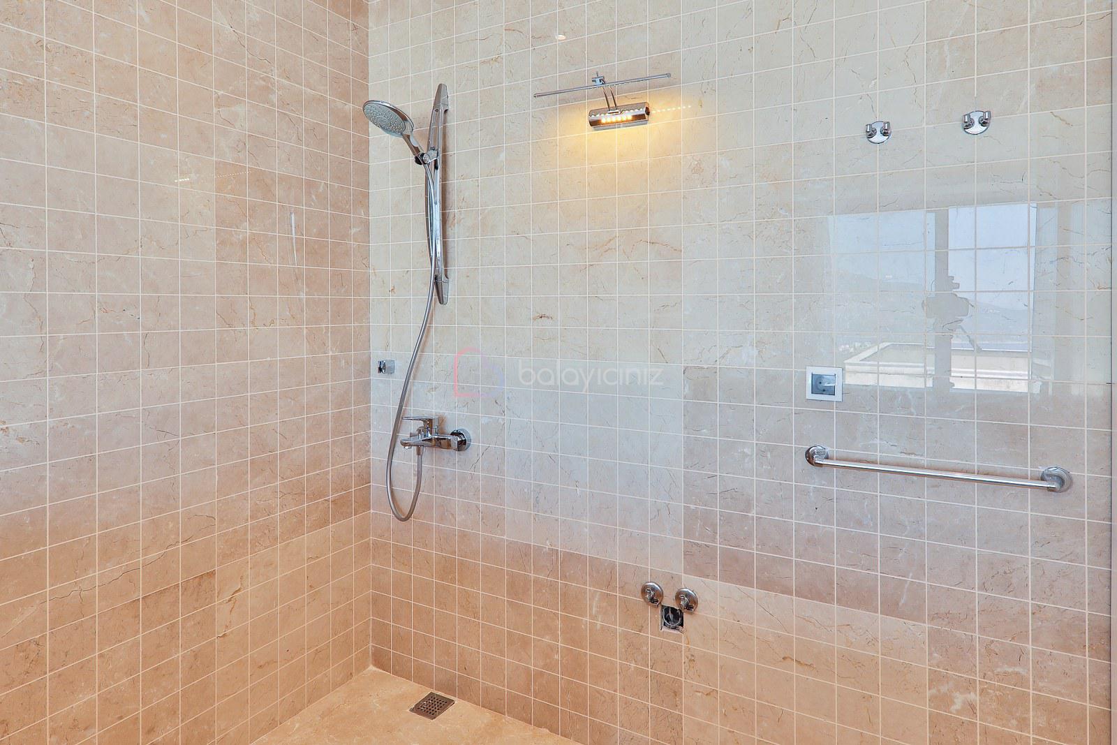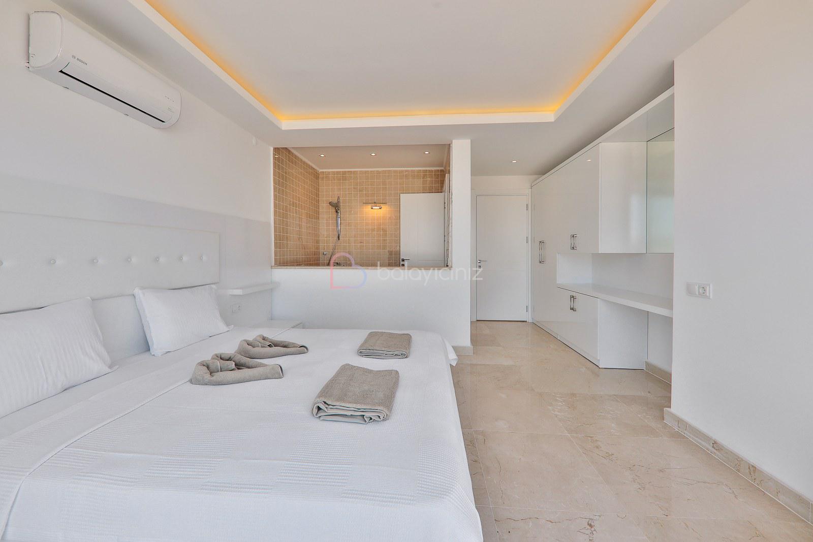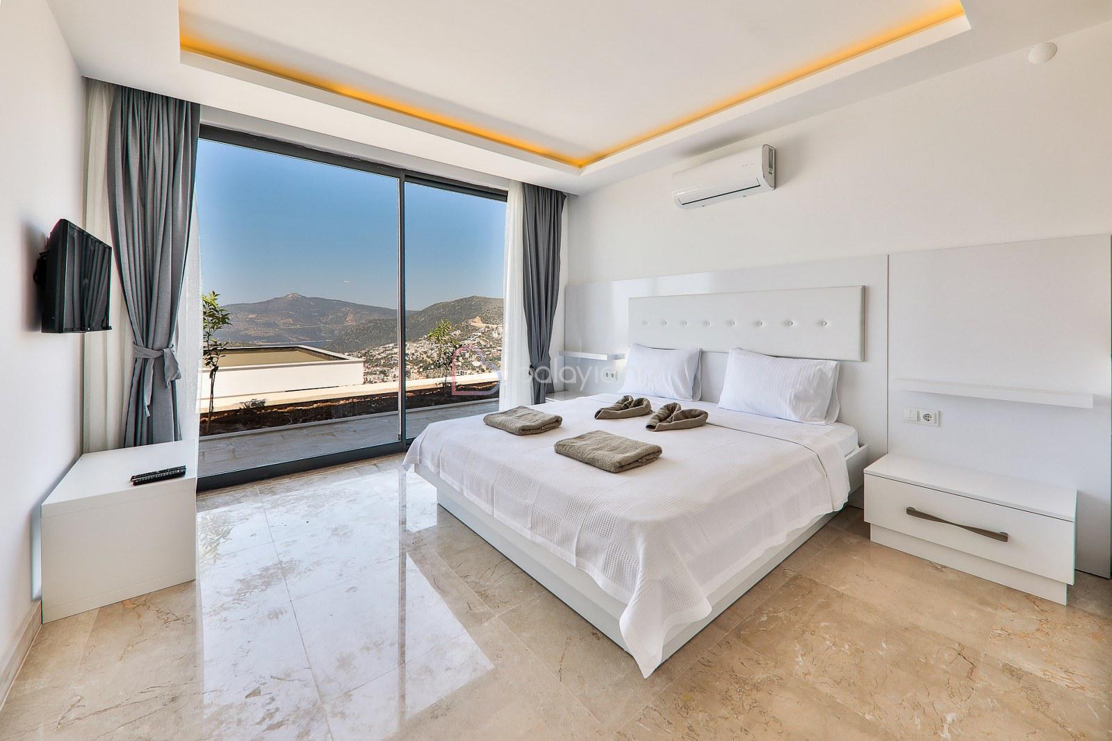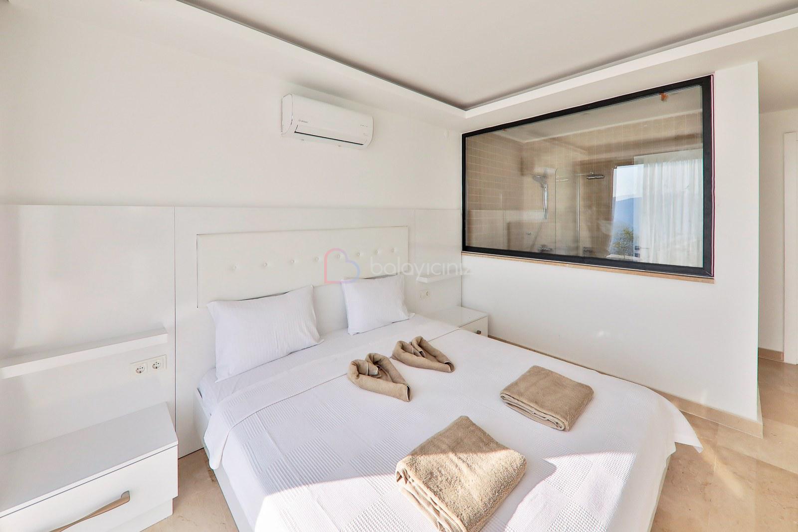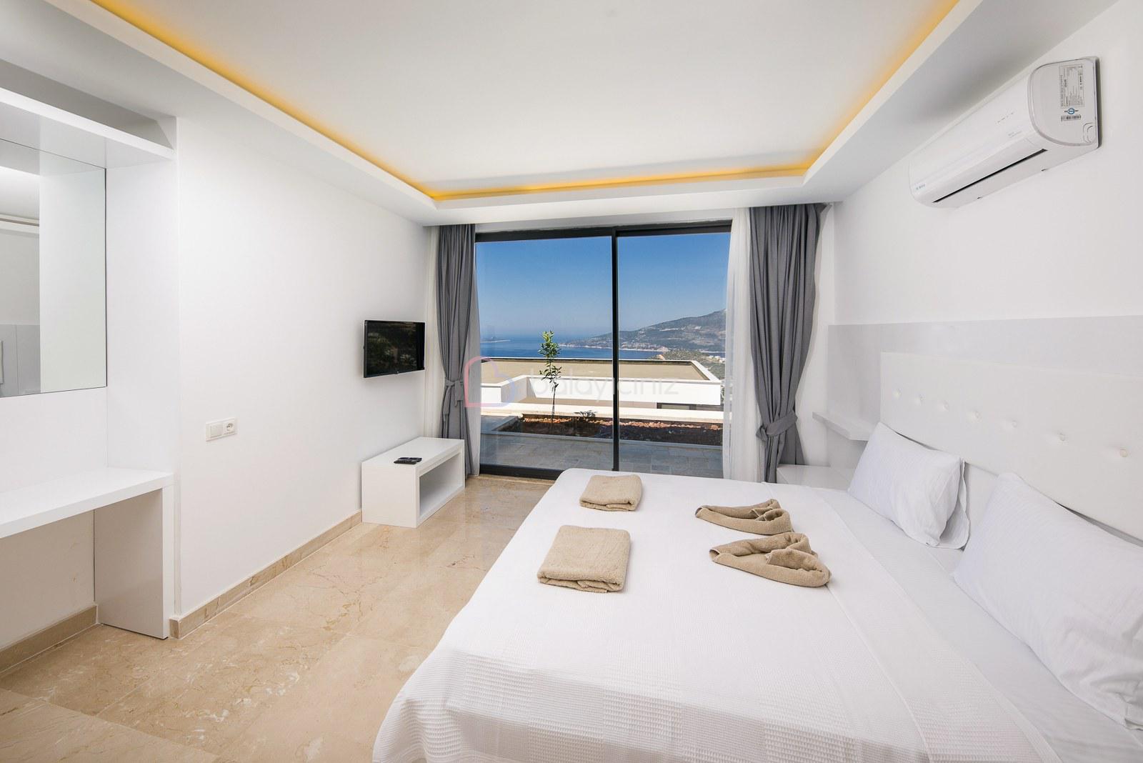 Yatak Odası 1: Deniz manzaralı odada çift kişilik yatak, klima, elbise dolabı, makyaj masası, komodin, TV ebeveyn banyosu bulunmaktadır.