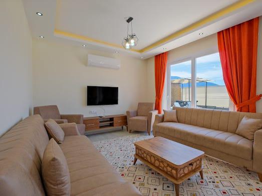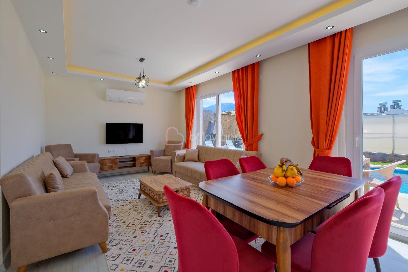 Salonda modern oturma grubu, televizyon, kablosuz internet, klima, havuz terasına çıkış bulunmaktadır.