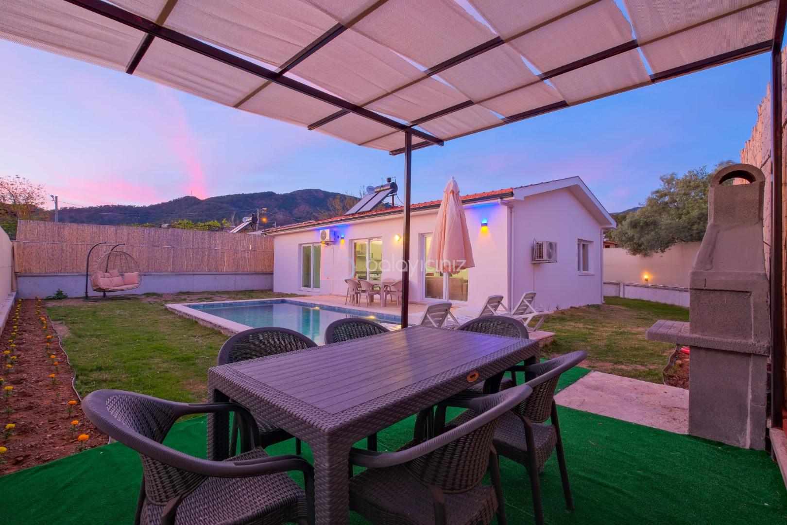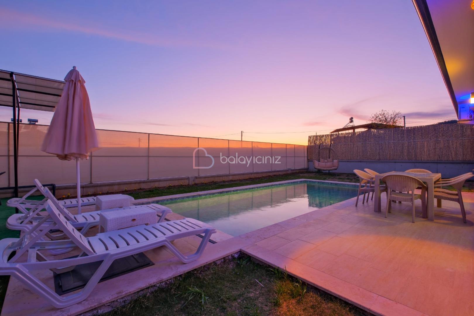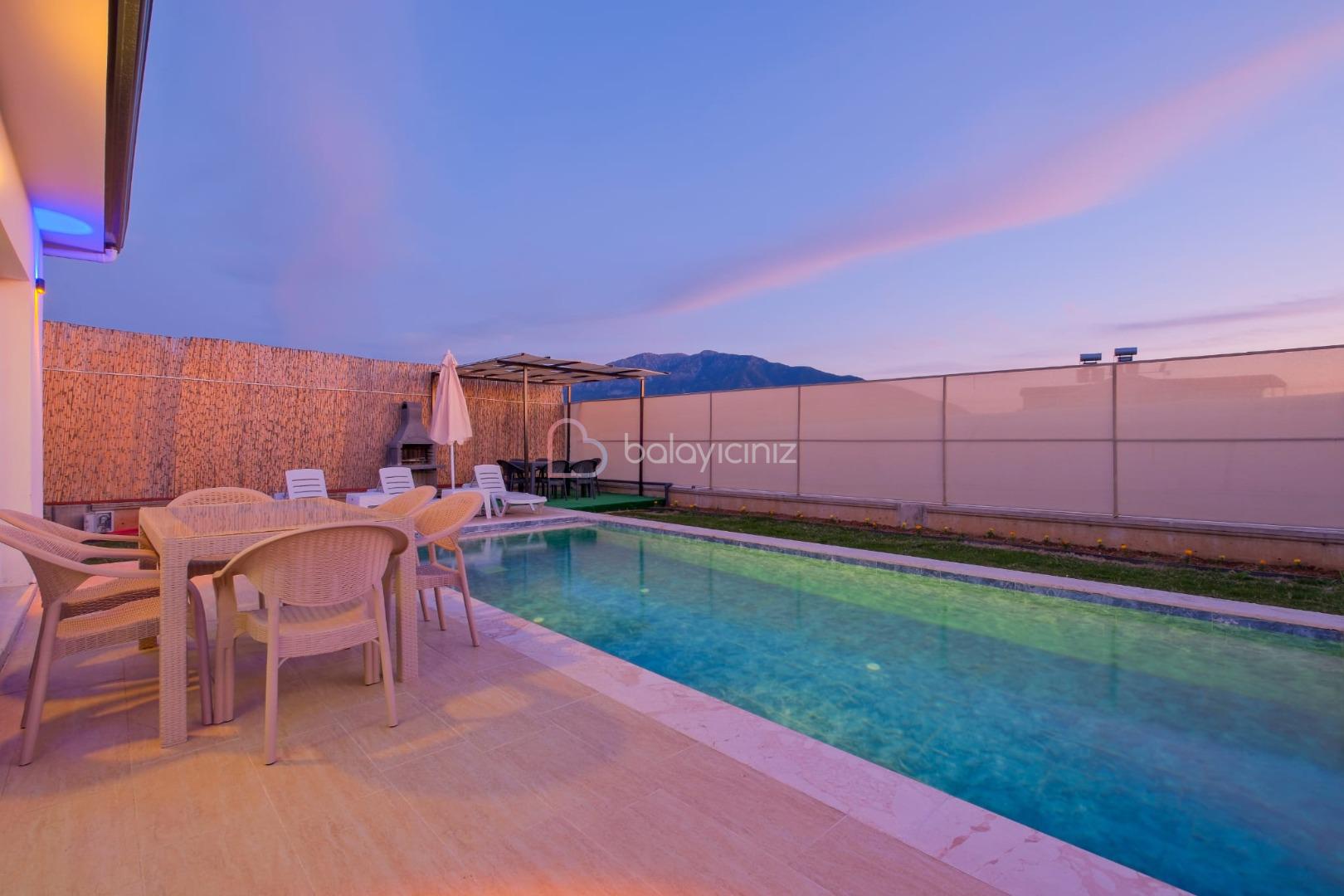 Havuz terası içerisinde şezlong, barbekü, salıncak, yemek masası, bulunmaktadır.