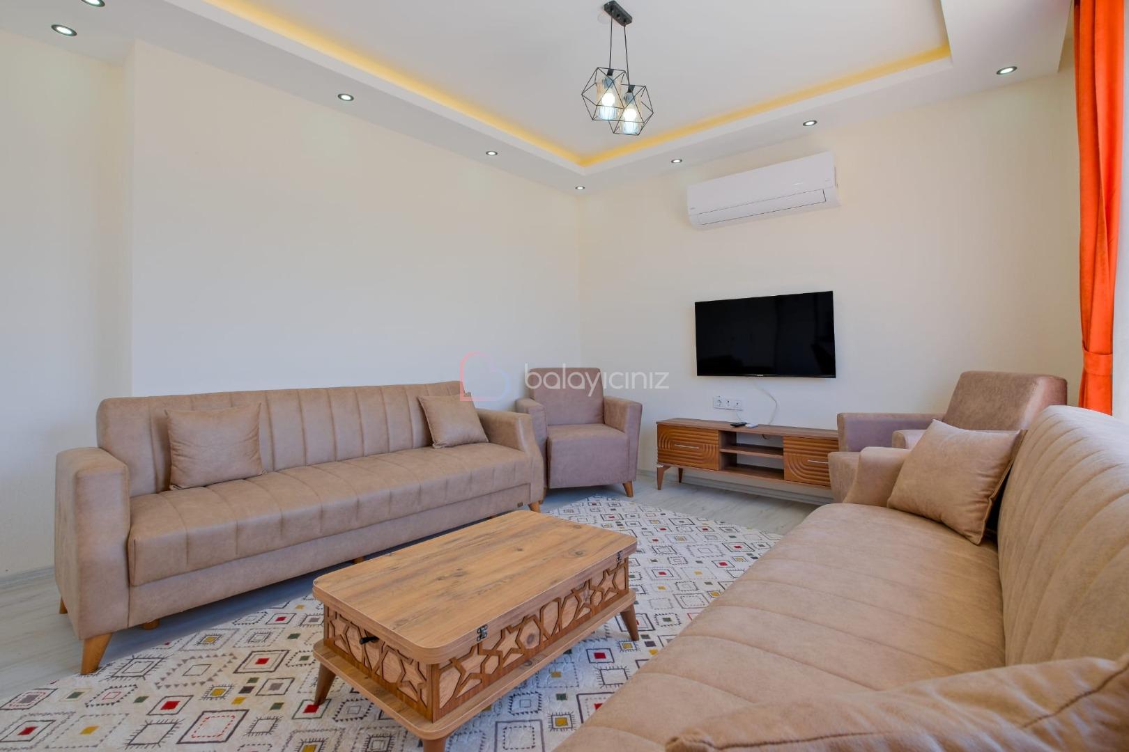 Salonda modern oturma grubu, televizyon, kablosuz internet, klima, havuz terasına çıkış bulunmaktadır.