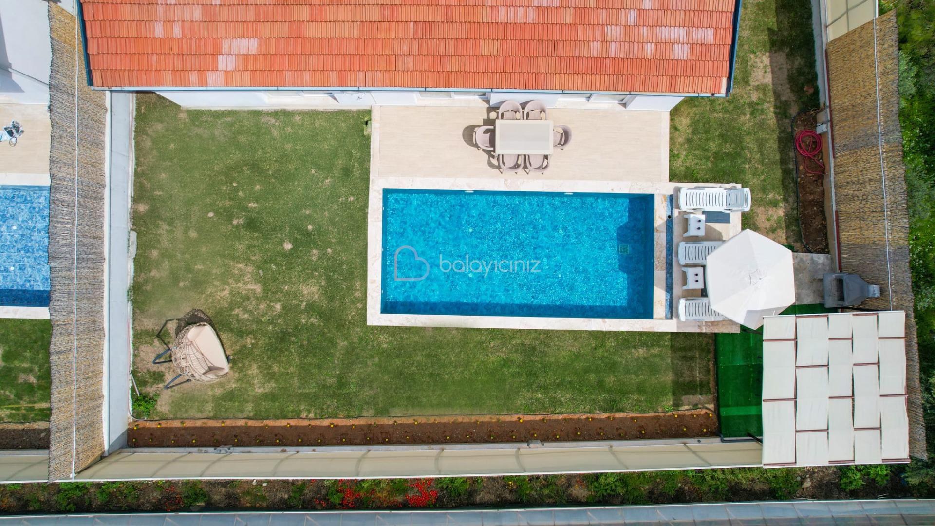 Havuz terası içerisinde şezlong, barbekü, salıncak, yemek masası, bulunmaktadır.