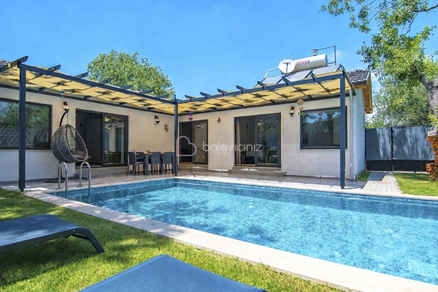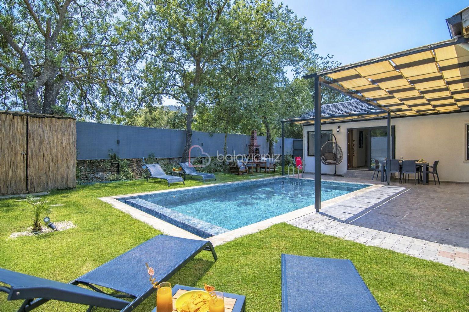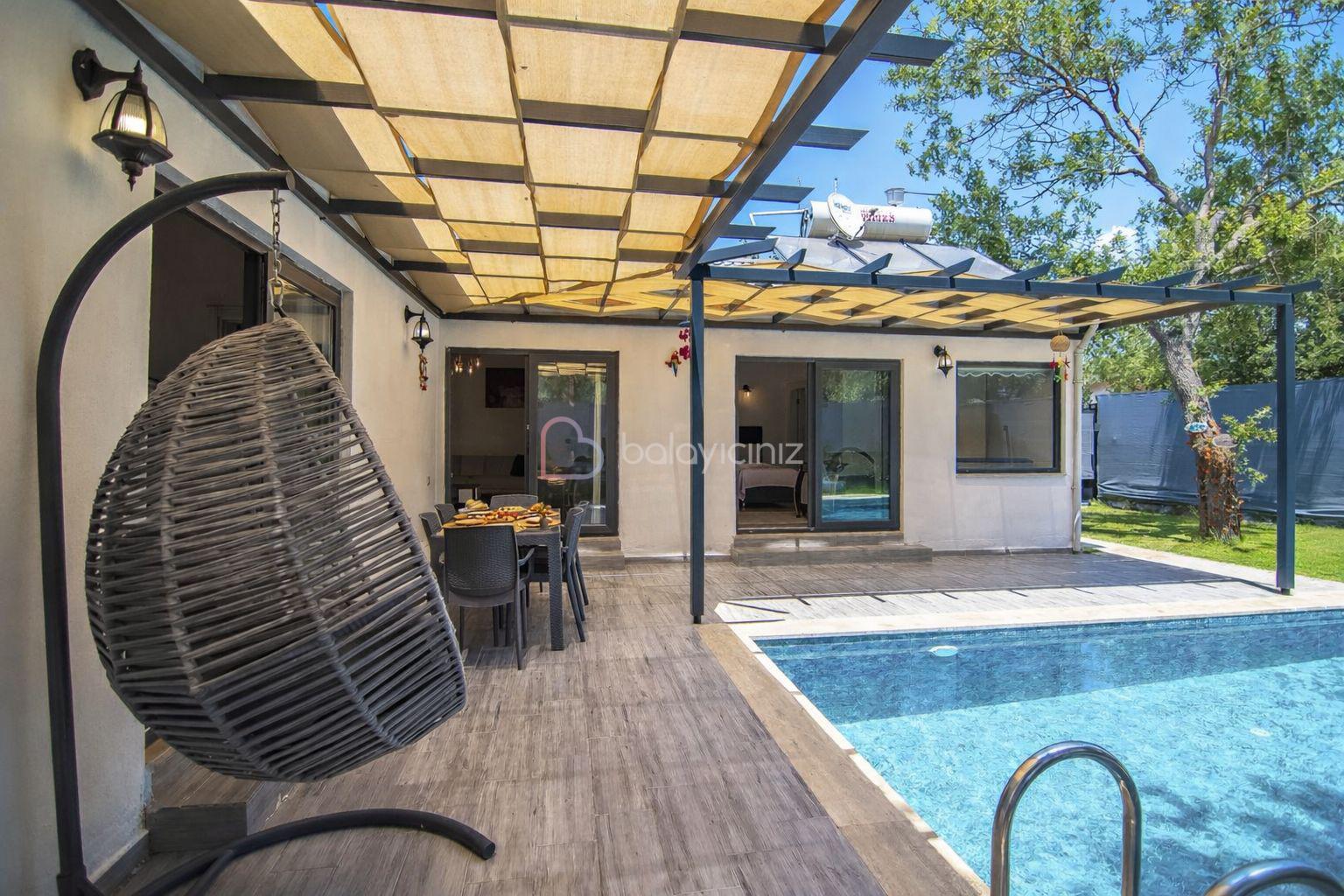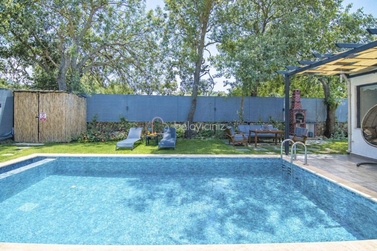 Özel yüzme havuzu, şezlong, barbekü alanı, yemek masası, oturma alanı, salıncak, bulunmaktadır.