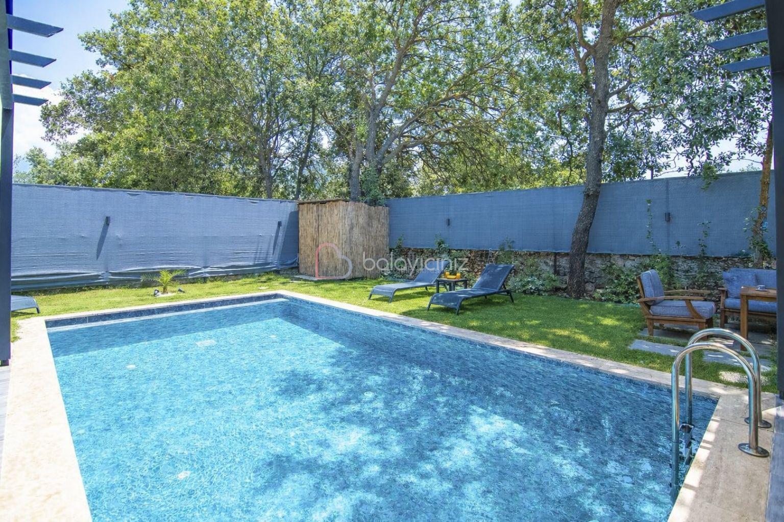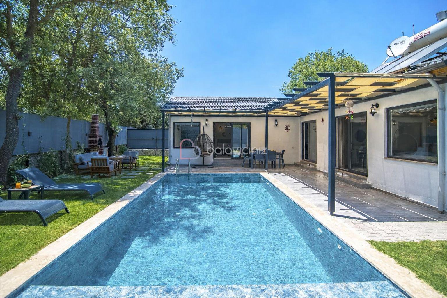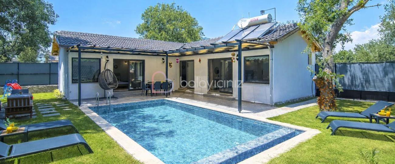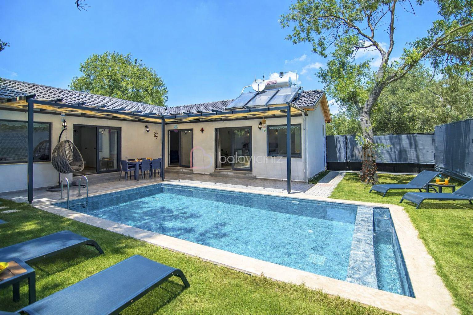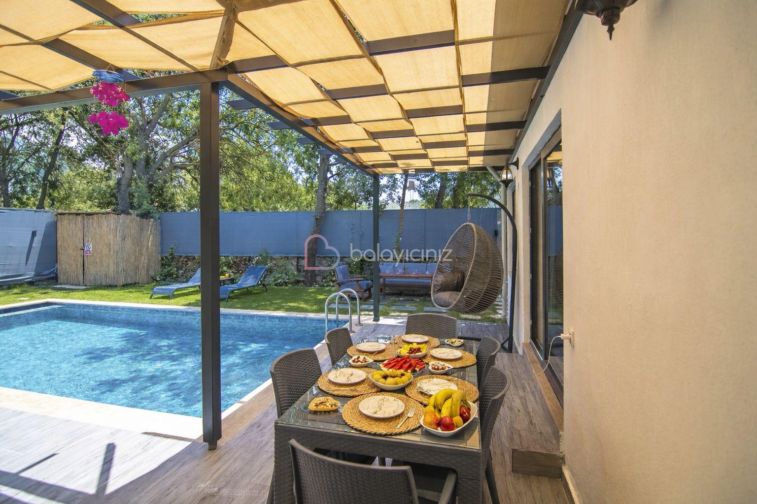 Özel yüzme havuzu, şezlong, barbekü alanı, yemek masası, oturma alanı, salıncak, bulunmaktadır.