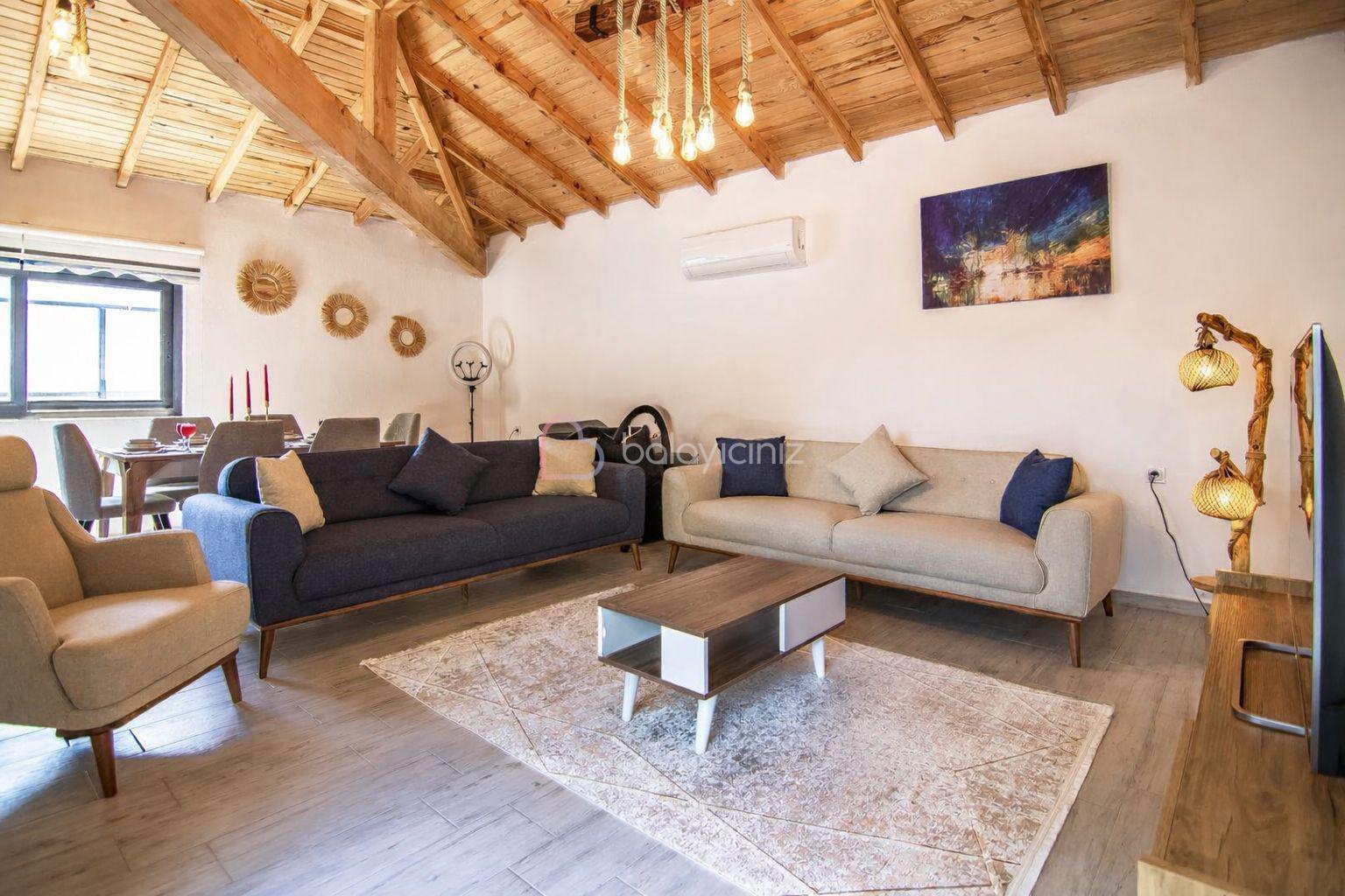 Oturma grubu, televizyon, orta sehpa, yemek masası, klima, havuz terasına çıkış bulunmaktadır.