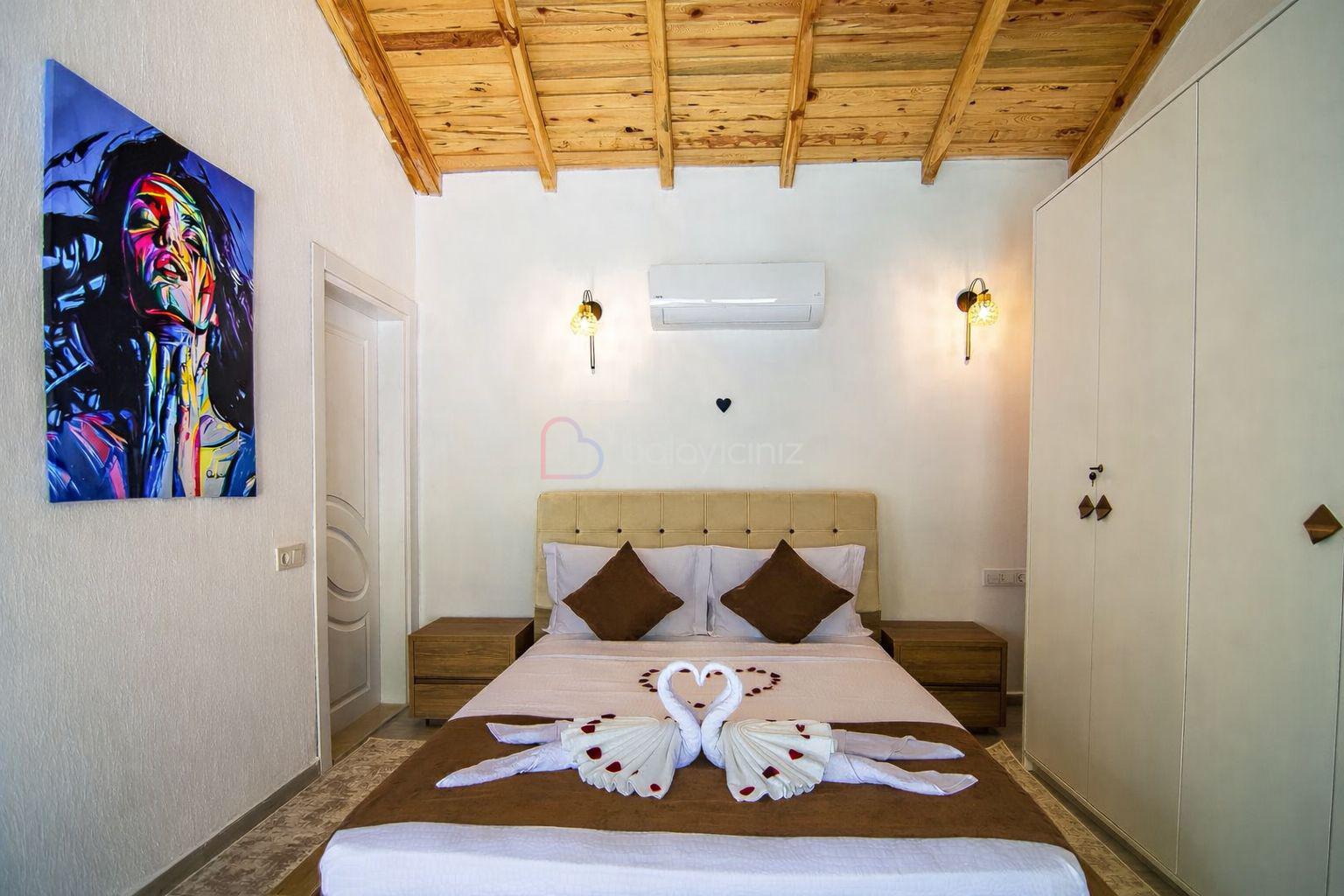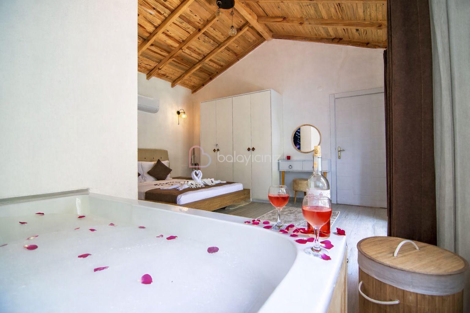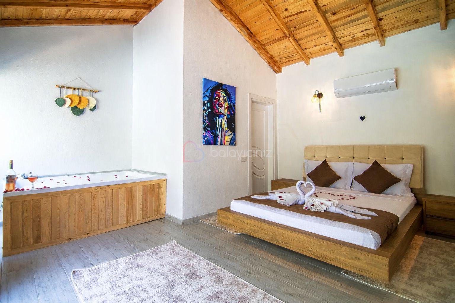 1.Yatak Odası: 1 adet çift kişilik yatak, makyaj masası, elbise dolabı, klima, jakuzi, banyo ve tuvalet bulunmaktadır.