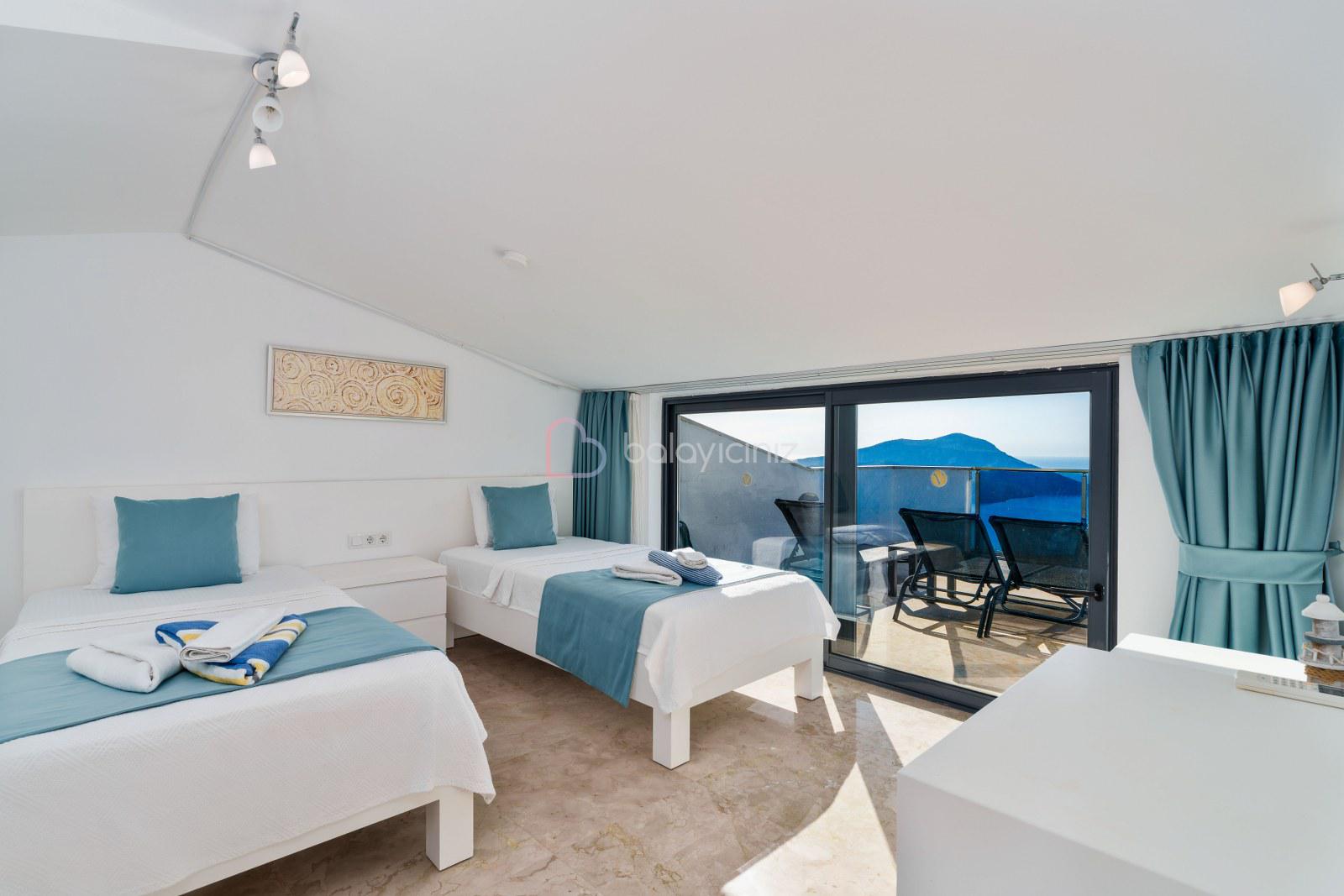 4.Yatak Odası: Süit Yatak Odası, Deniz manzaralı (Teras Katta) 2 Adet tek kişilik yatak, Komodin, Makyaj masası, Klima, Elbise dolabı, Banyo(ortak), Terasa çıkış bulunmaktadır.