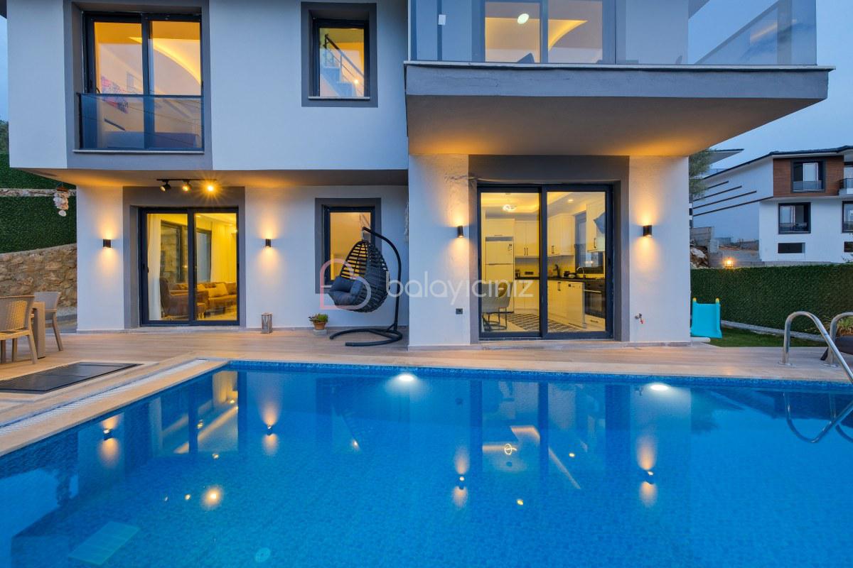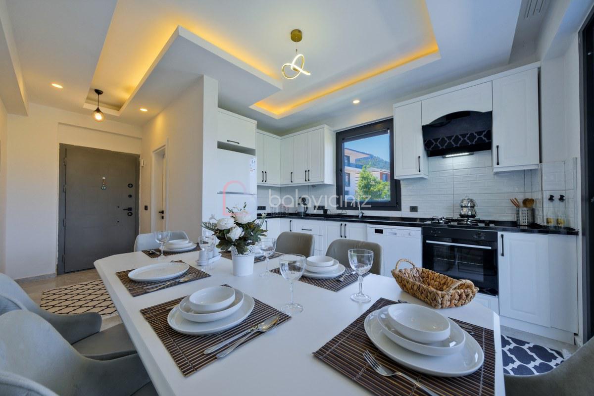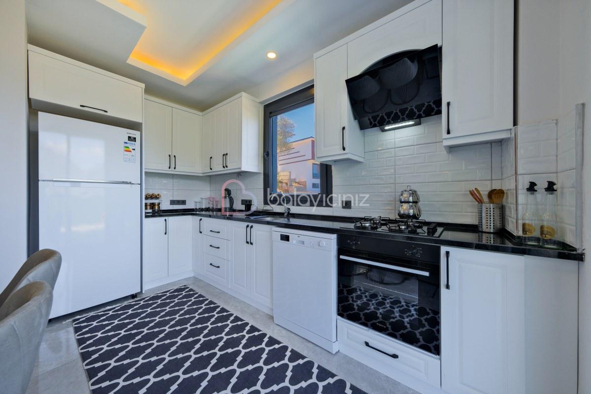 Buzdolabı, fırın, mikrodalga, çamaşır makinesi, bulaşık makinesi, 4’lü ocak, elektrikli su ısıtıcısı (kettle), elektrikli süpürge, 8 kişilik yemek takımı, tava, tencereler, çatal ve bıçak takımı ve diğer mutfak malzemesi mevcuttur. Havuz terasına çıkış bulunmaktadir.