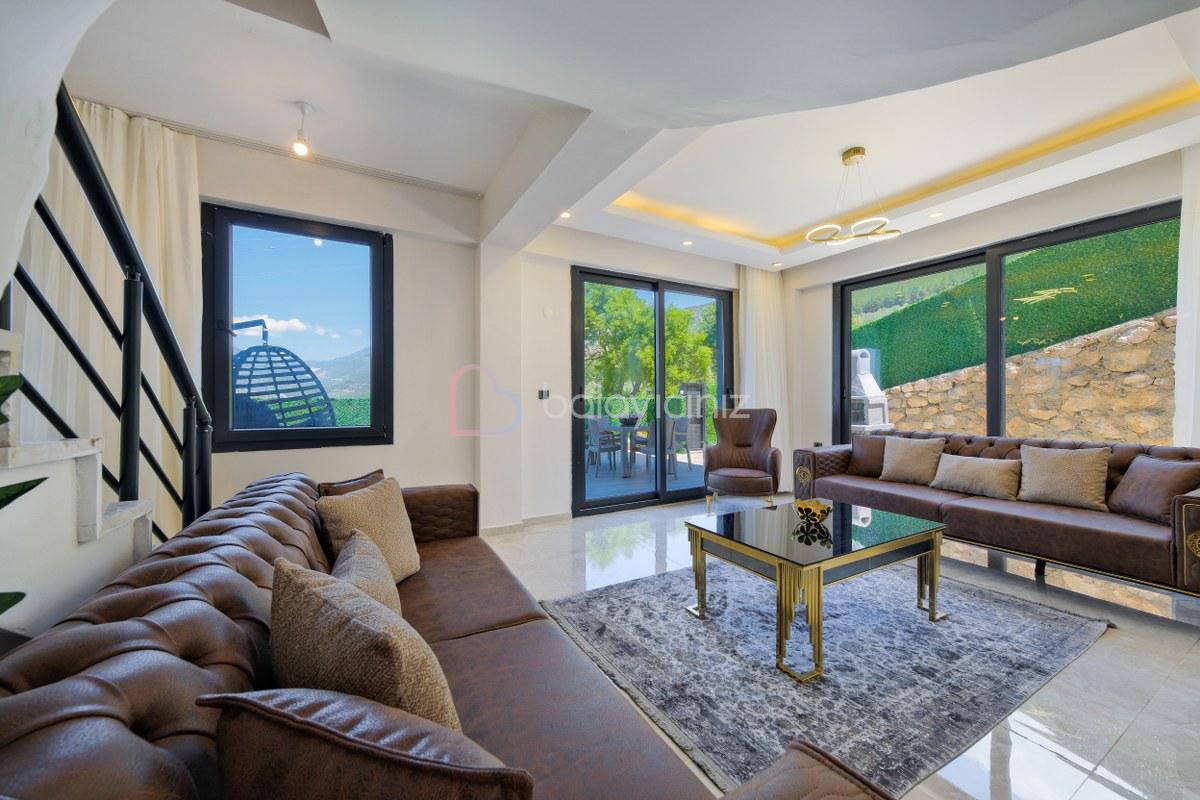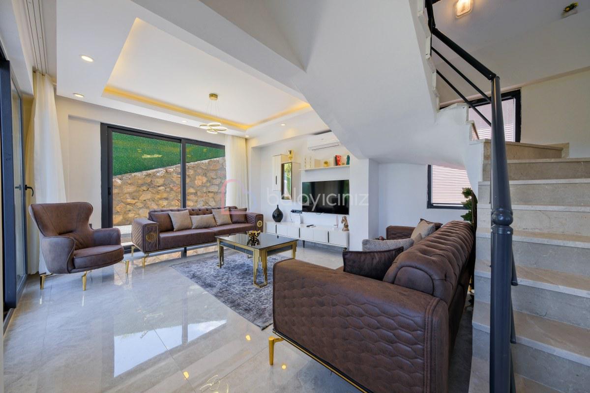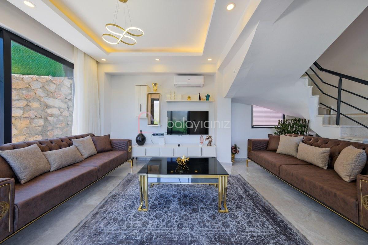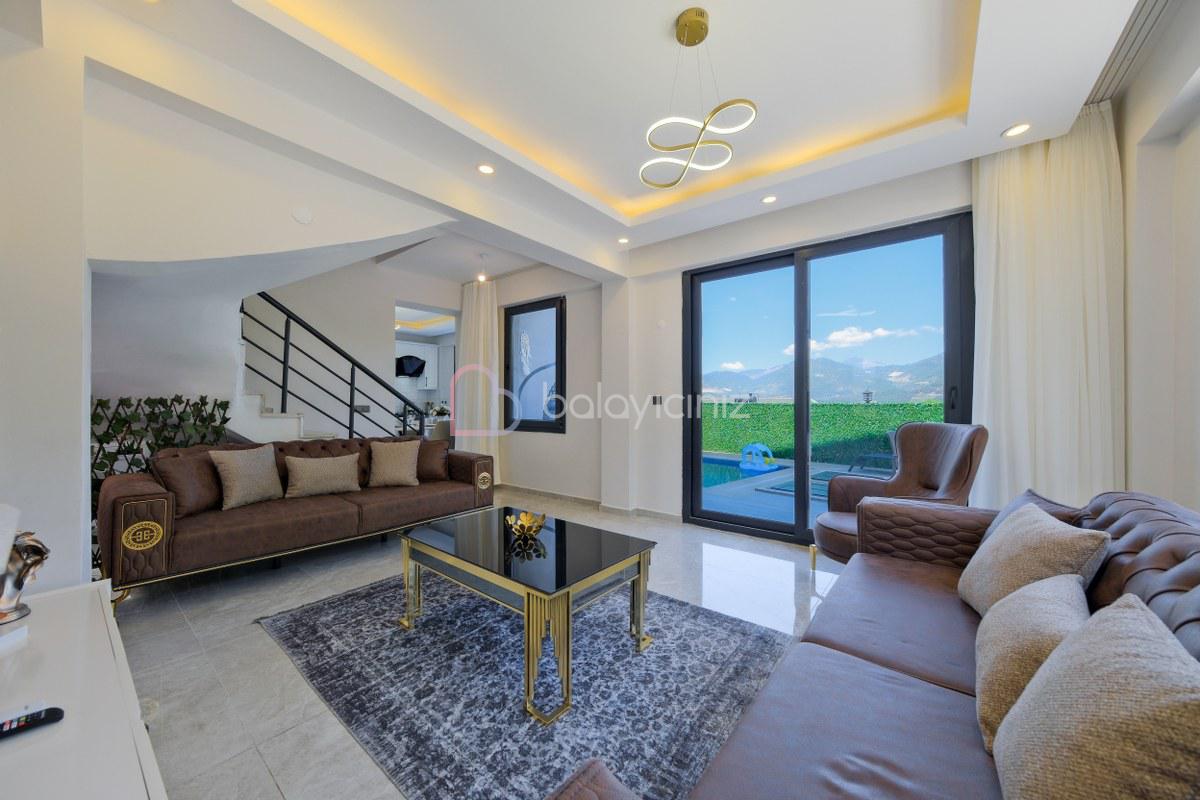 Salon içerisinde konforlu oturma grubu, sehpa, televizyon, uydu alıcı, klima. Salondan havuz terasına çıkış bulunmaktadir.