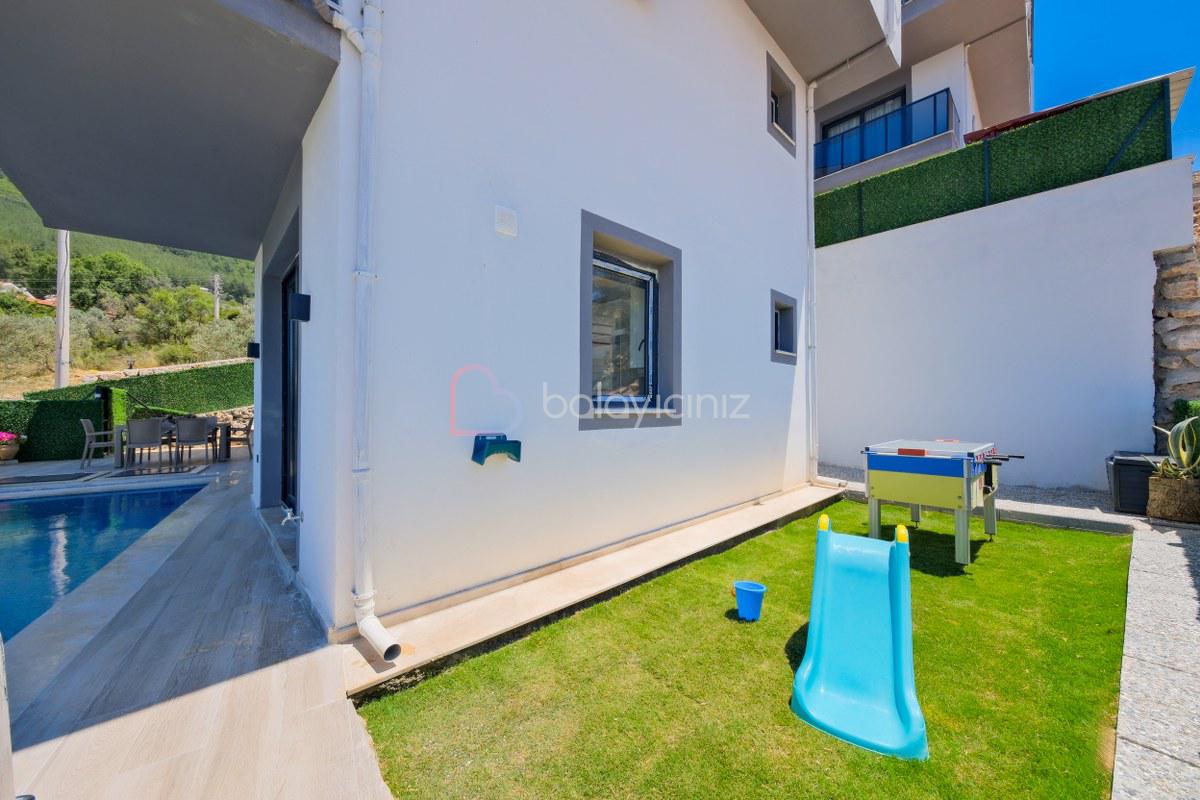 Şezlonglar, güneş şemsiyesi, mangal, yemek masası, salıncak, langırt, çocuk oyun alanı ve sandalyeler bulunmaktadir.