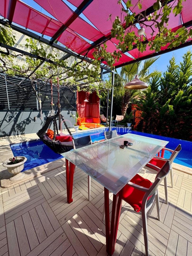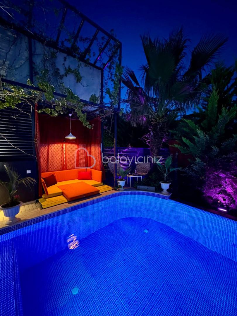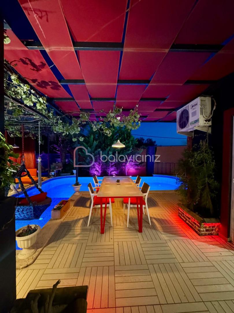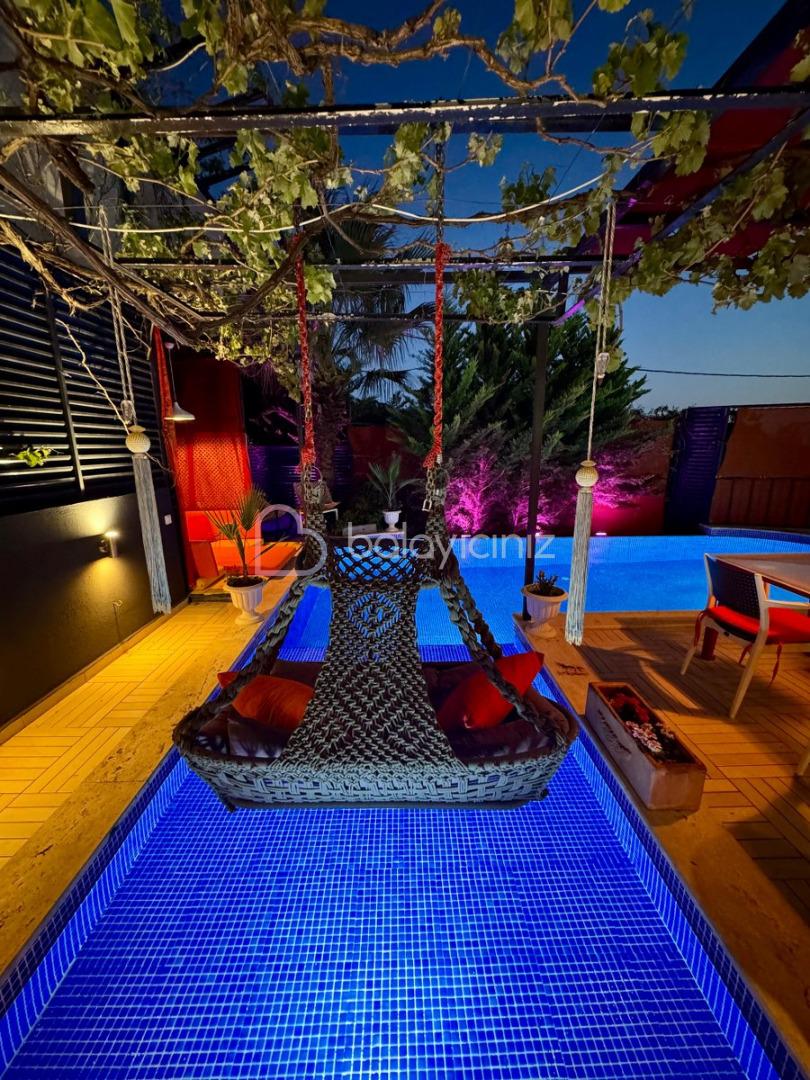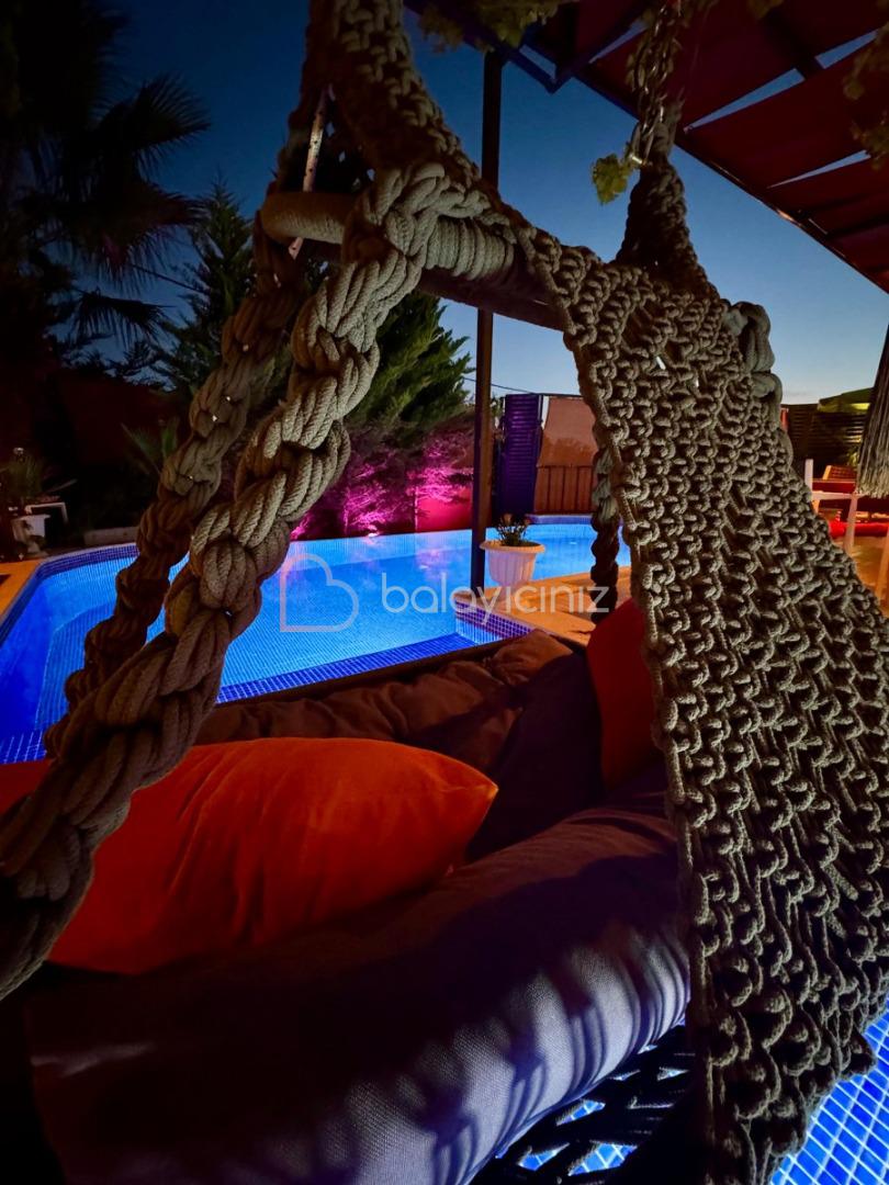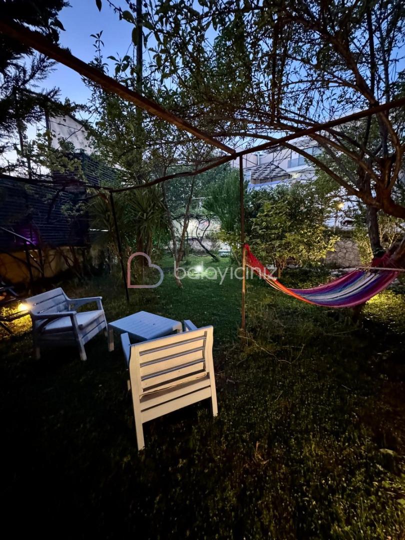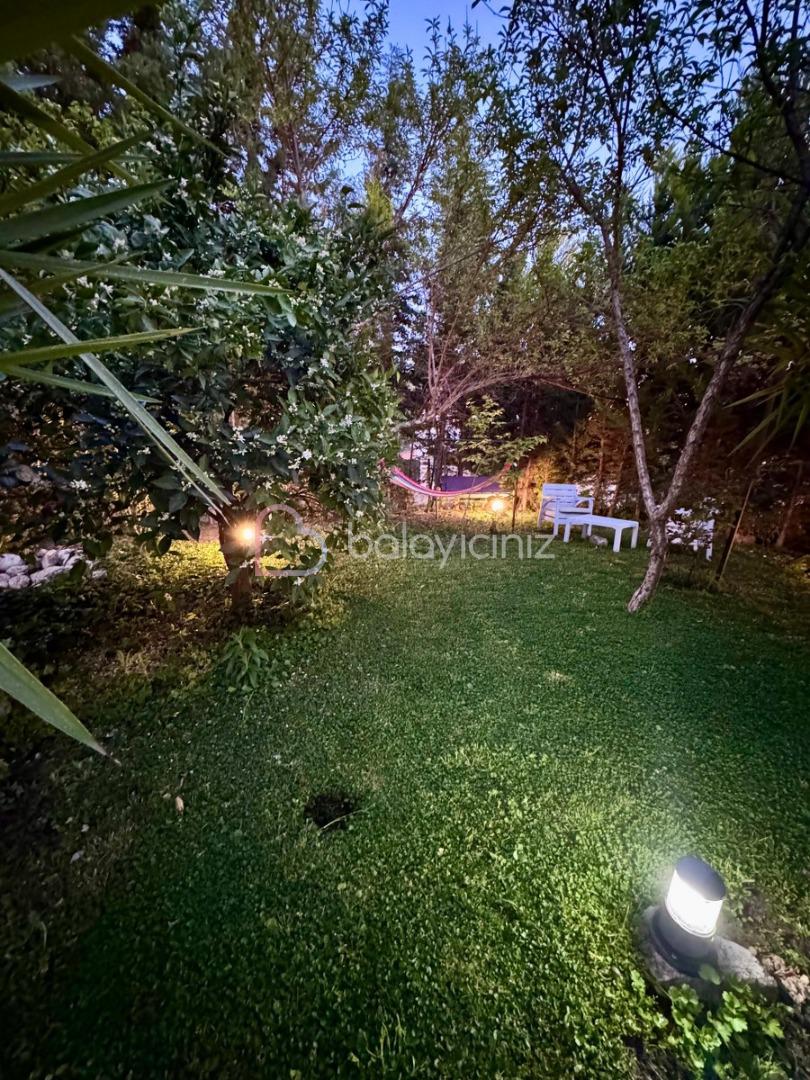 Bahçe içerisinde güneşlenme terası, özel yüzme havuzu, şezlonglar, güneş şemsiyesi, langırt, 4 kişilik bahçe yemek masası ve sandalyeler, salıncak ve mangal bulunmaktadır.